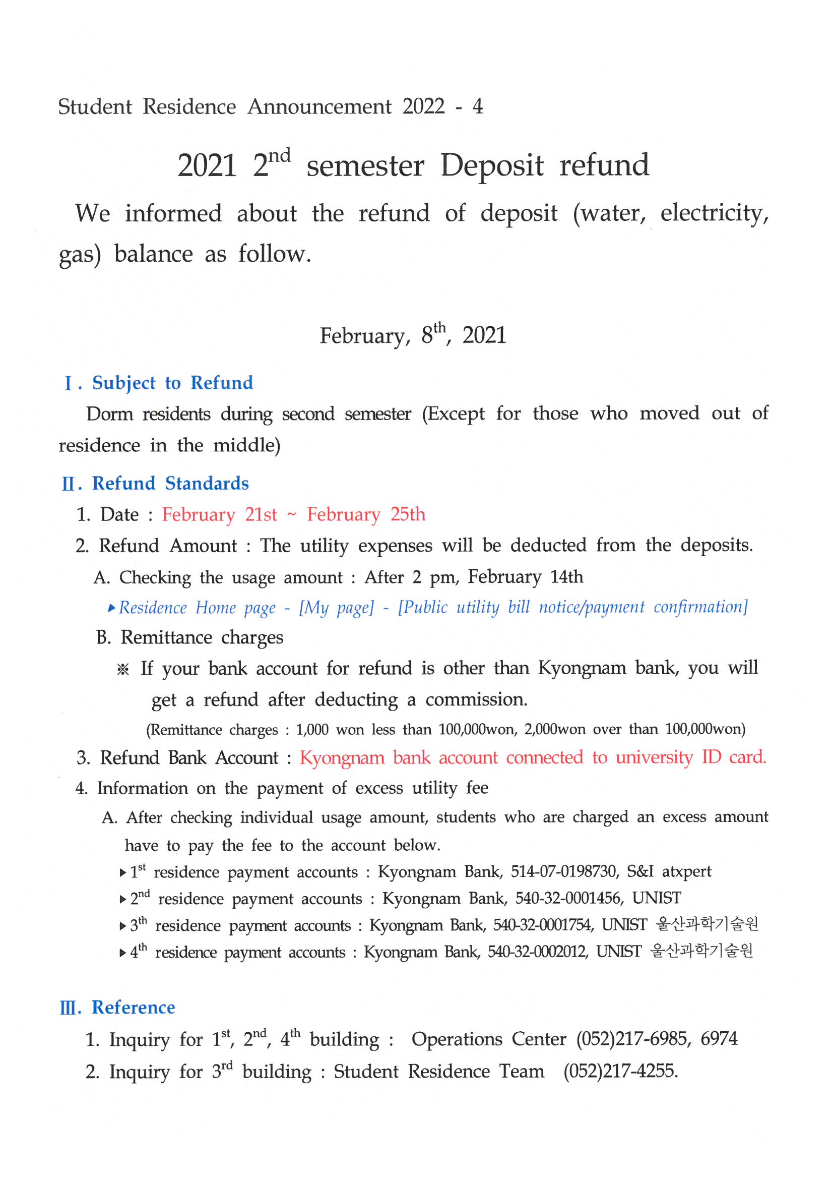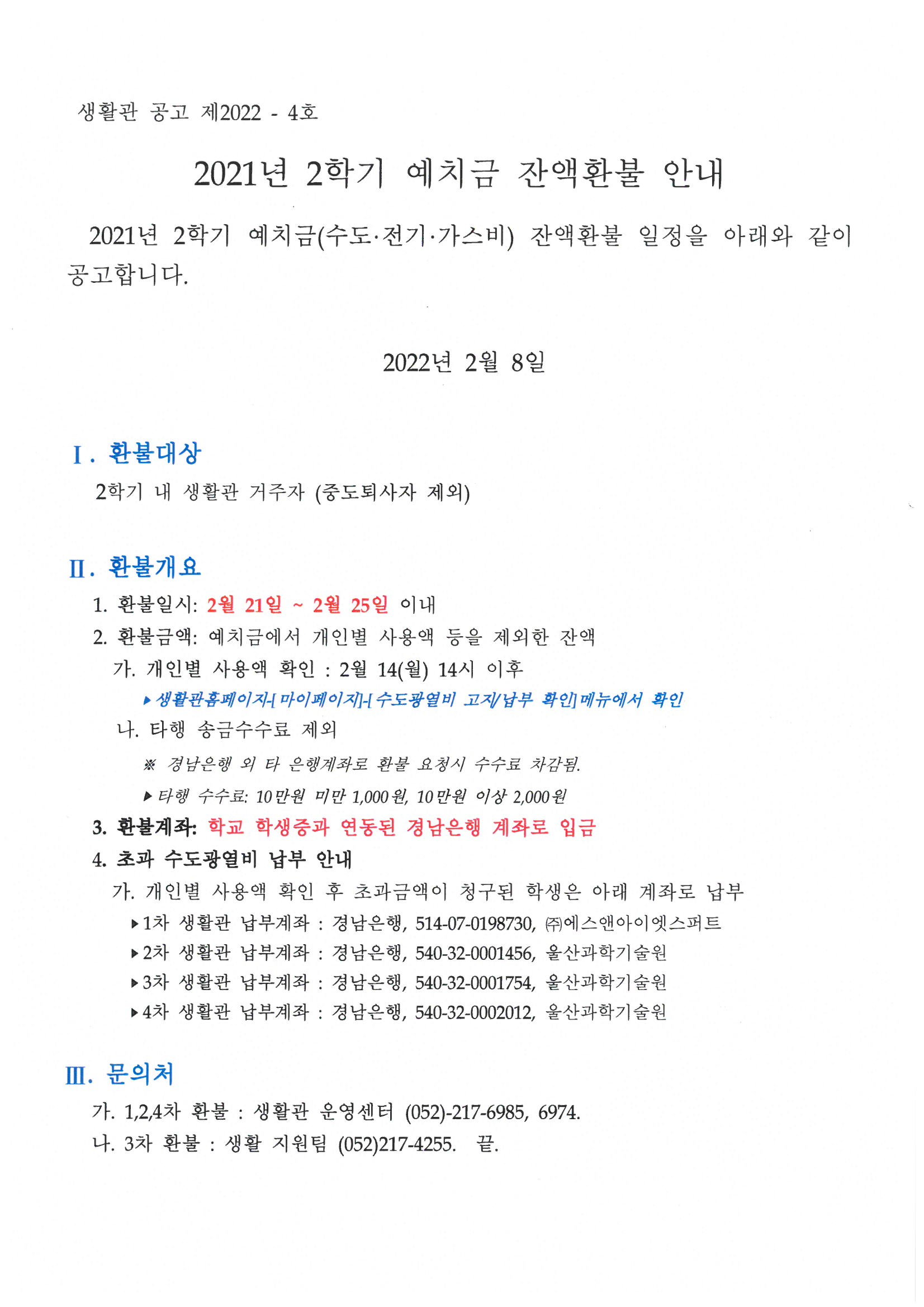 | 610 | (No.2022-4) 2021년 2학기 예치금 잔액환불 안내(2021 2nd s.. | 2022-02-08 | 3515 |