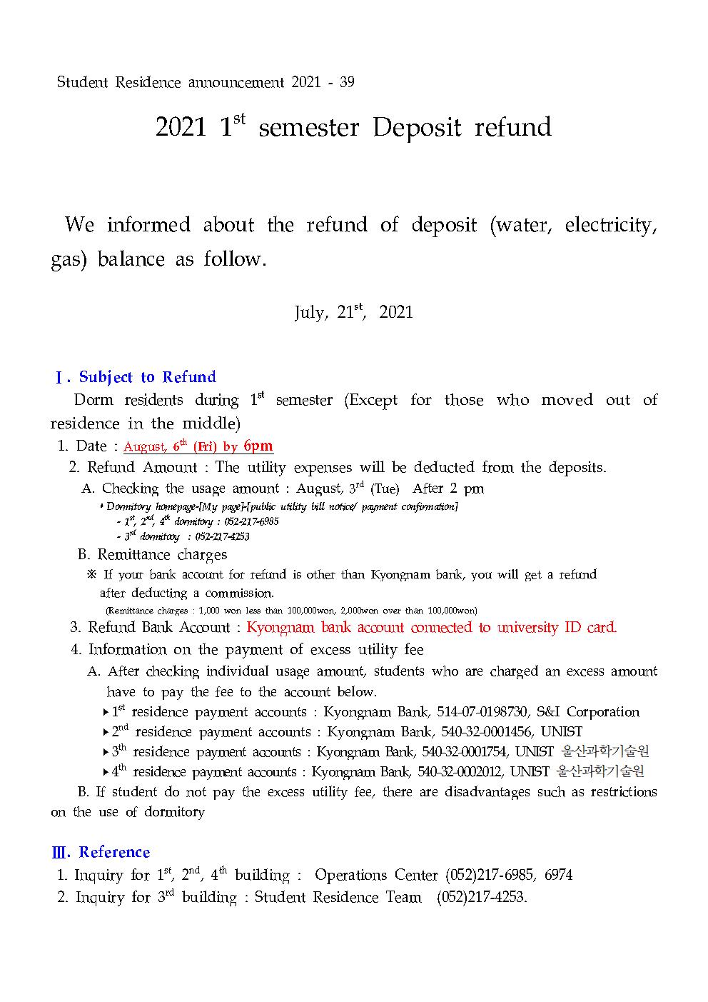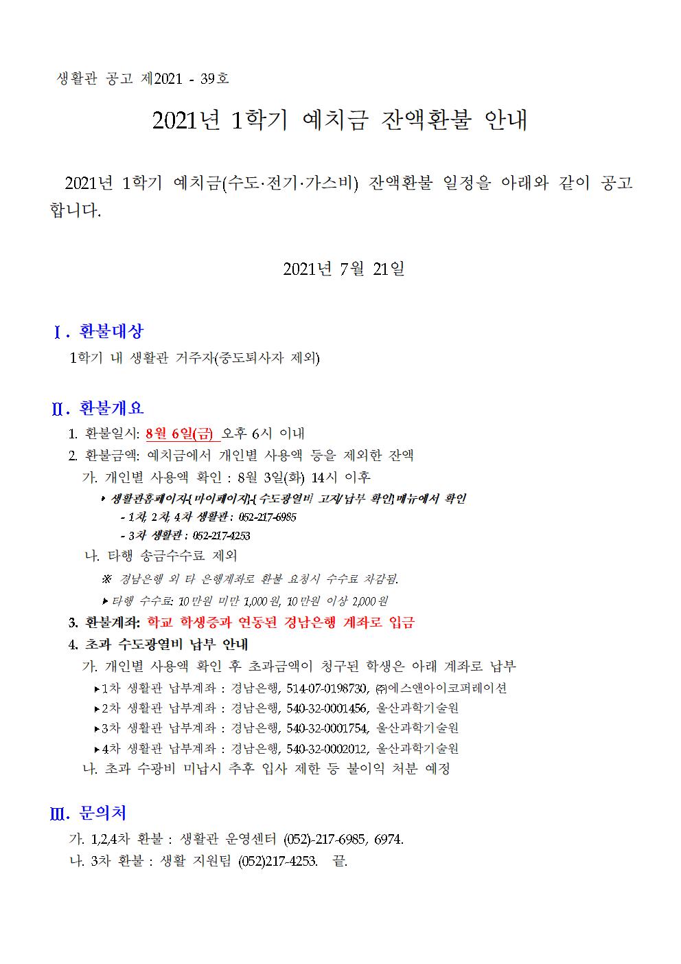 | 542 | (No.2021-39) 2021년 1학기 예치금 잔액환불 안내(2021 1st .. | 2021-07-21 | 2795 |