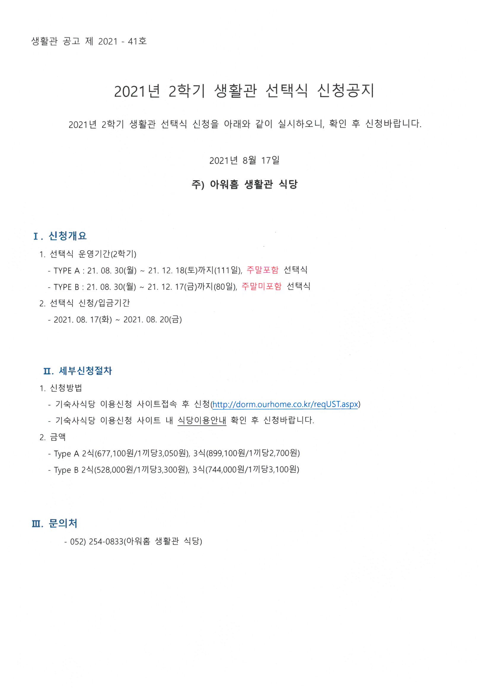 | 549 | (No.2020-41) 2021년 2학기 생활관 선택식 신청공지 | 2021-08-17 | 2886 |