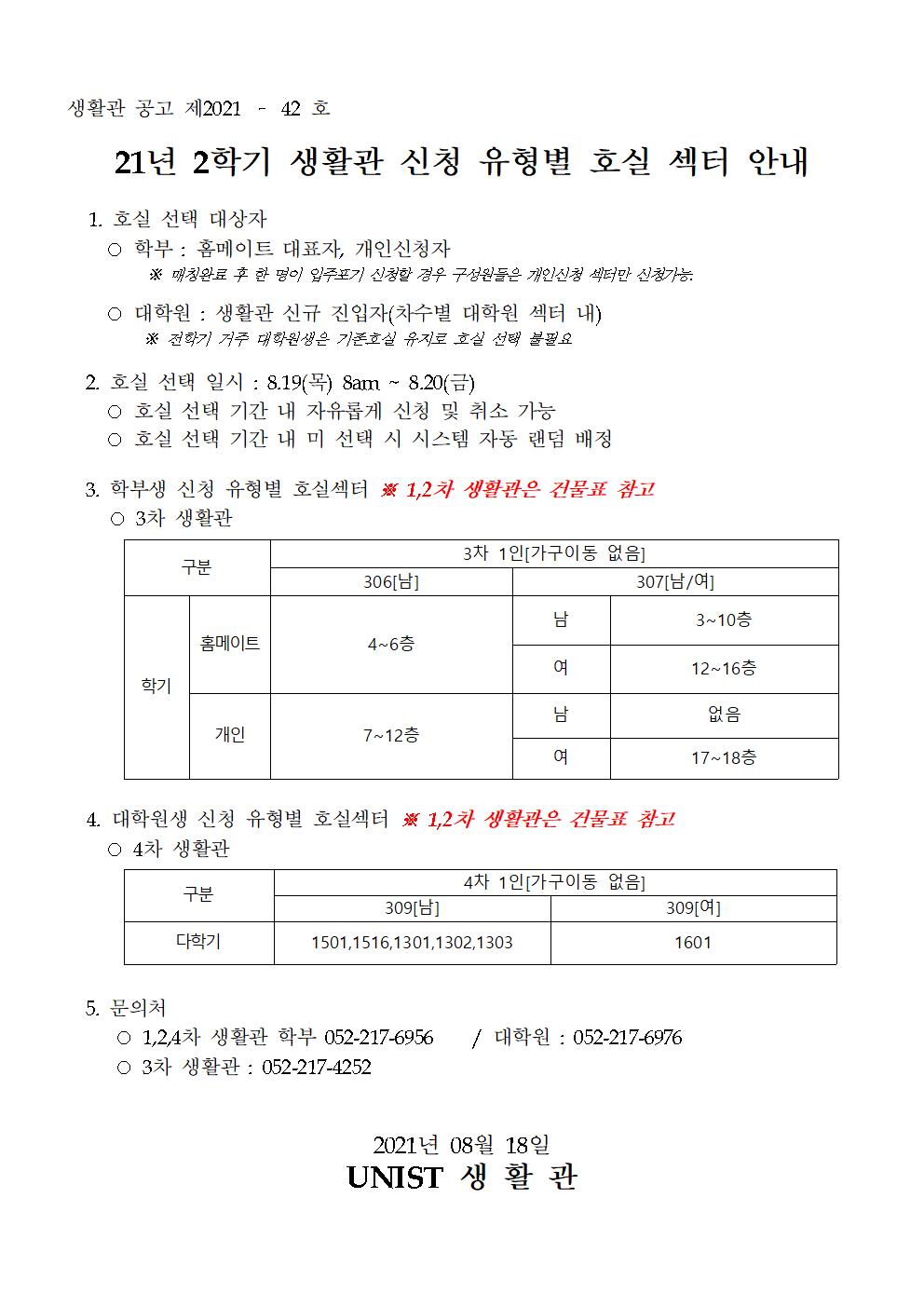 | 550 | (No.2021-42) 21년 2학기 생활관 신청 유형별 호실 섹터 안.. | 2021-08-18 | 3698 |