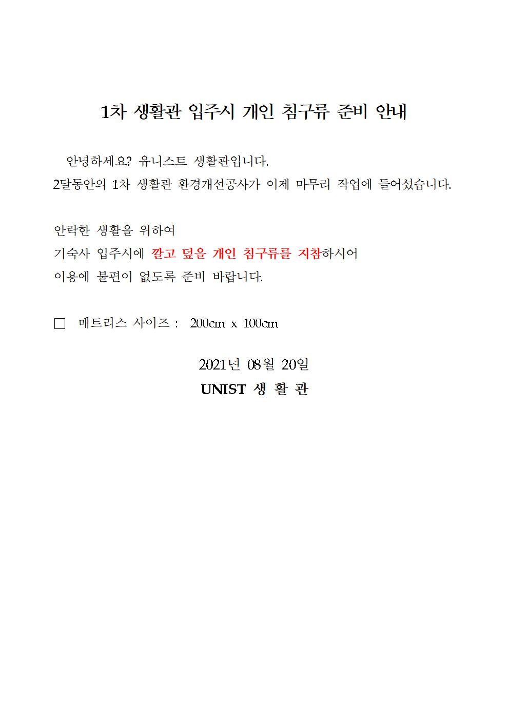 | 551 | 1차 생활관 입주시 개인 침구류 준비 안내 | 2021-08-20 | 2250 |