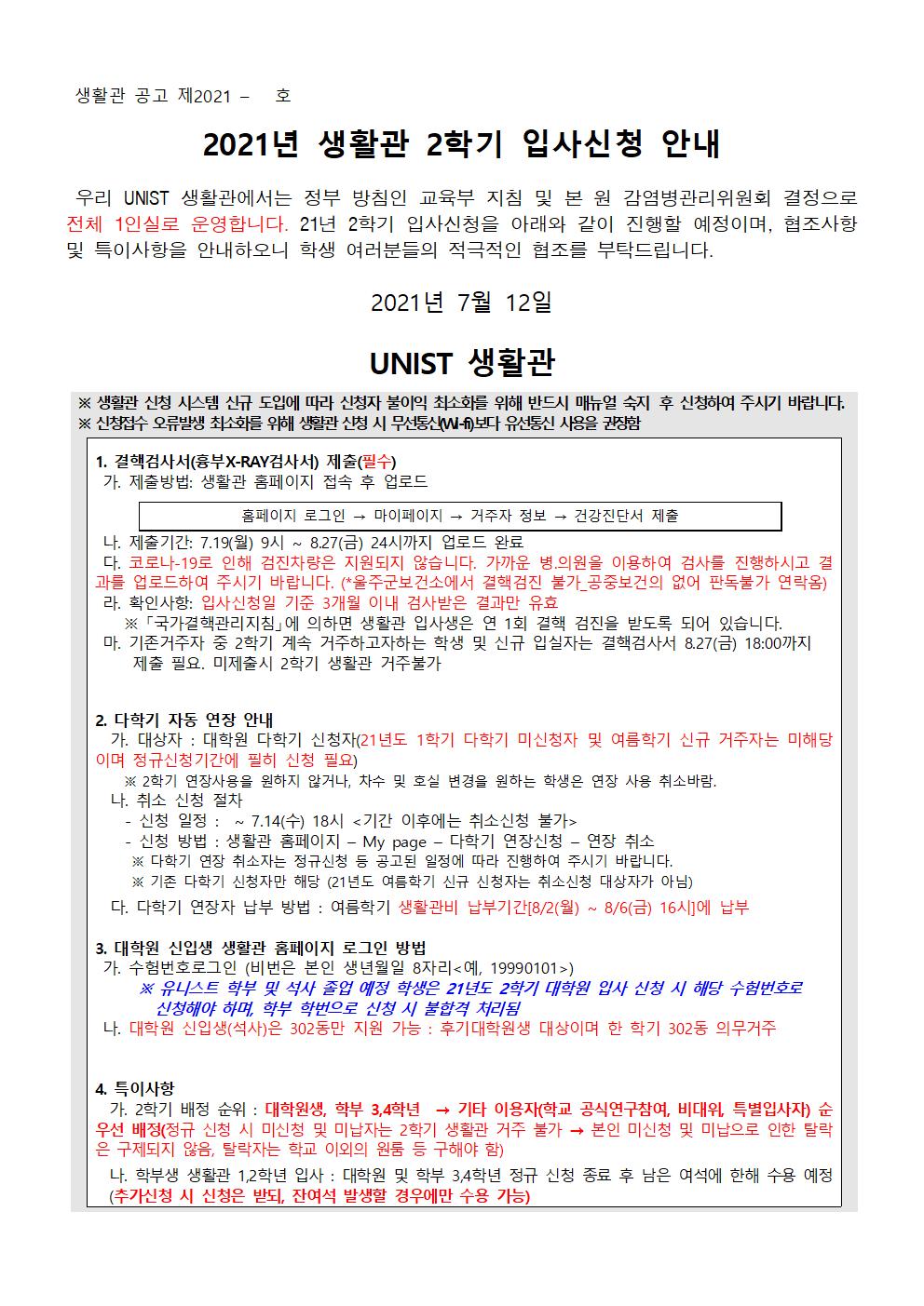 | 536 | (No.20201-36) 2021년 생활관 2학기 입사신청 안내(Applicat.. | 2021-07-12 | 11928 |