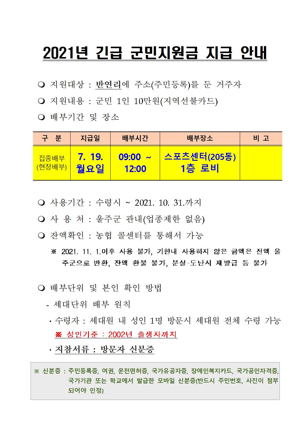 | 537 | 2021년 긴급 군민지원금 지급 안내(Korean only) | 2021-07-16 | 1903 |