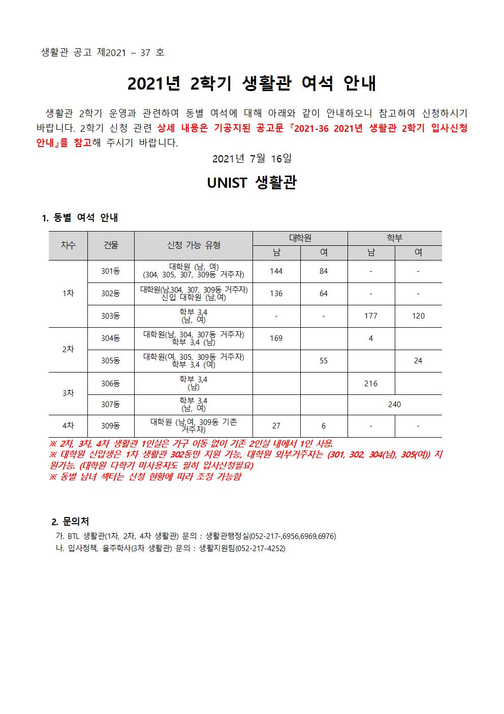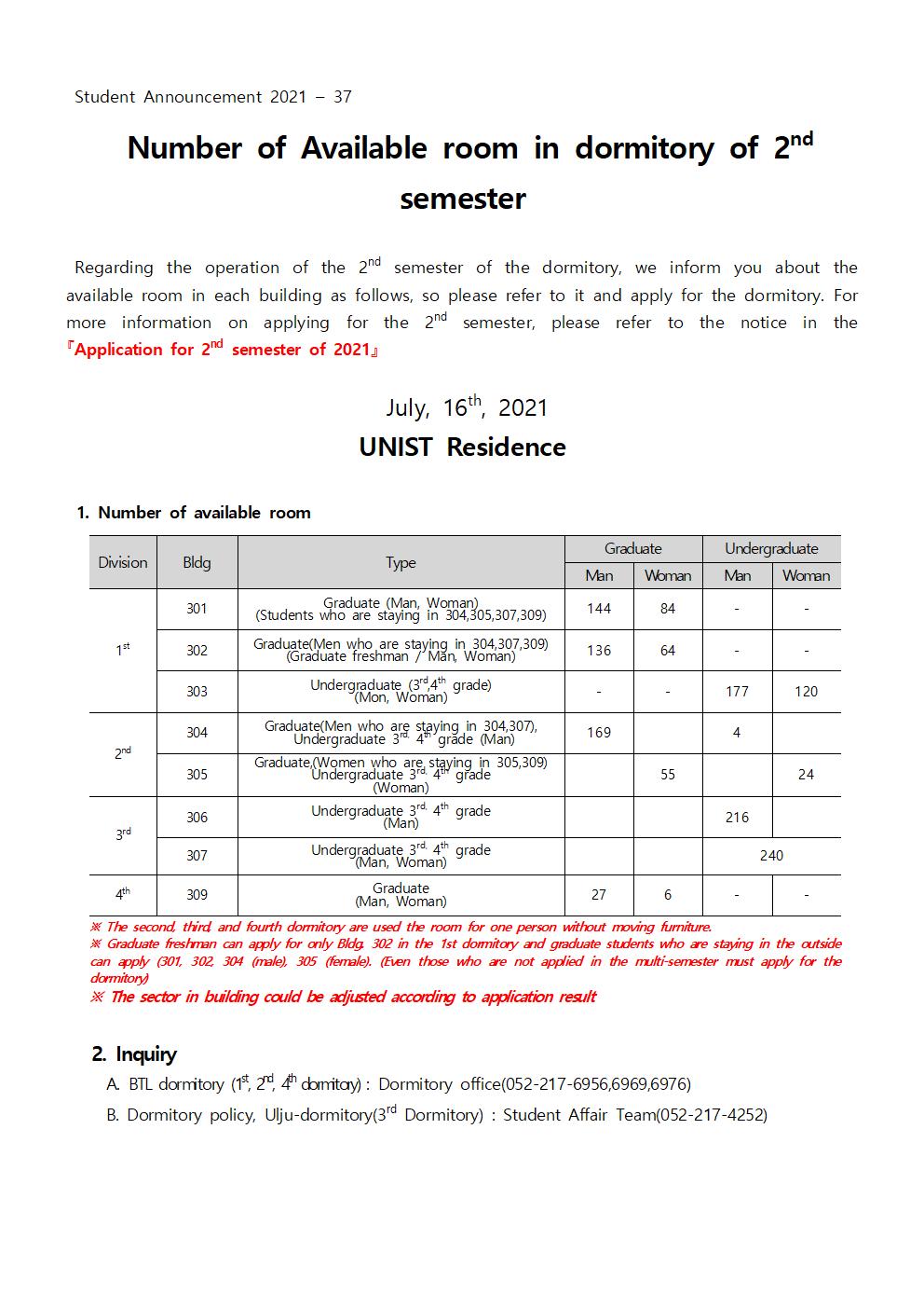 | 538 | (No.2021-37) 2021년 2학기 생활관 여석 안내(Number of Ava.. | 2021-07-16 | 3791 |