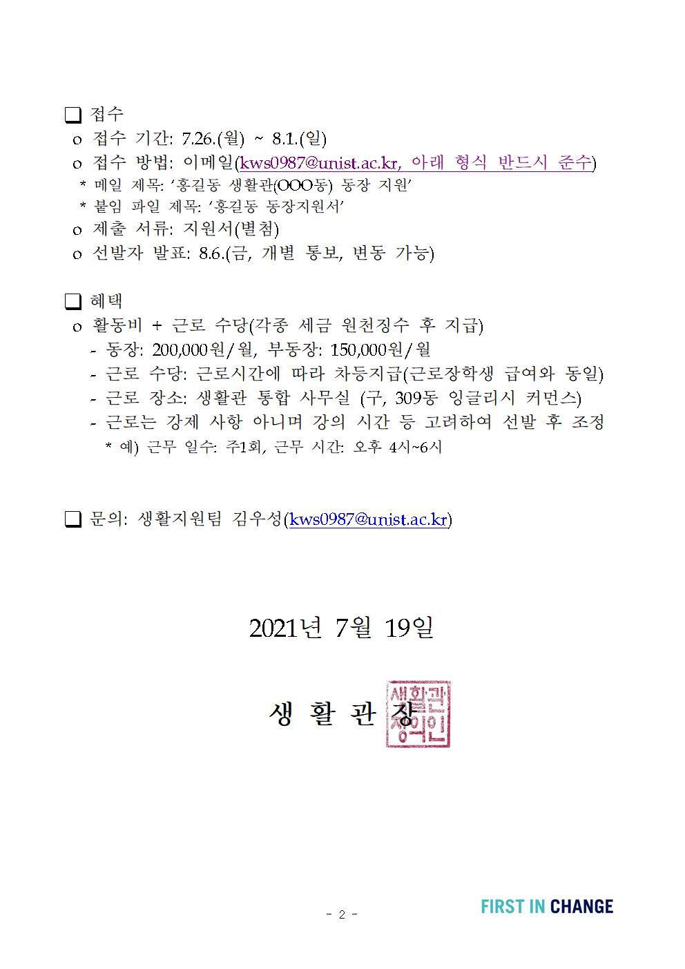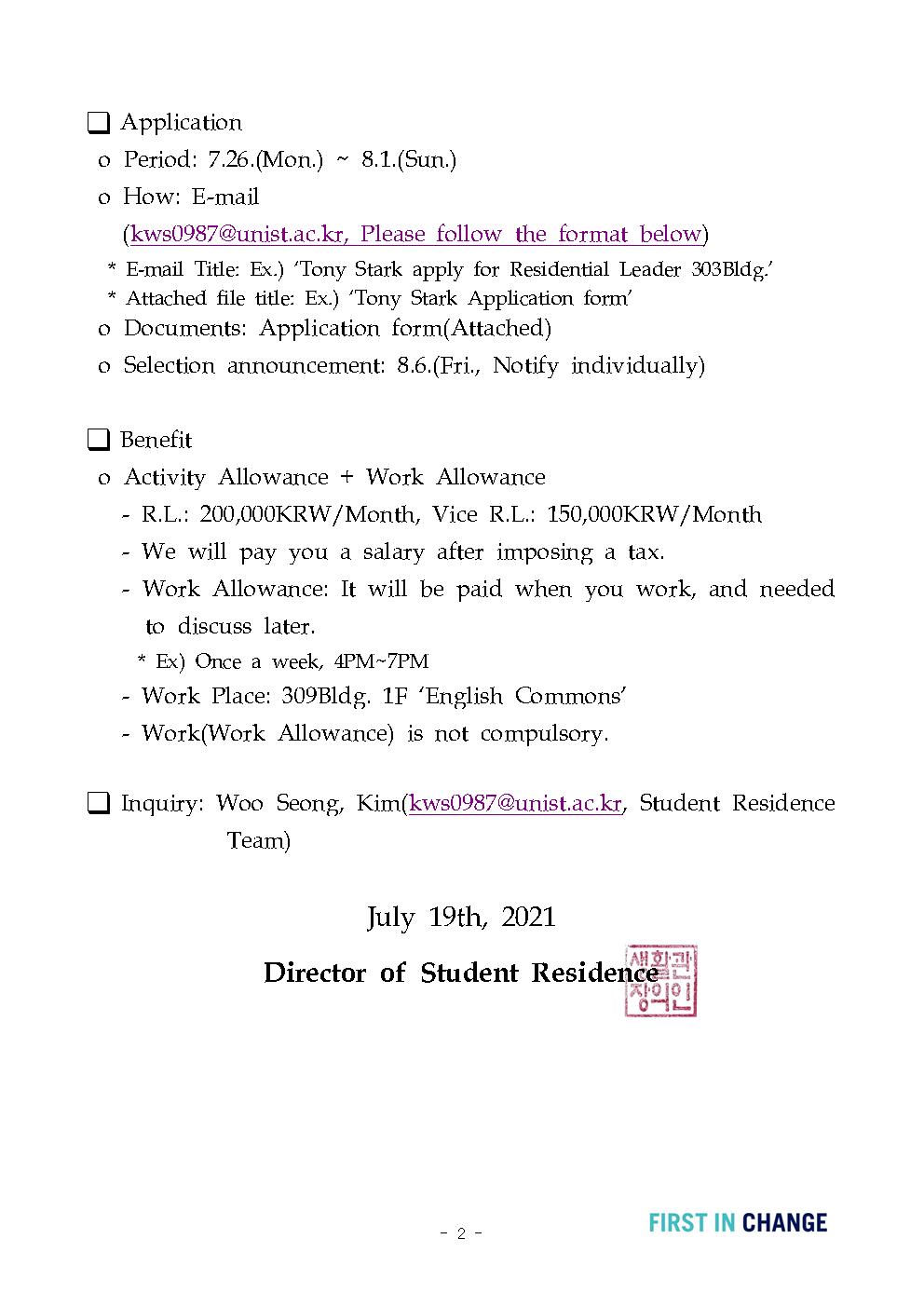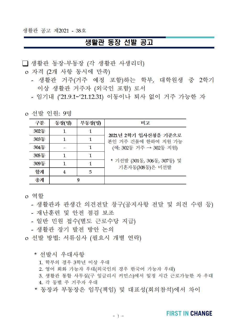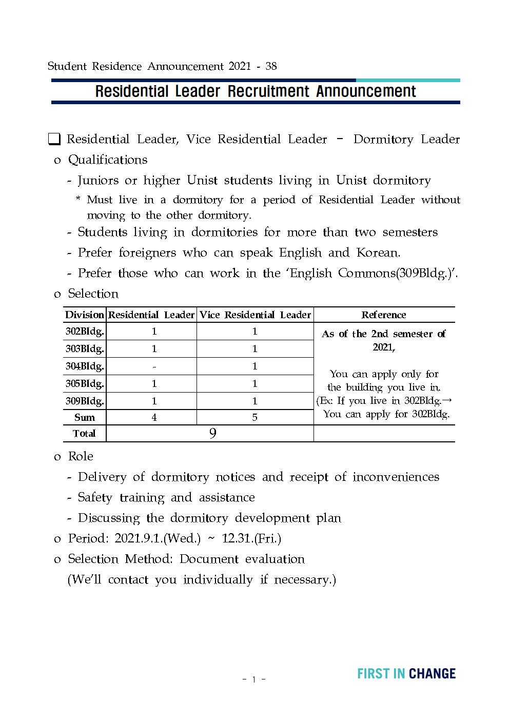 | 540 | (No.2021-38) 생활관 동장 선발 공고(Residential Leader Re.. | 2021-07-19 | 1585 |