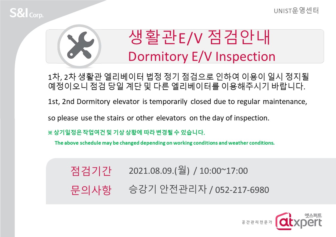 | 541 | 1차, 2차 생활관E/V 점검안내(1st, 2nd Dormitory E/V Inspe.. | 2021-07-20 | 1320 |