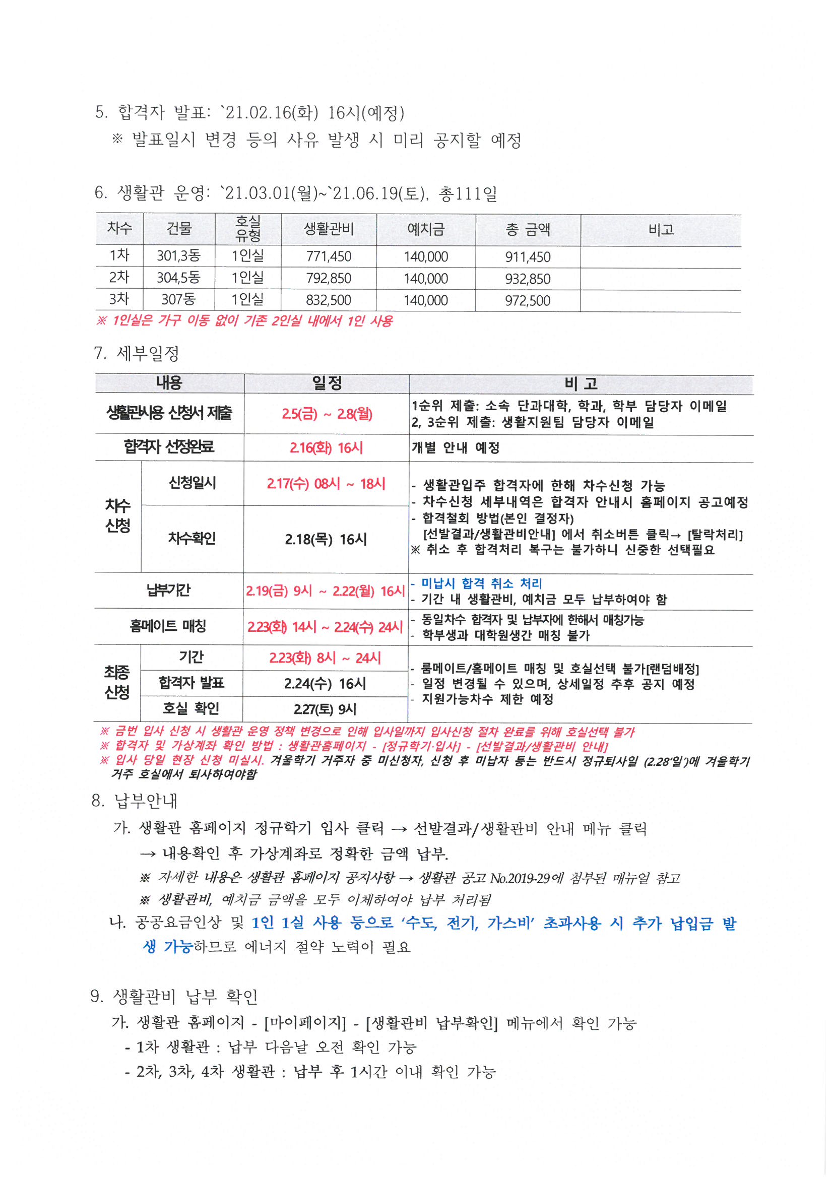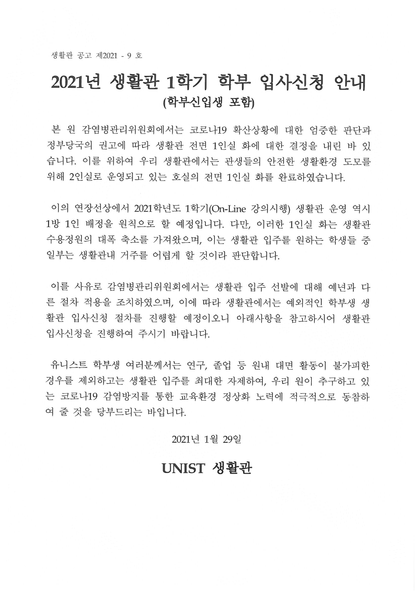 | 472 | (수정)(No.2021-9) 2021년 생활관 1학기 학부 입사신청 안내.. | 2021-02-01 | 14952 |