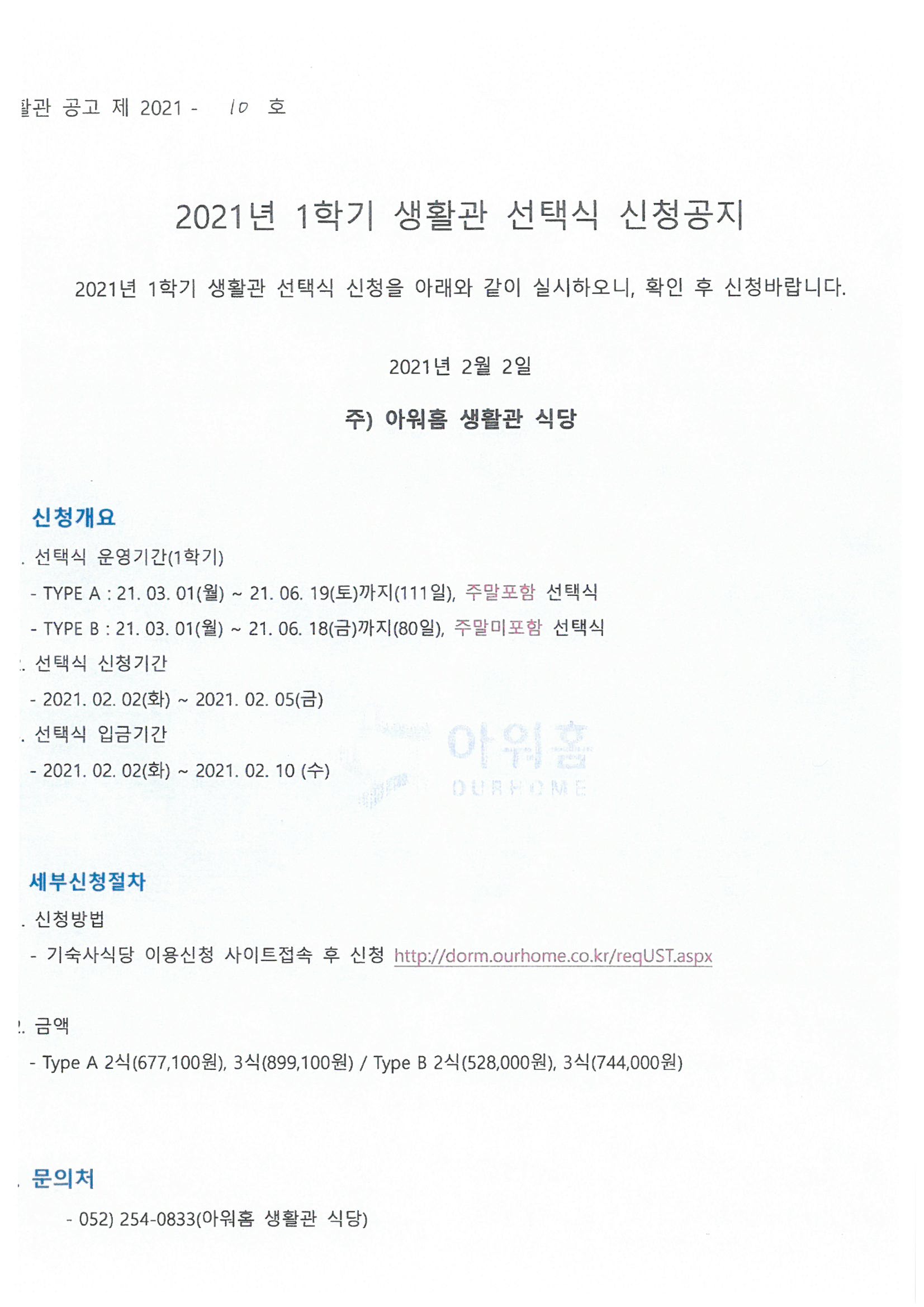 | 473 | (No.2021-10) 2021년 1학기 생활관 선택식 신청 공지 | 2021-02-02 | 2629 |