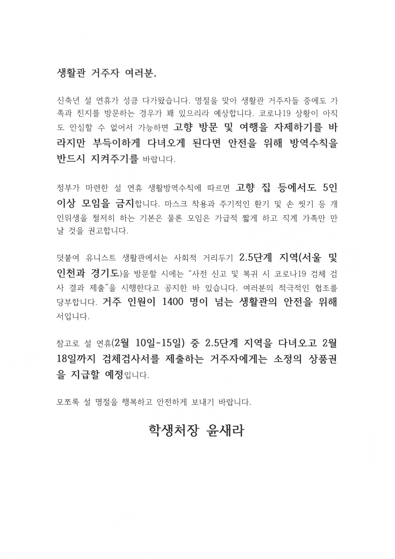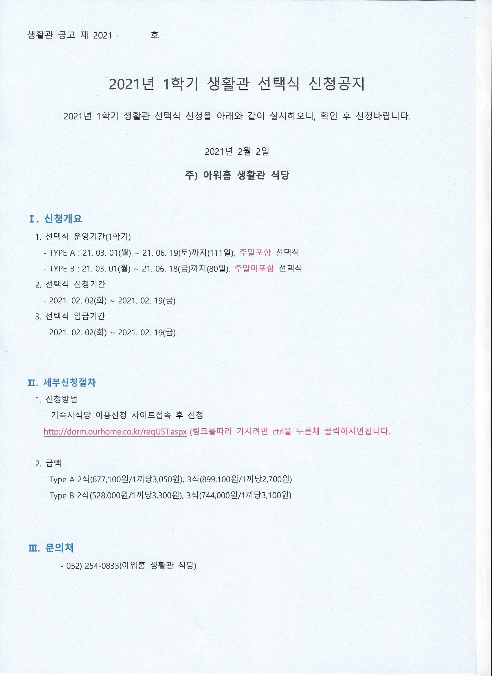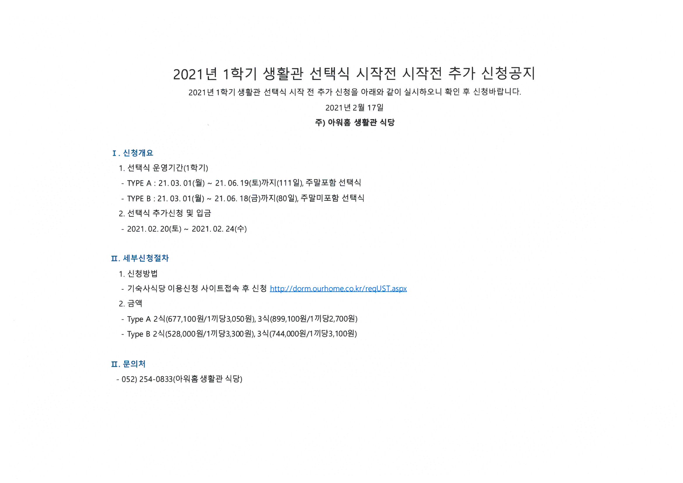 | 474 | (No.2021-10)(수정) 2021년 1학기 생활관 선택식 신청 공지 | 2021-02-04 | 3741 |