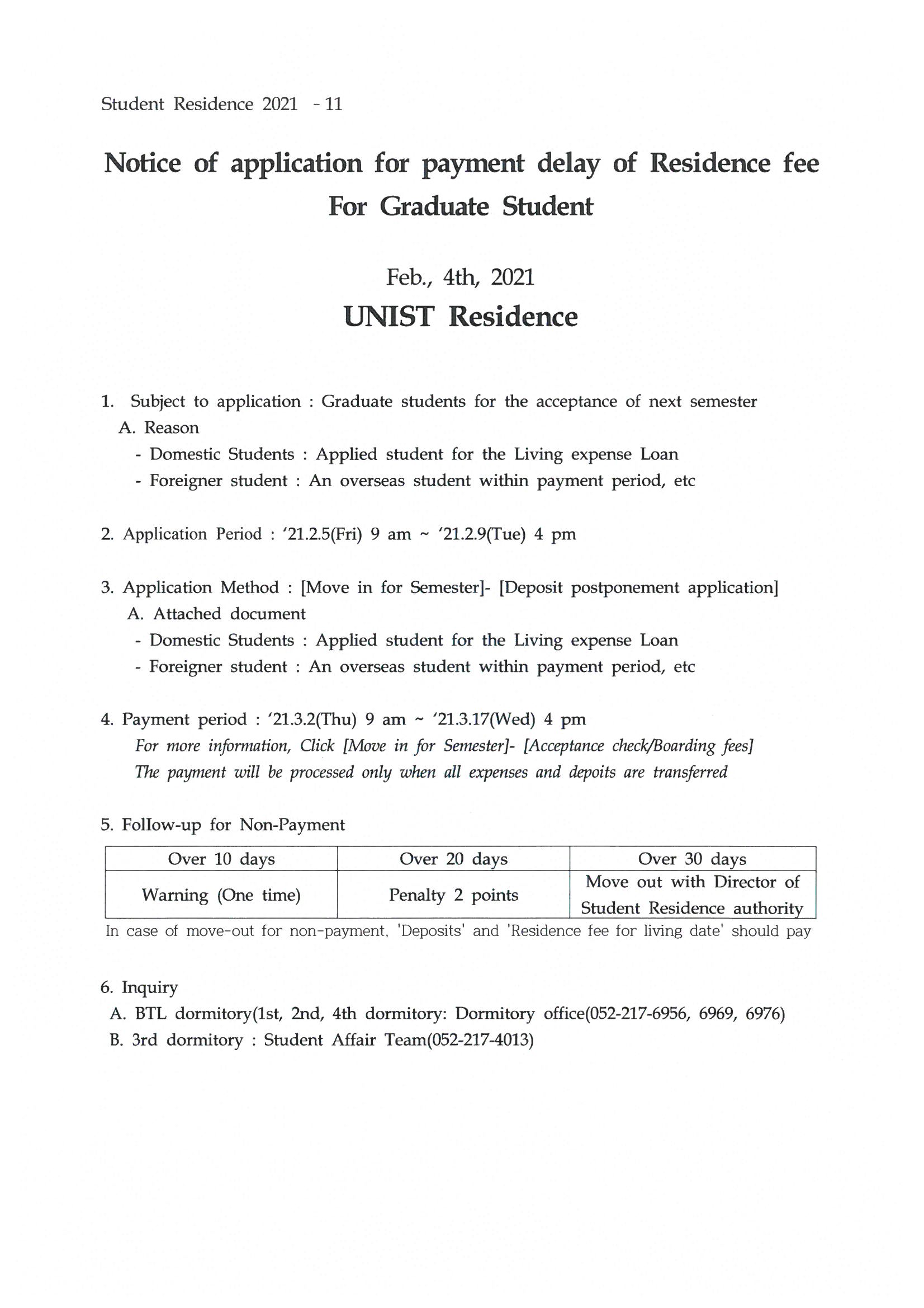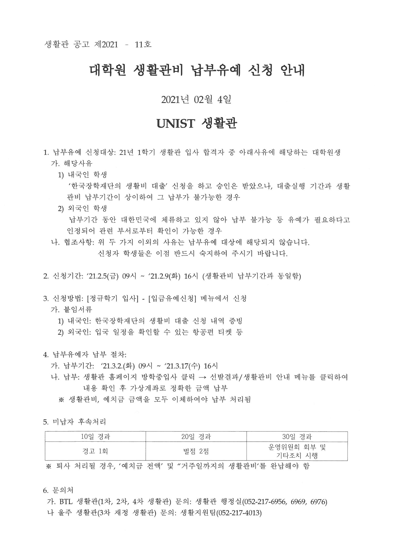 | 475 | (No.2021-11) 대학원 생활관비 납부유예 신청 안내(Notice o.. | 2021-02-04 | 2691 |