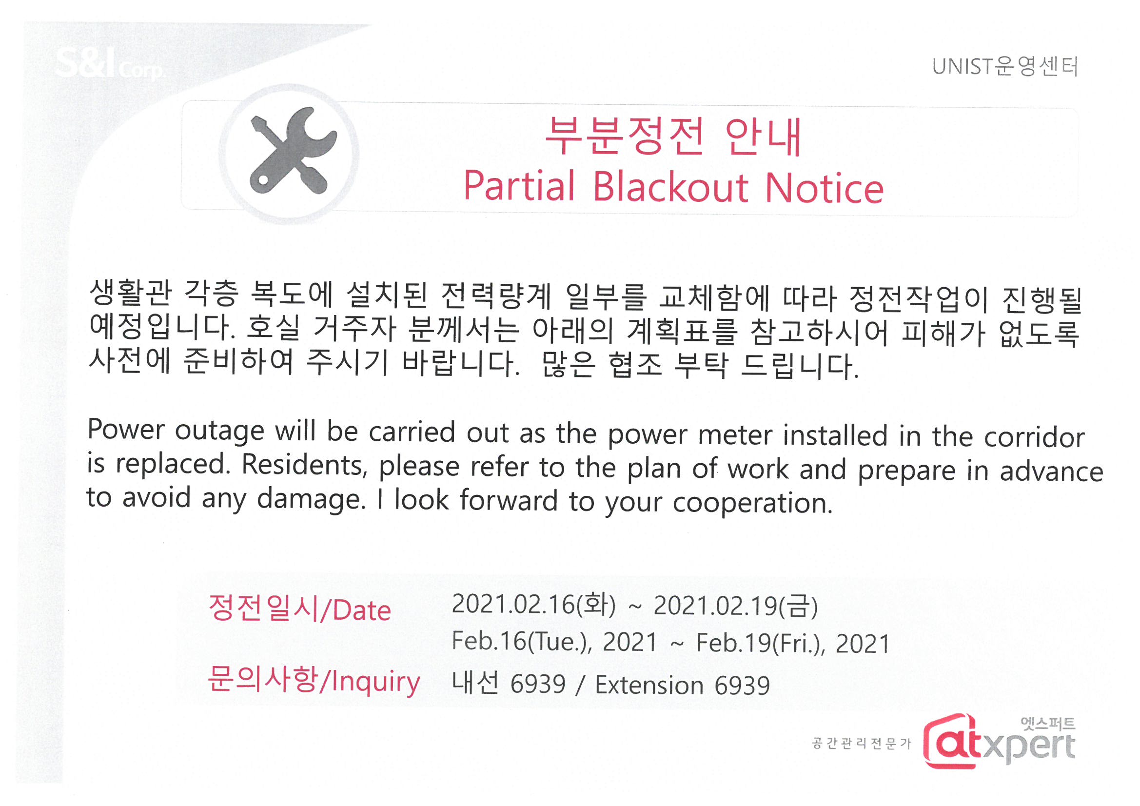 | 476 | 생활관 부분 정전 안내(Partial Blackout Notice) | 2021-02-09 | 1866 |