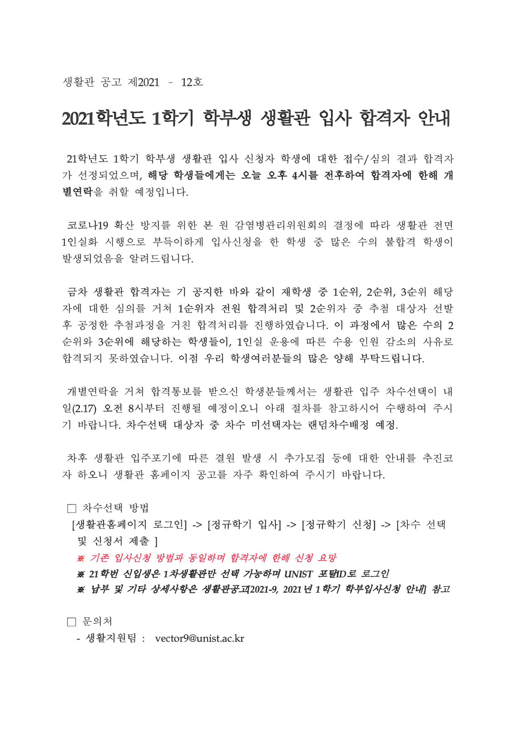 | 478 | (No.2021-12) 2021학년도 1학기 학부생 생활관 입사 합격자 .. | 2021-02-16 | 5803 |