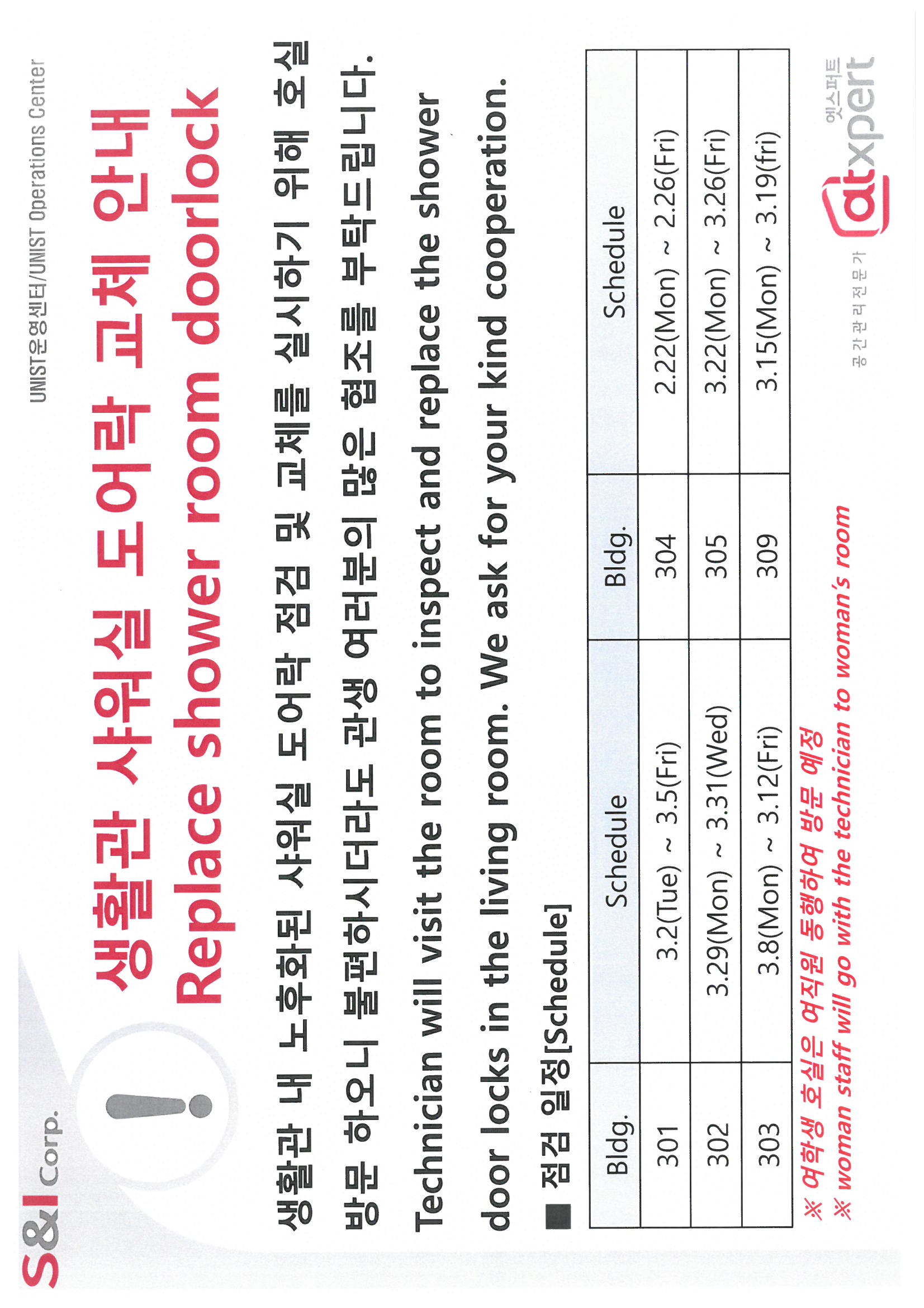 | 479 | 생활관 샤워실 도어락 교체 안내(Replace shower room door .. | 2021-02-17 | 1848 |
