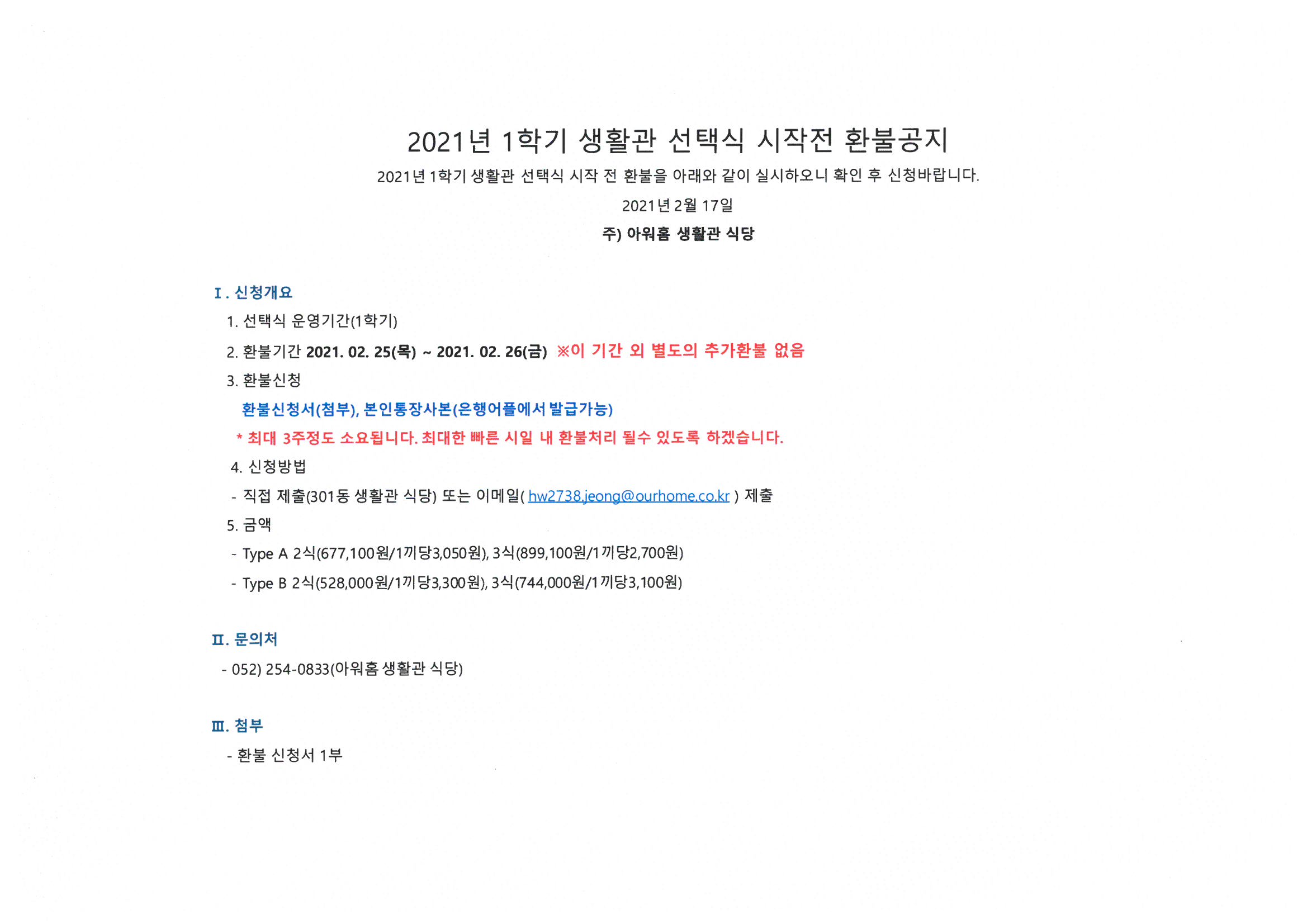 | 480 | 21-1학기 생활관 선택식 시작전 추가신청 및 환불 안내 | 2021-02-17 | 1539 |