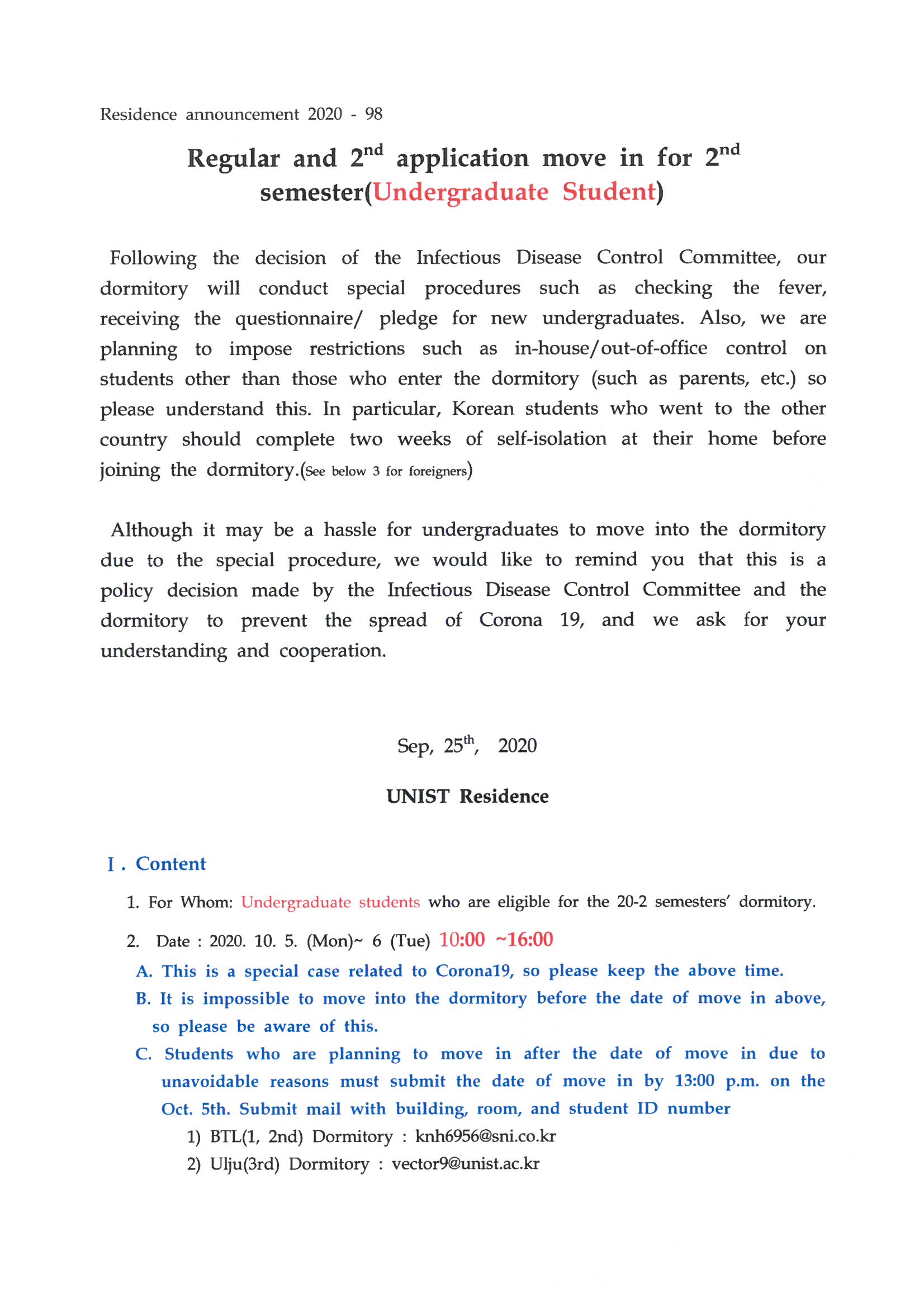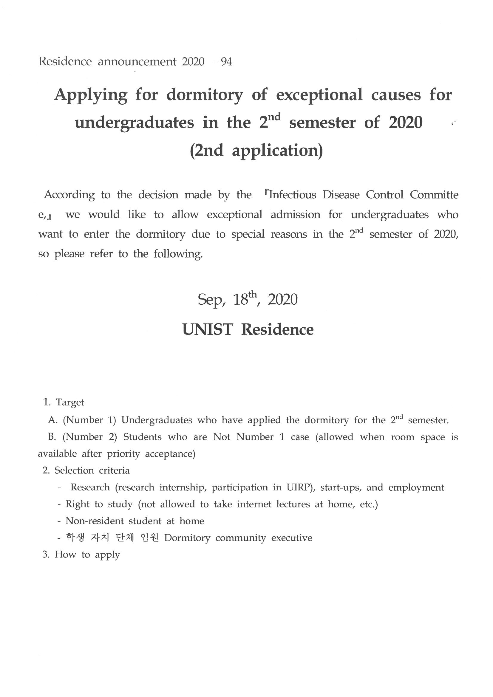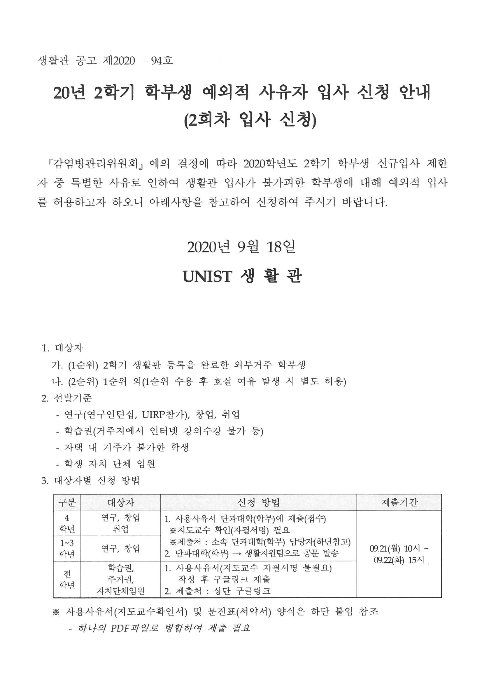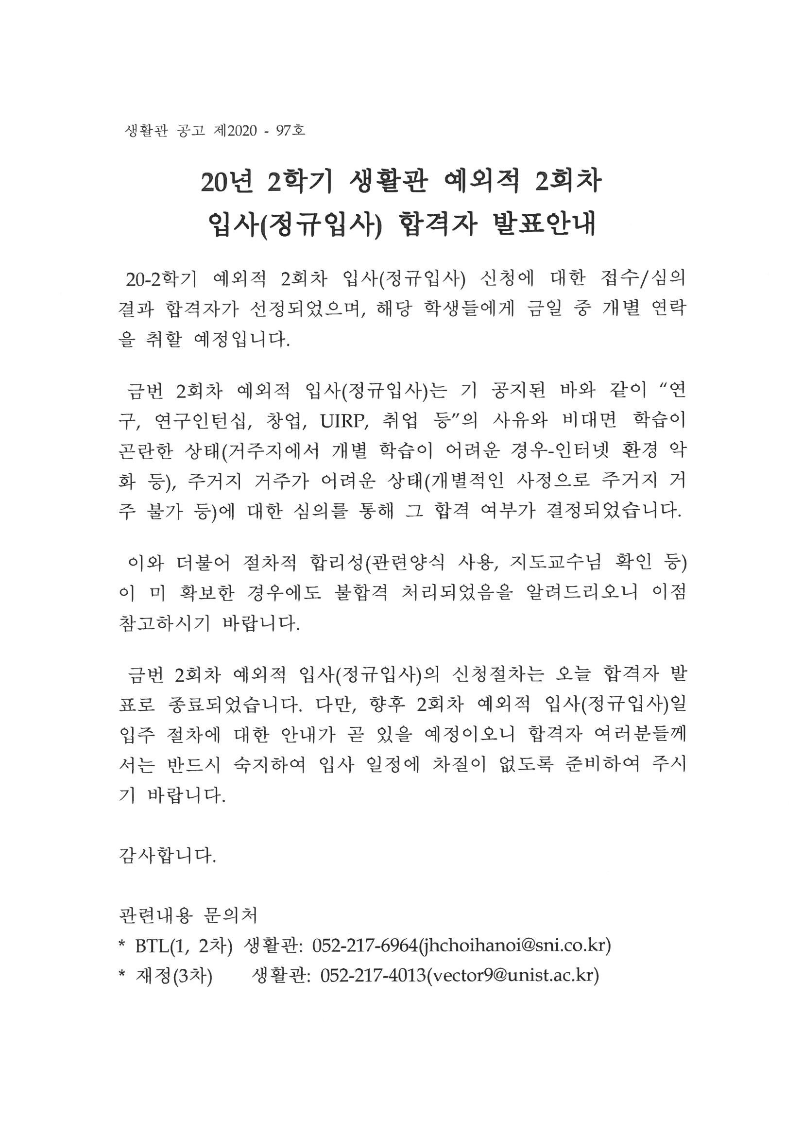 | 417 | (No.2020-97) 20년 2학기 생활관 예외적 2회차 입사(정규입.. | 2020-09-24 | 2020 |