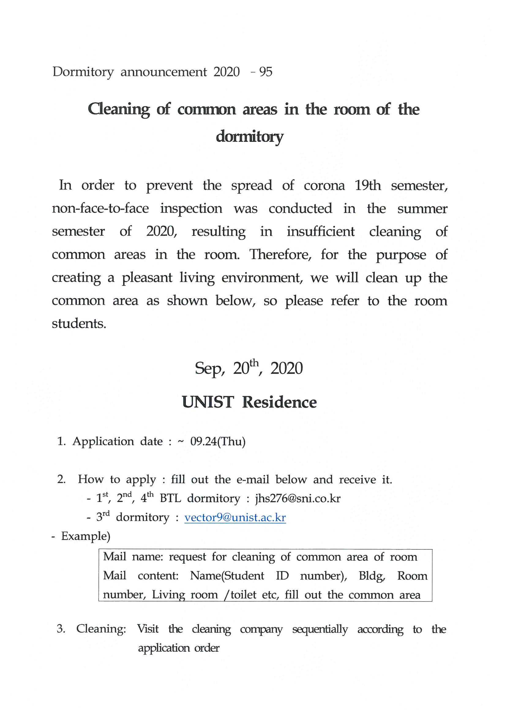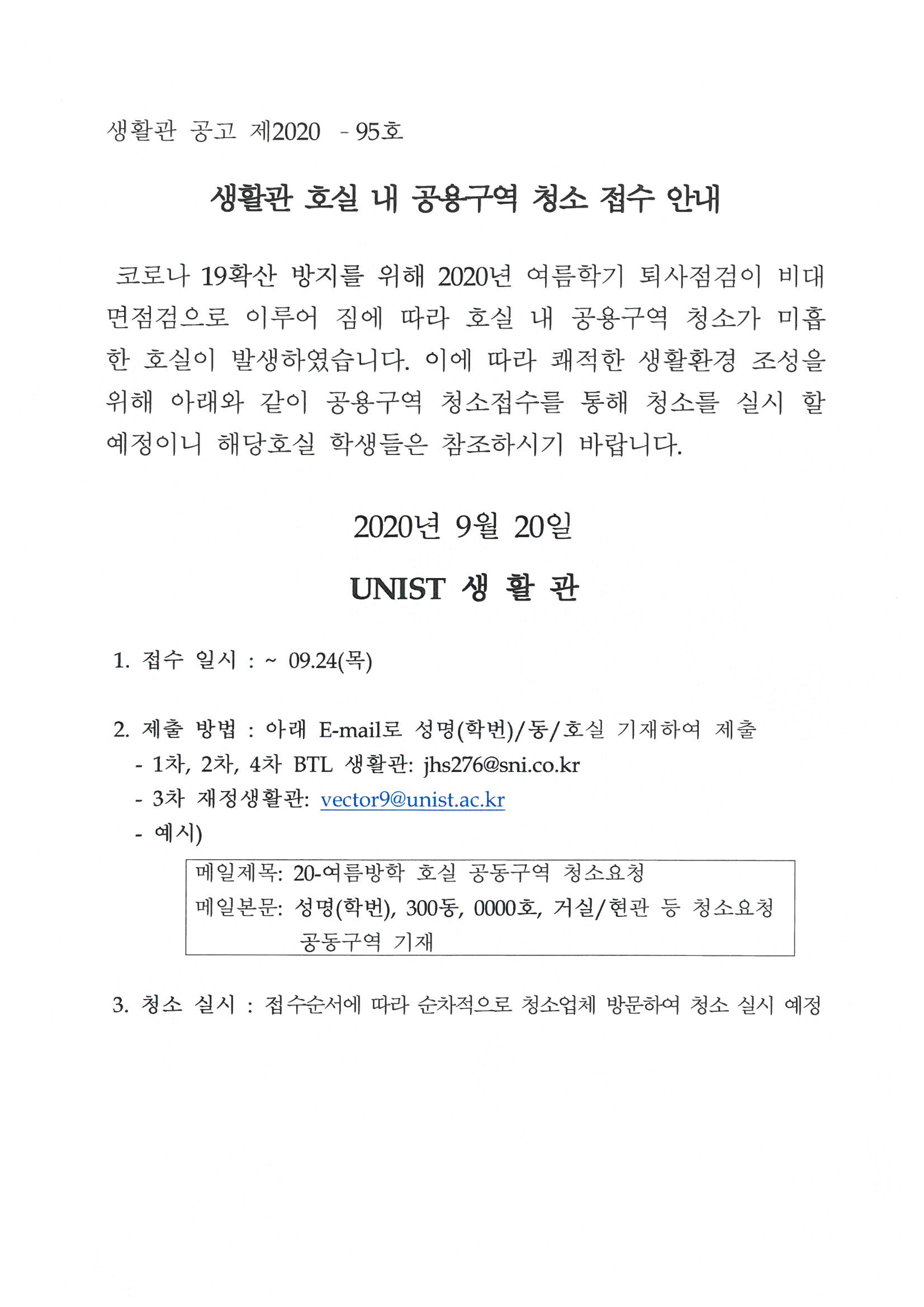 | 413 | (No.2020-95) 생활관 호실 내 공용구역 청소 접수 안내(Clea.. | 2020-09-20 | 1953 |