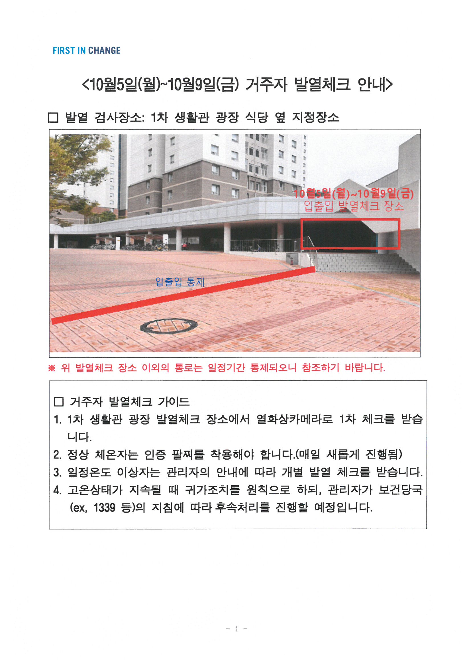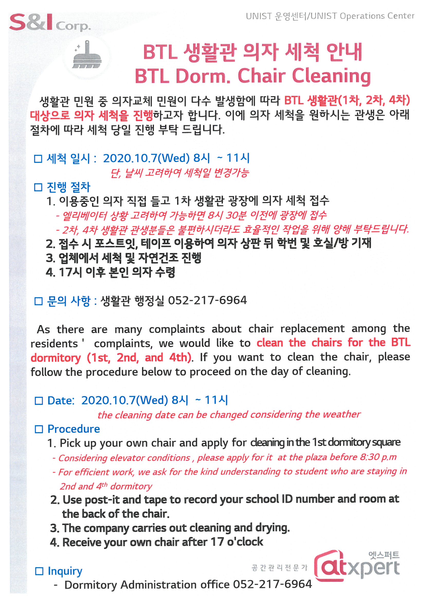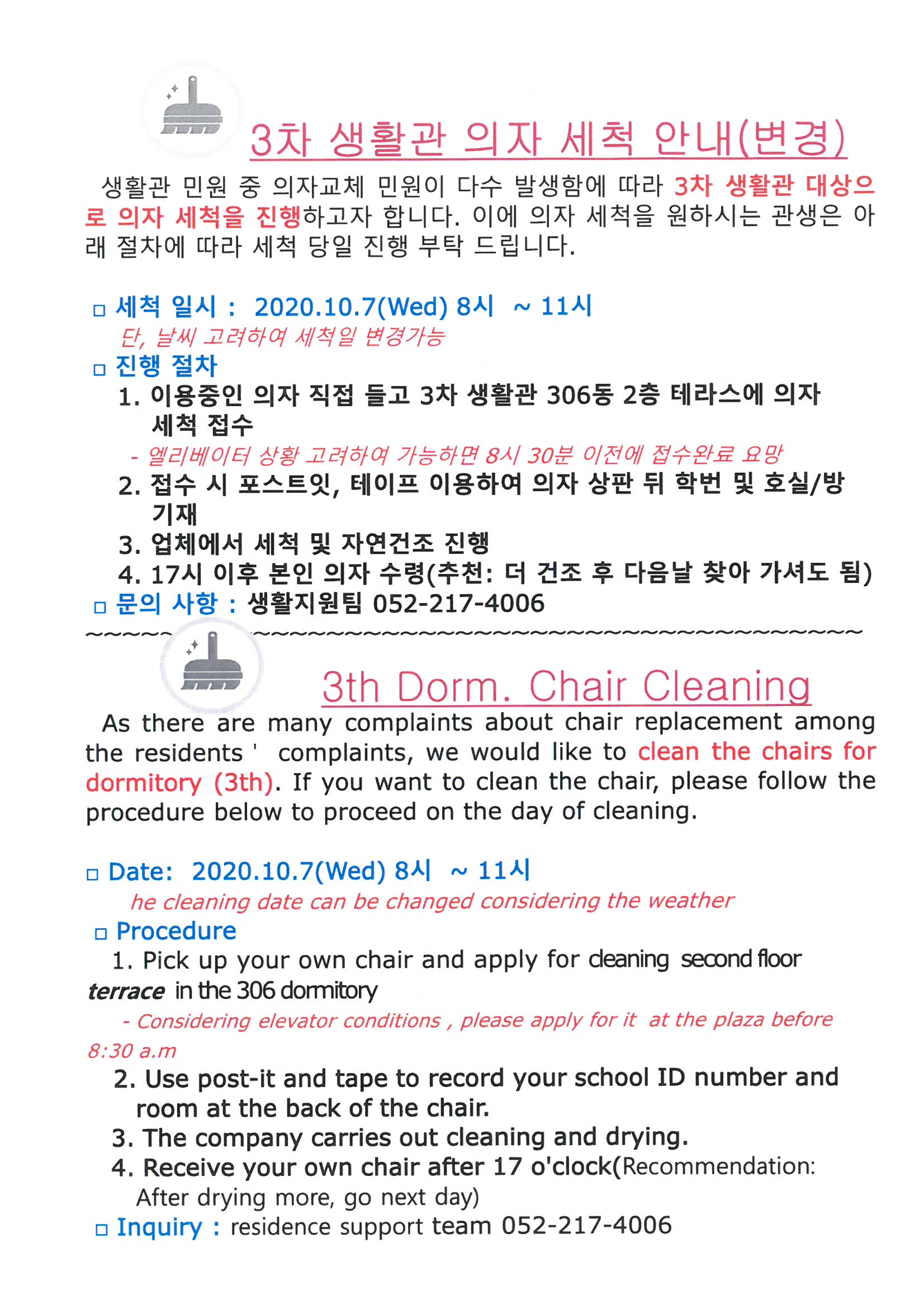 | 414 | (일정변경) 생활관 의자 세척 안내(Dorm Chair Cleaning) | 2020-09-21 | 2806 |