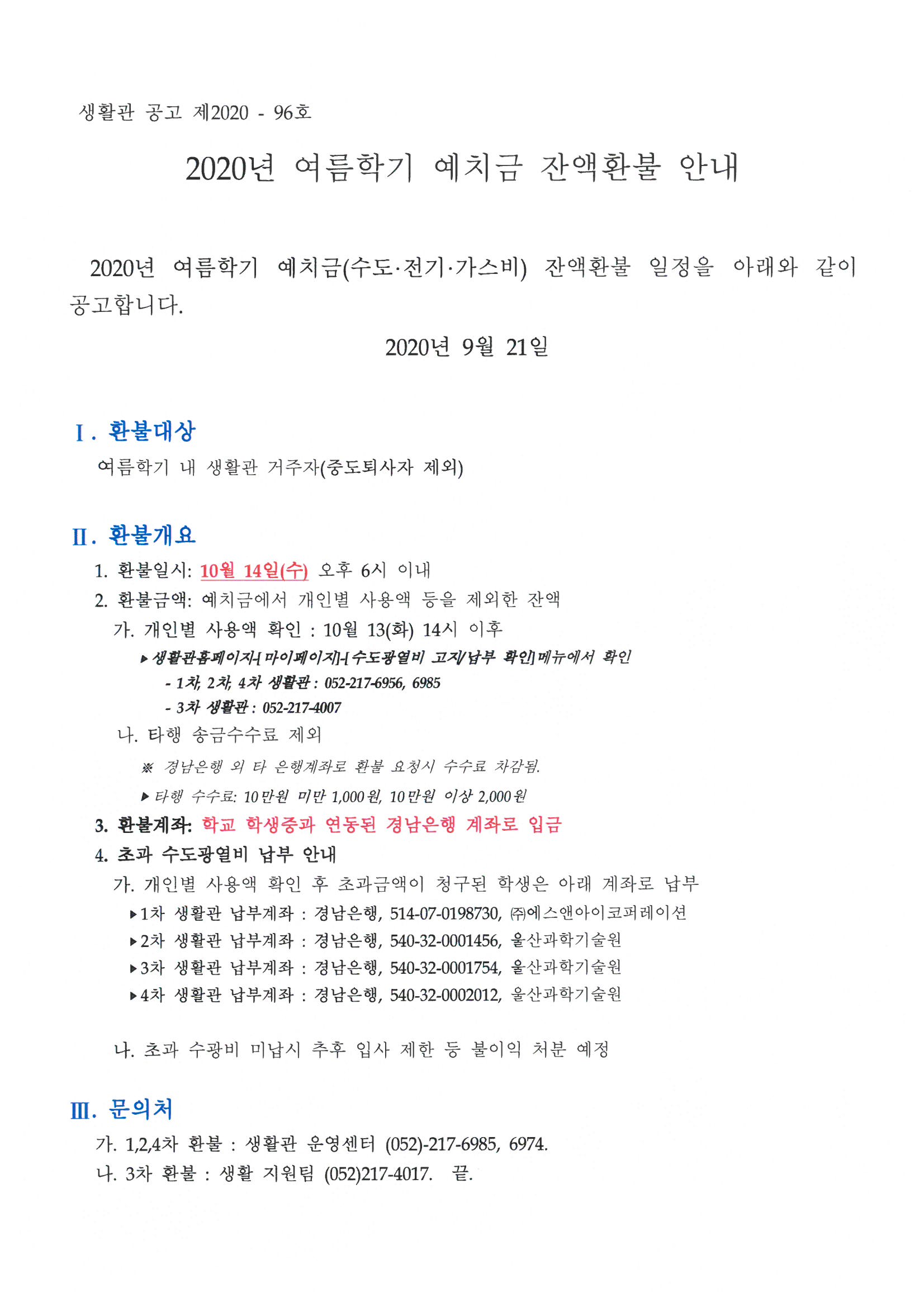 | 415 | (No.2020-96) 2020년 여름학기 예치금 잔액환불 안내(2020 S.. | 2020-09-21 | 2439 |