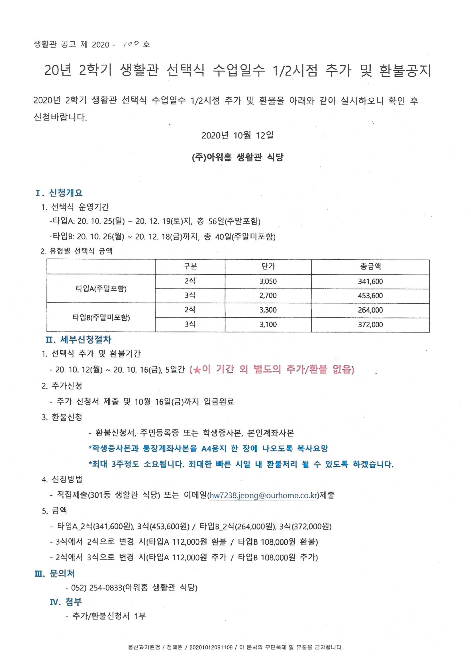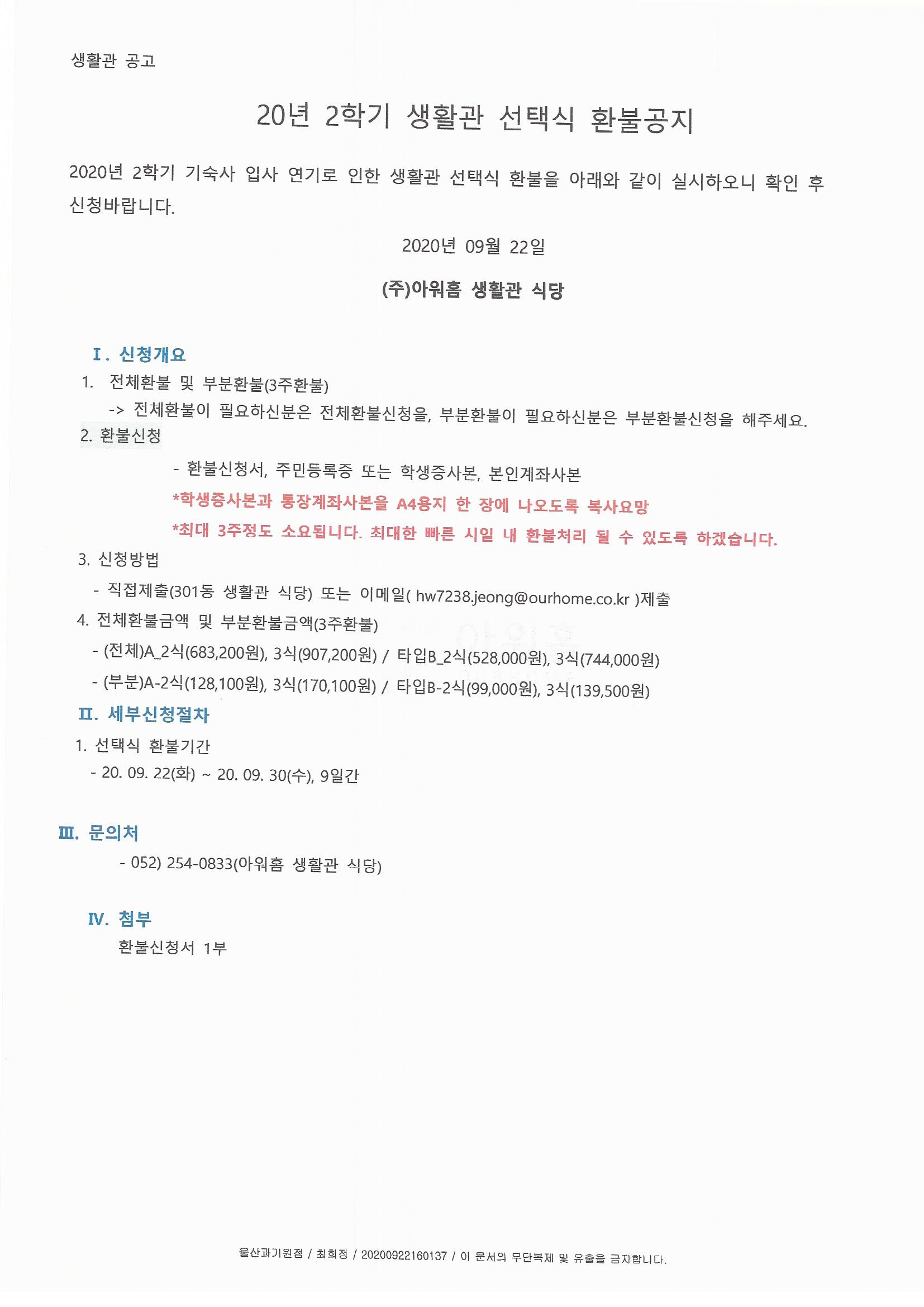 | 416 | 20년 2학기 생활관 선택식 환불공지 | 2020-09-23 | 1693 |