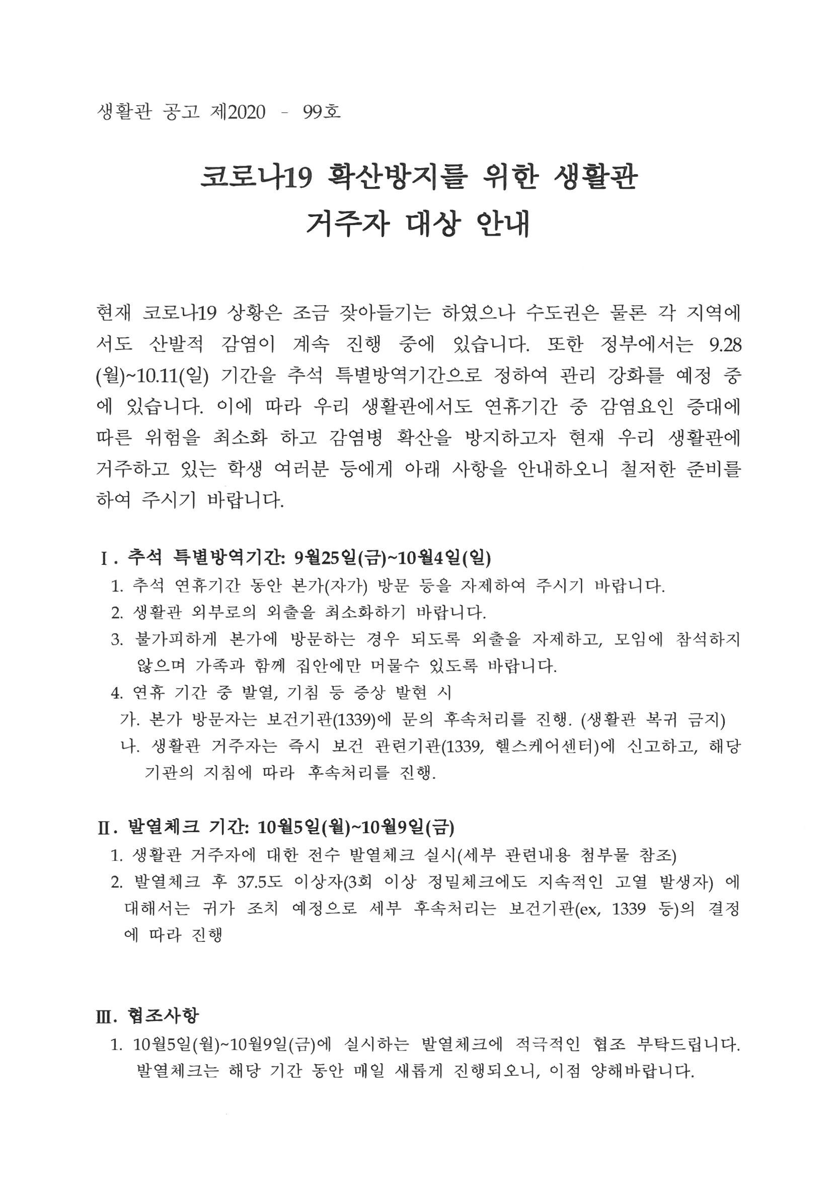 | 419 | (No.2020-99) 코로나19 확산방지를 위한 생활관 거주자 대.. | 2020-09-25 | 2760 |