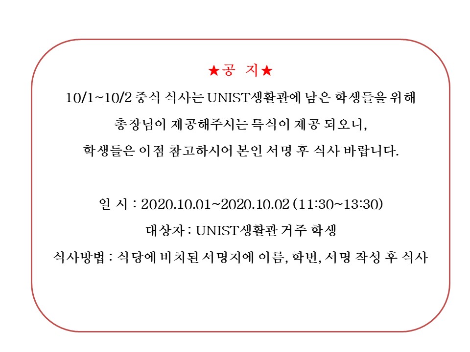 | 420 | 추석 특식 제공 안내 | 2020-09-28 | 1942 |