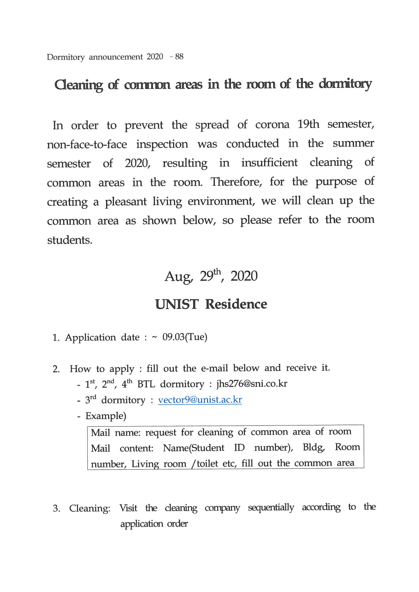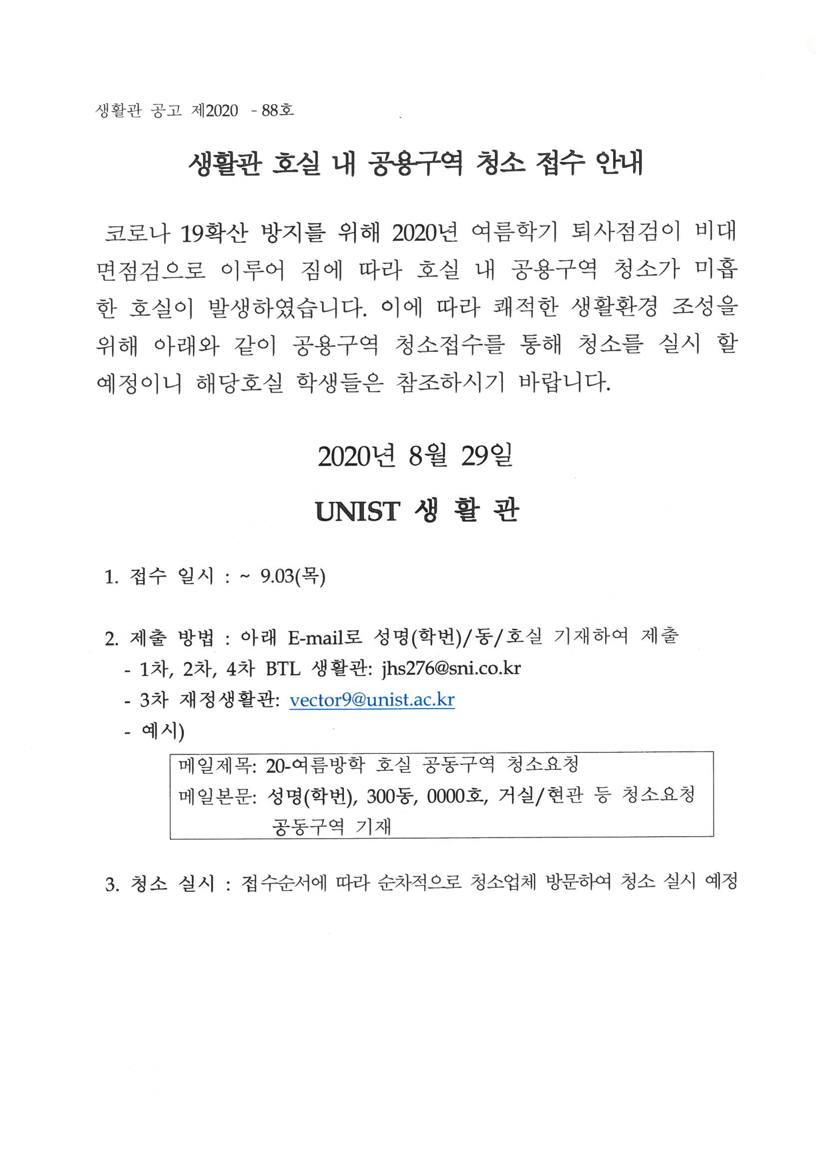 | 402 | (No.2020-88) 생활관 호실 내 공용구역 청소 접수 안내(Clea.. | 2020-08-29 | 2305 |