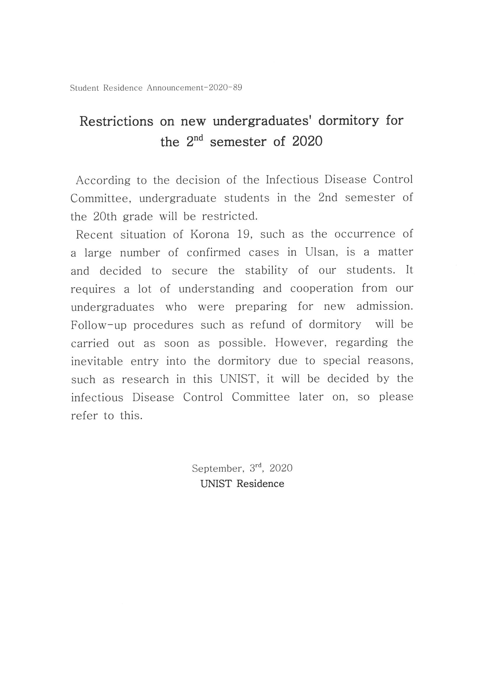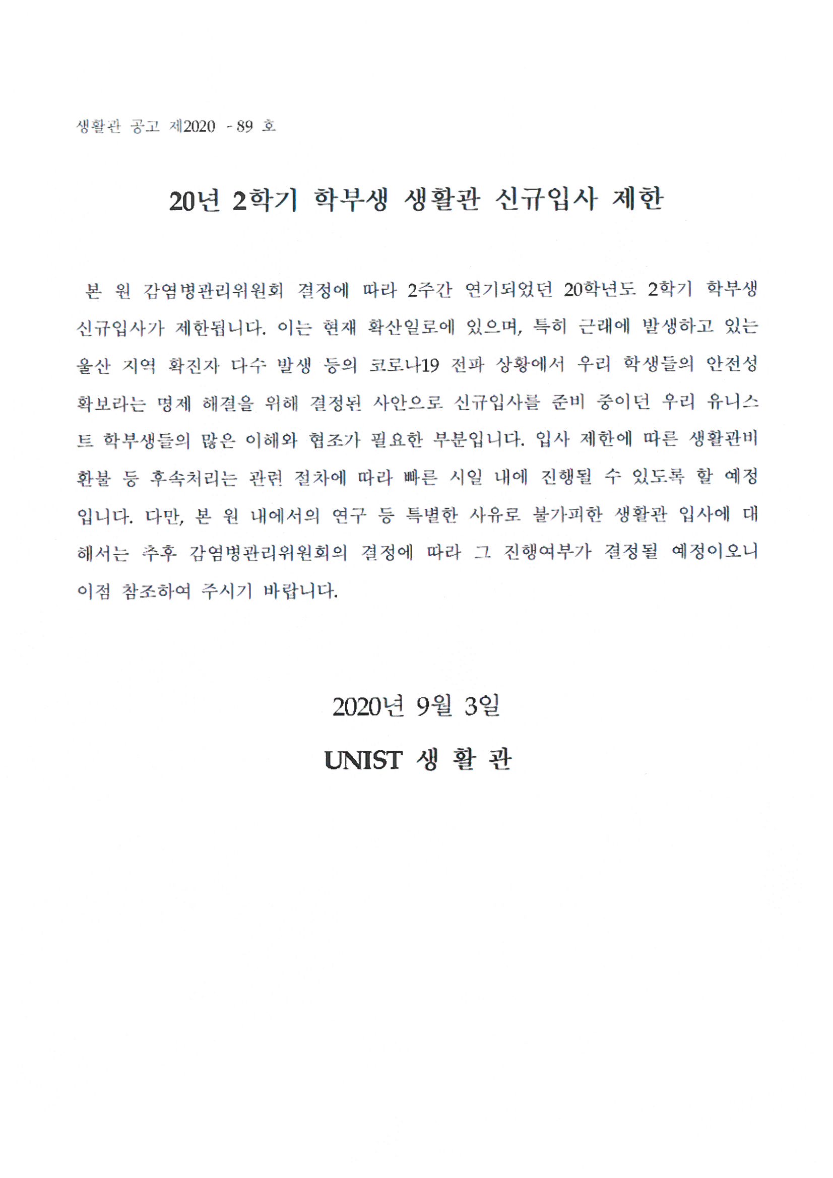 | 404 | (No.2020-89) 20년 2학기 학부생 생활관 신규입사 제한 | 2020-09-03 | 3424 |