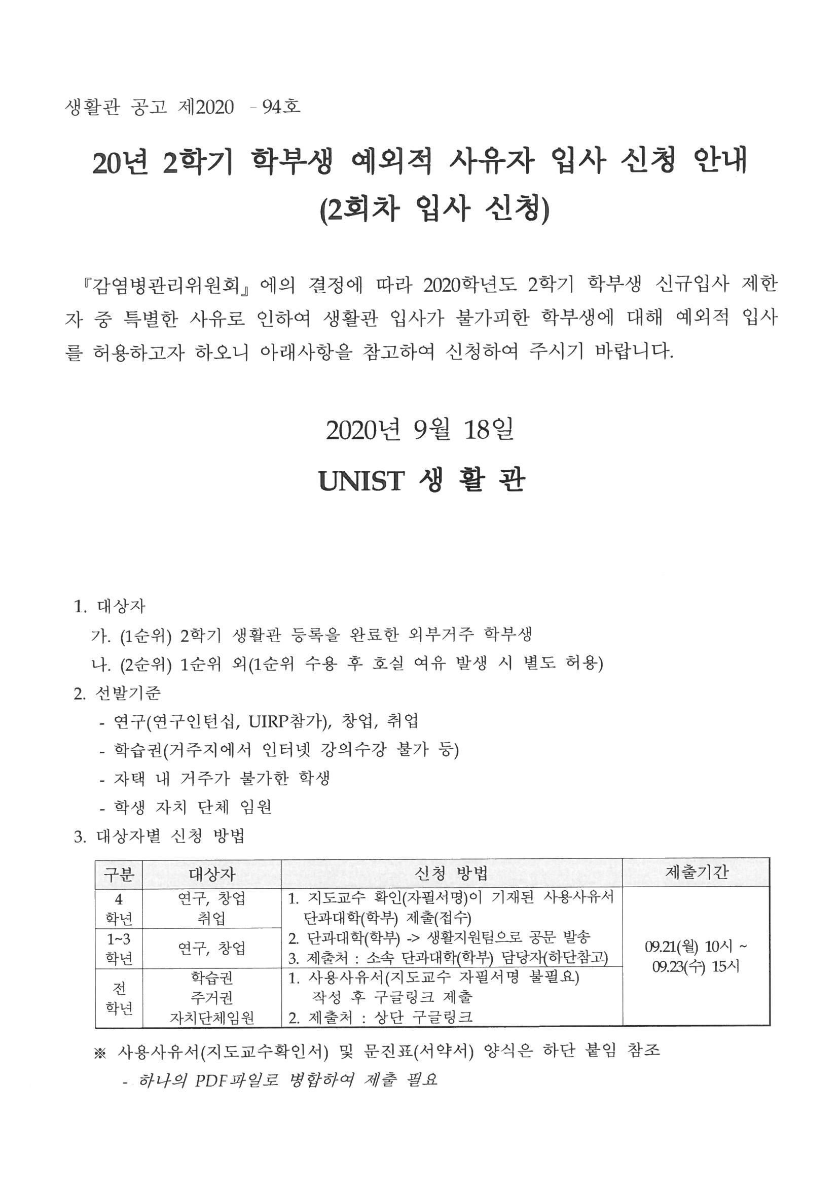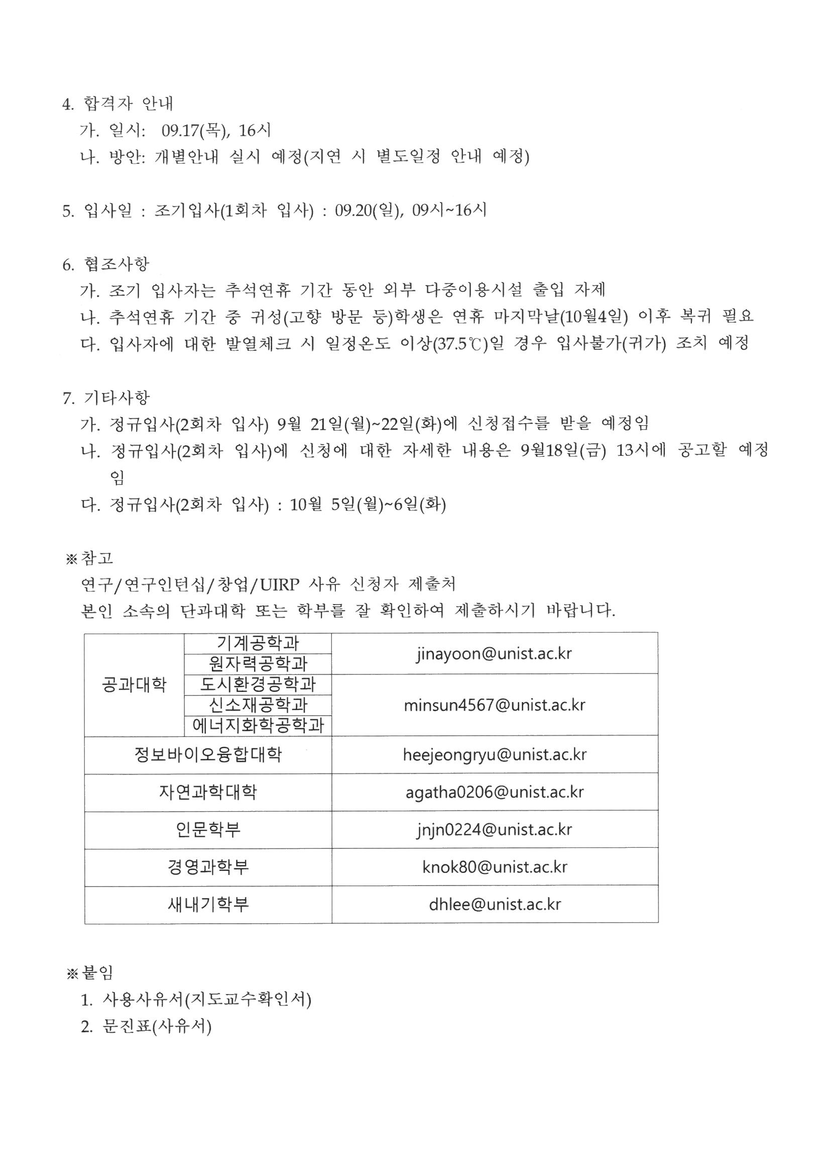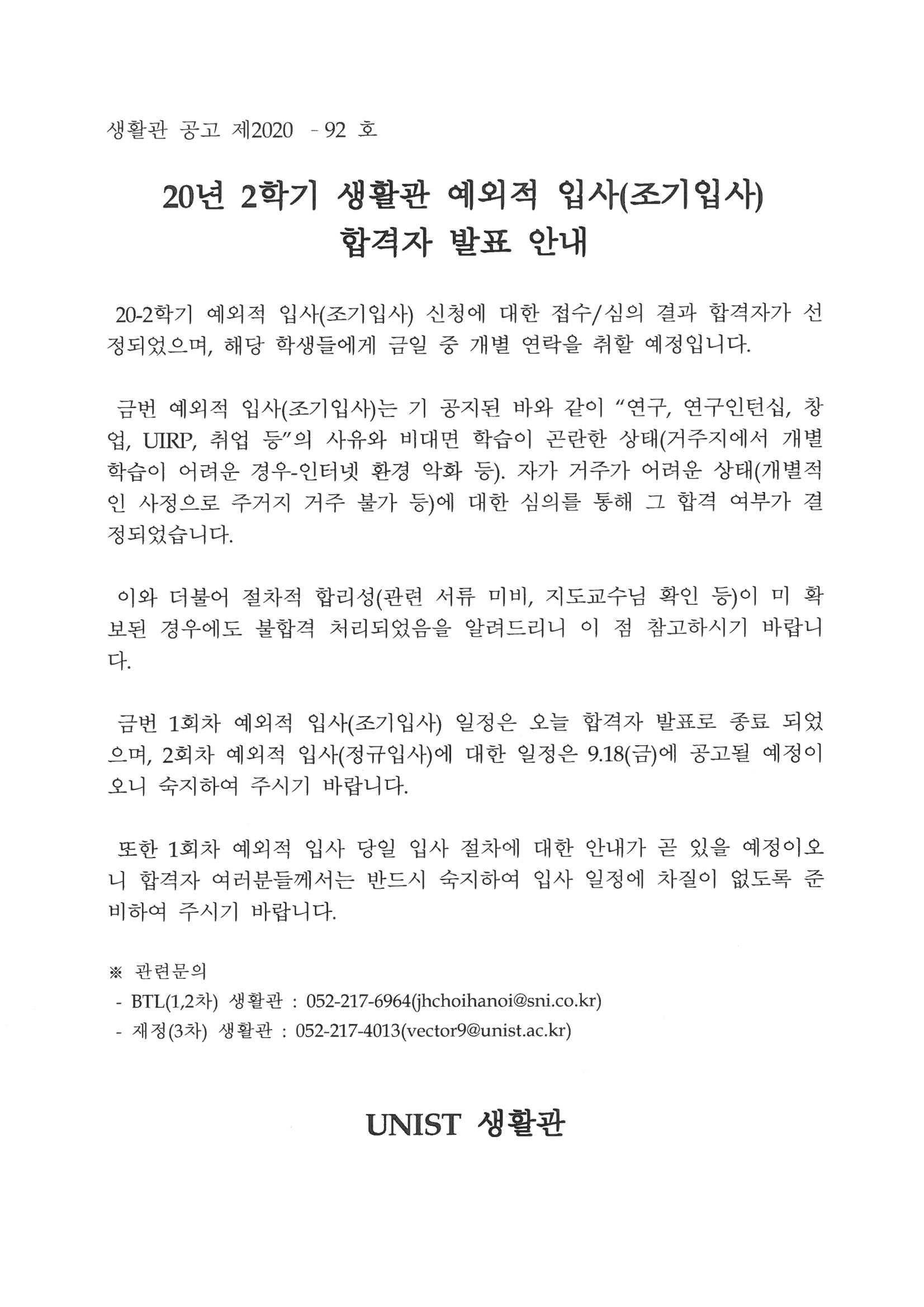 | 408 | (No.2020-92) 20년 2학기 생활관 예외적 입사(조기입사) 합.. | 2020-09-17 | 2461 |