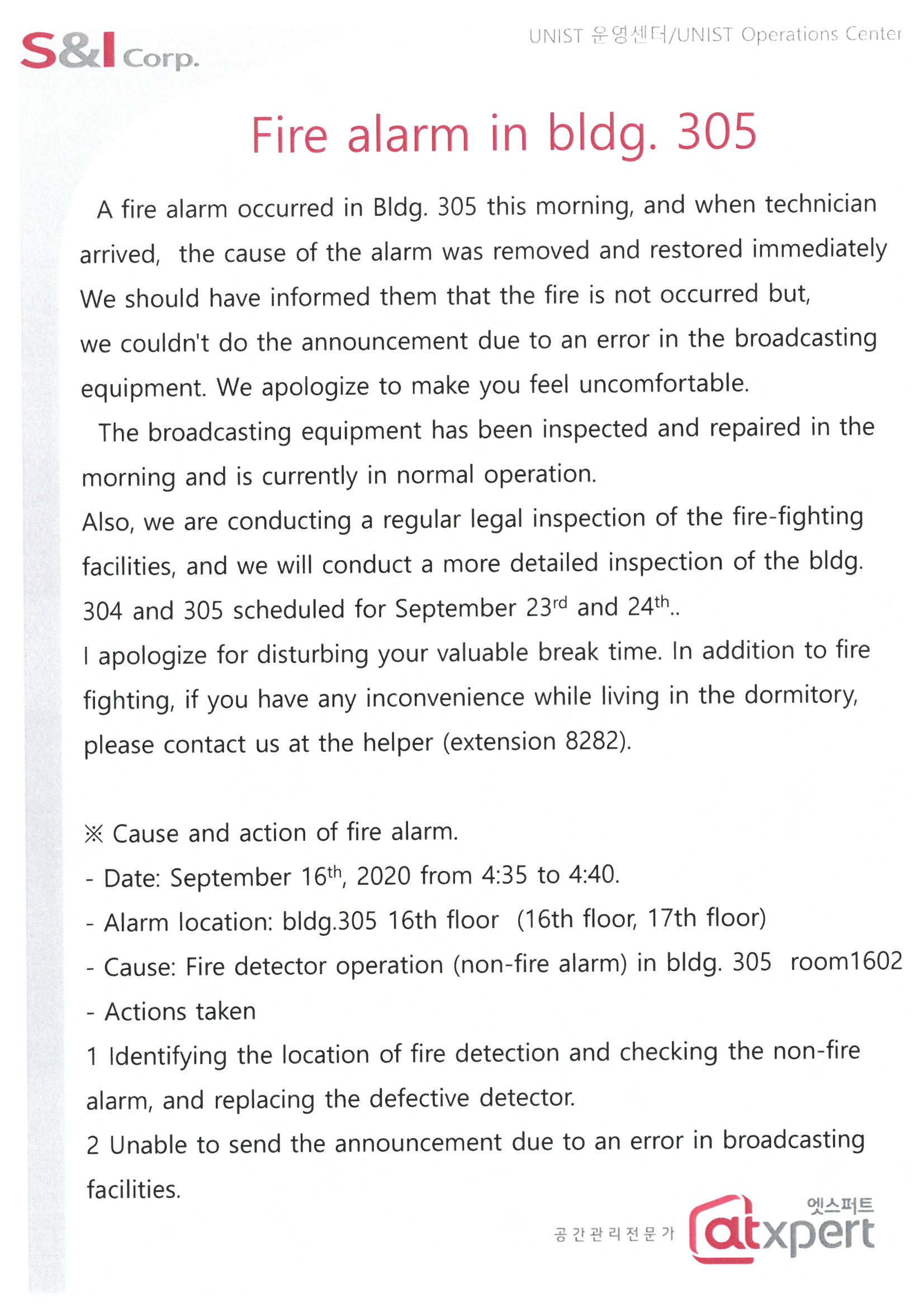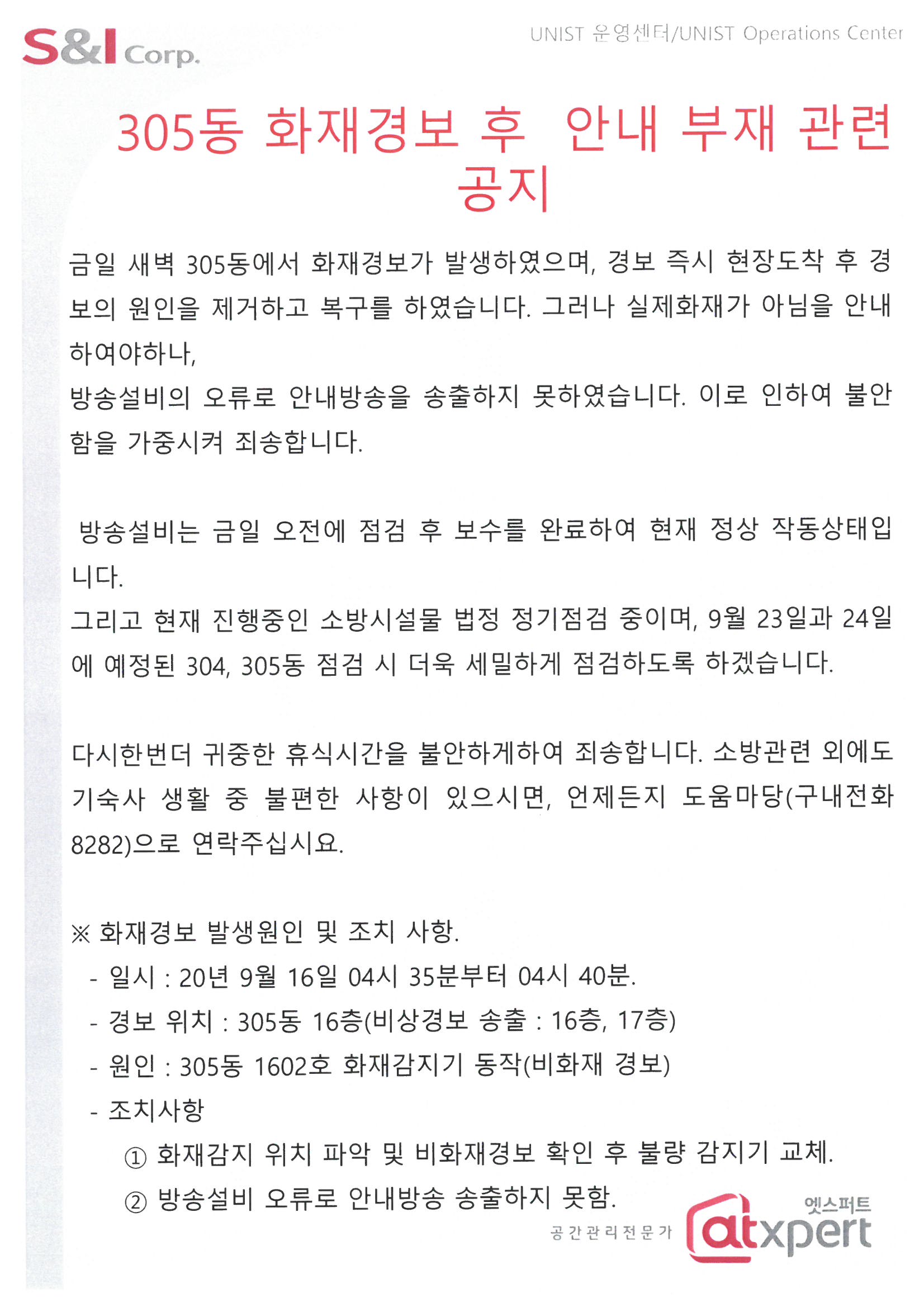 | 407 | 305동 화재경보 후 안내 부재 관련 공지(Fire alarm in bldg.. | 2020-09-16 | 2289 |