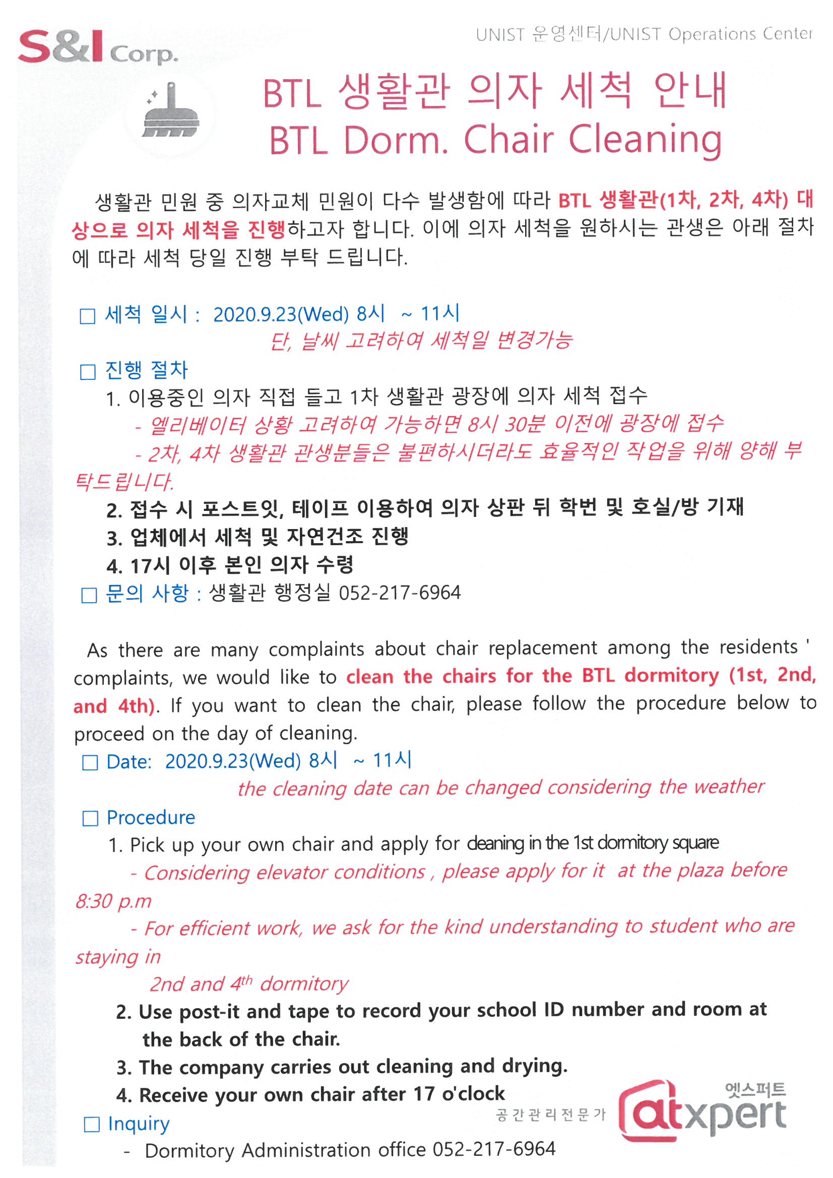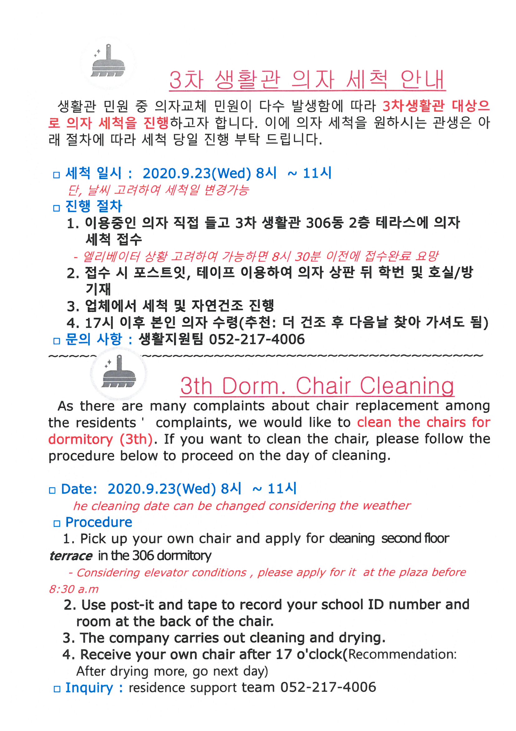 | 409 | 생활관 의자 세척 안내(Dorm Chair Cleaning) | 2020-09-18 | 1541 |