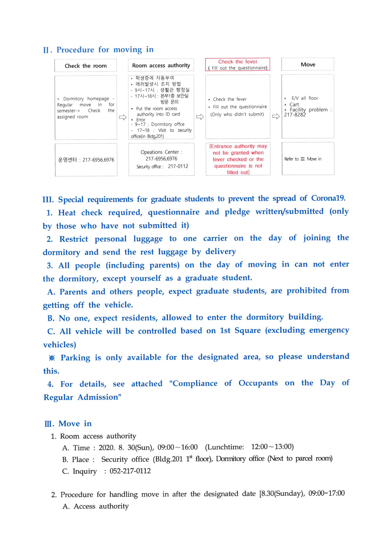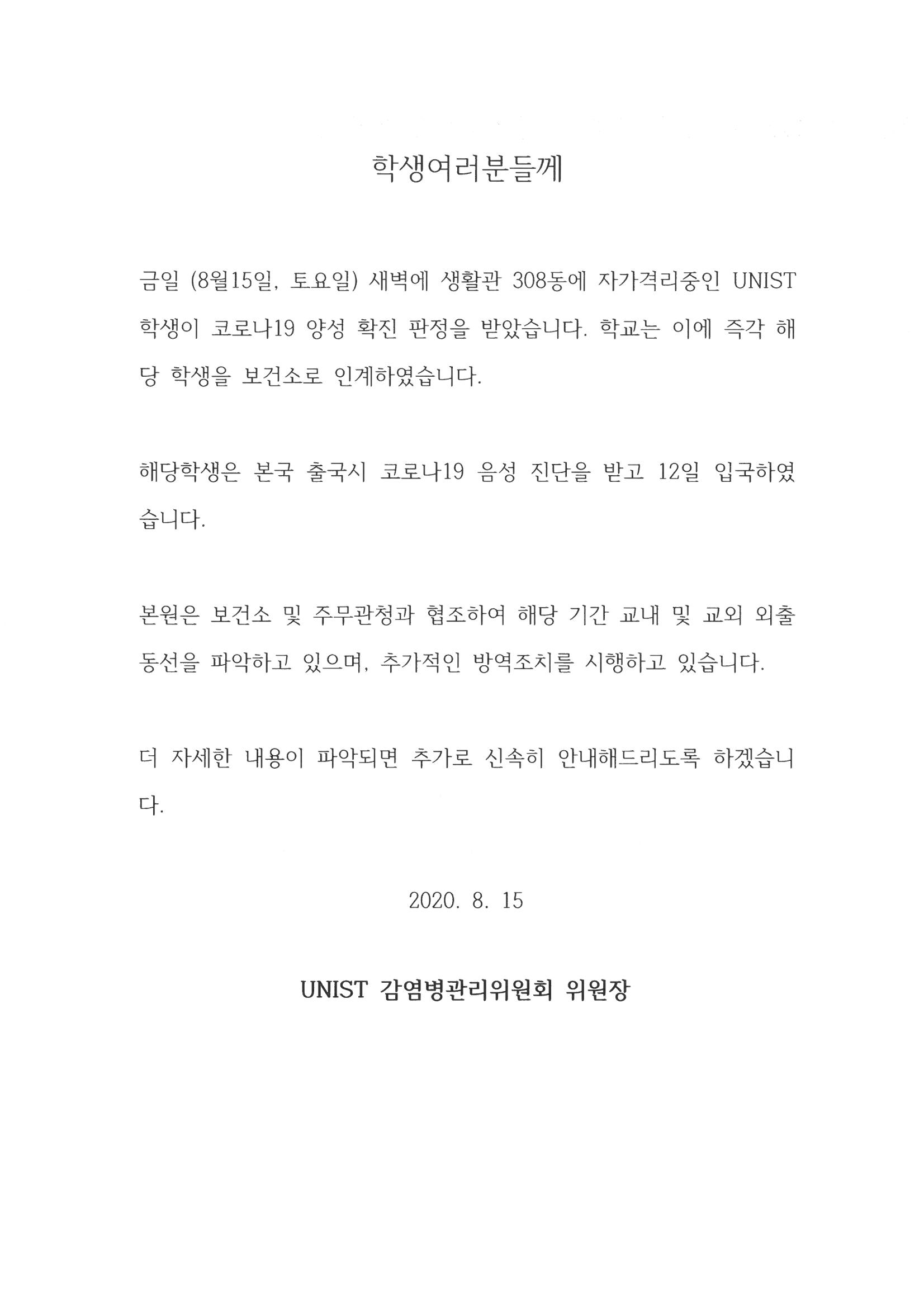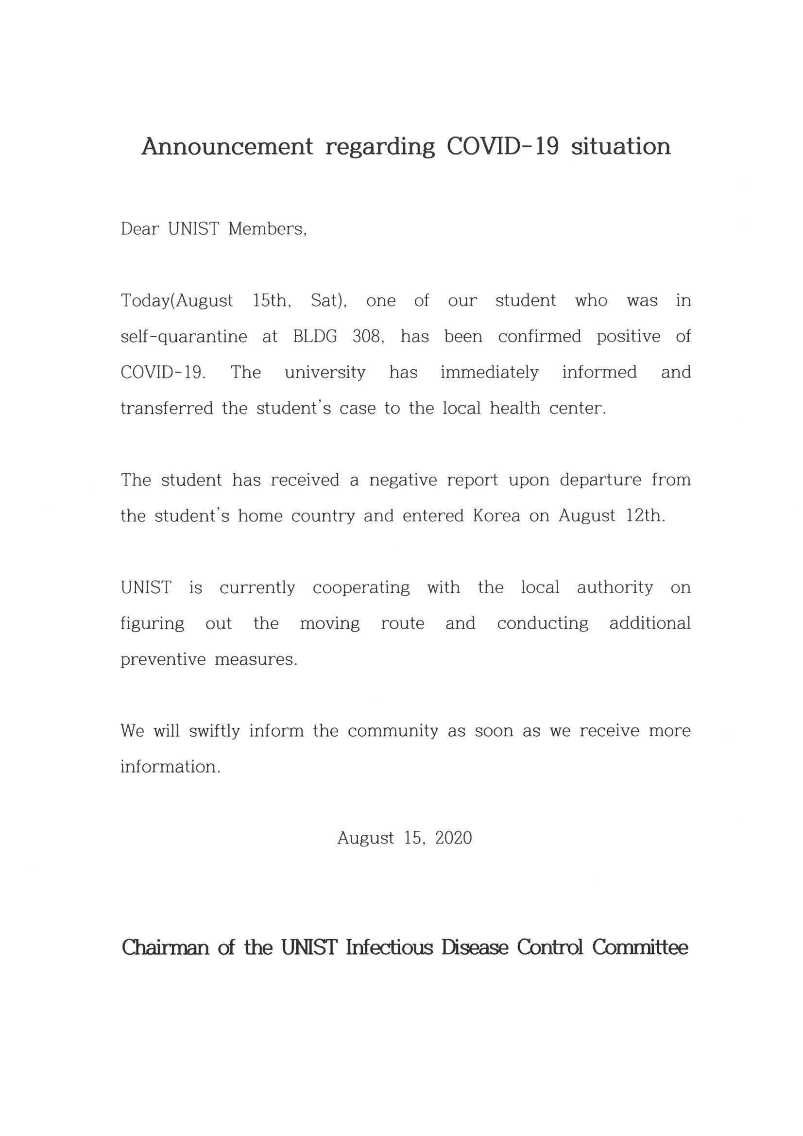 | 392 | 코로나 확진 관련 안내문[Announcement regarding COVID-19 .. | 2020-08-15 | 2203 |