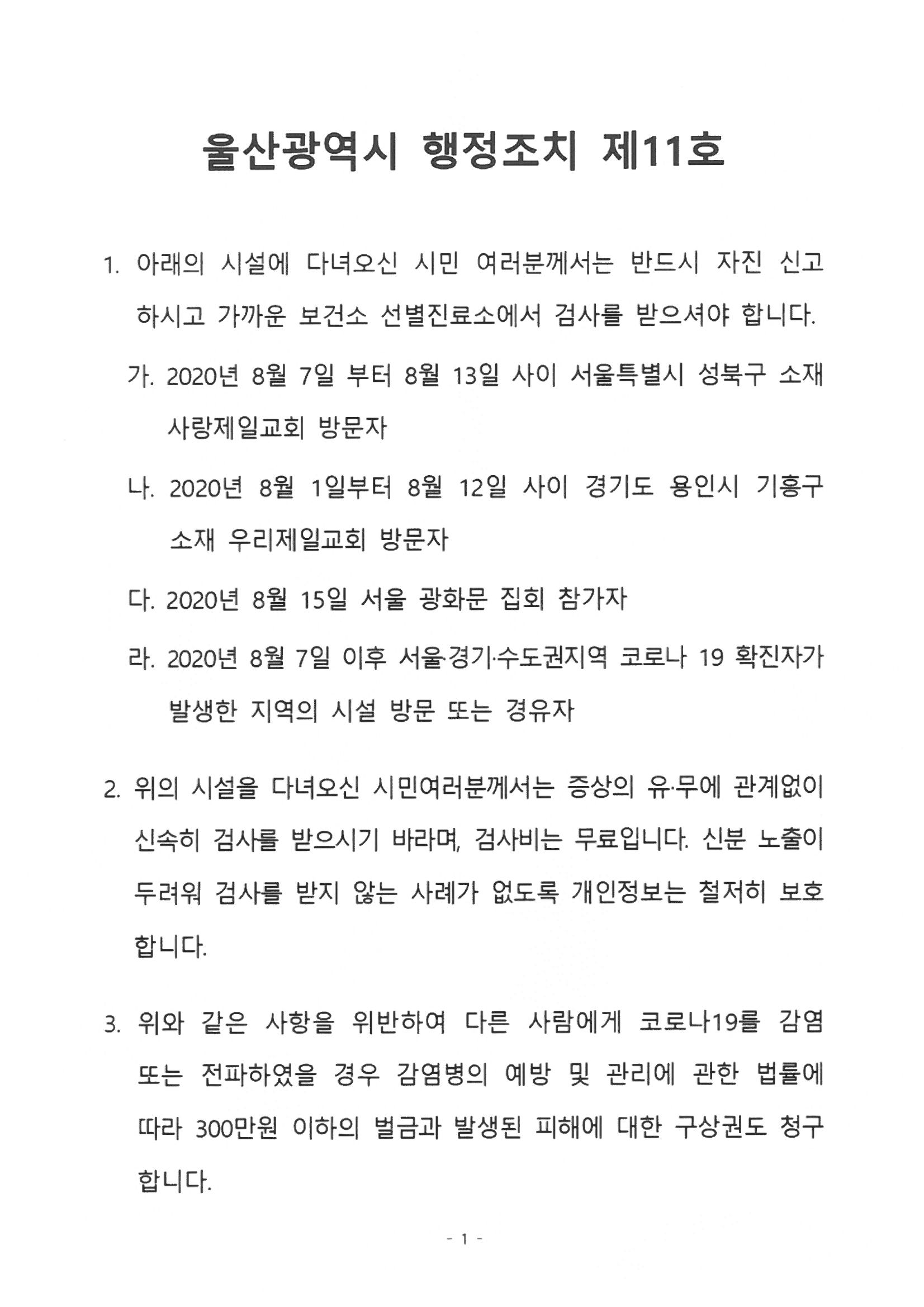 | 393 | 코로나 관련 울산광역시 행정조치 제11호 | 2020-08-18 | 1907 |
