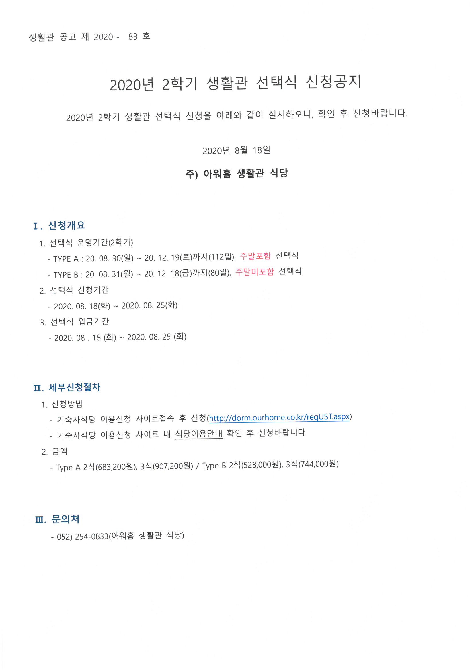 | 396 | (No.2020-83) 2020년 2학기 생활관 선택식 신청공지 | 2020-08-19 | 2688 |