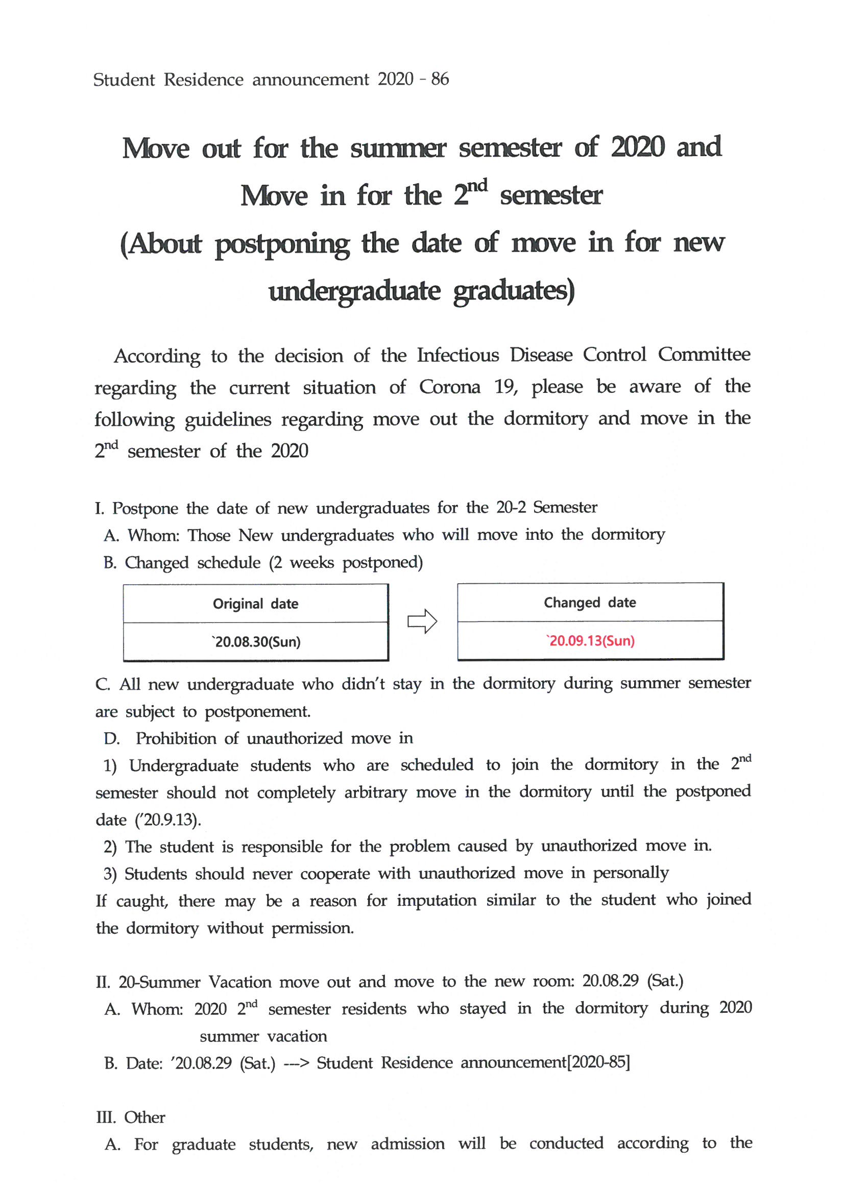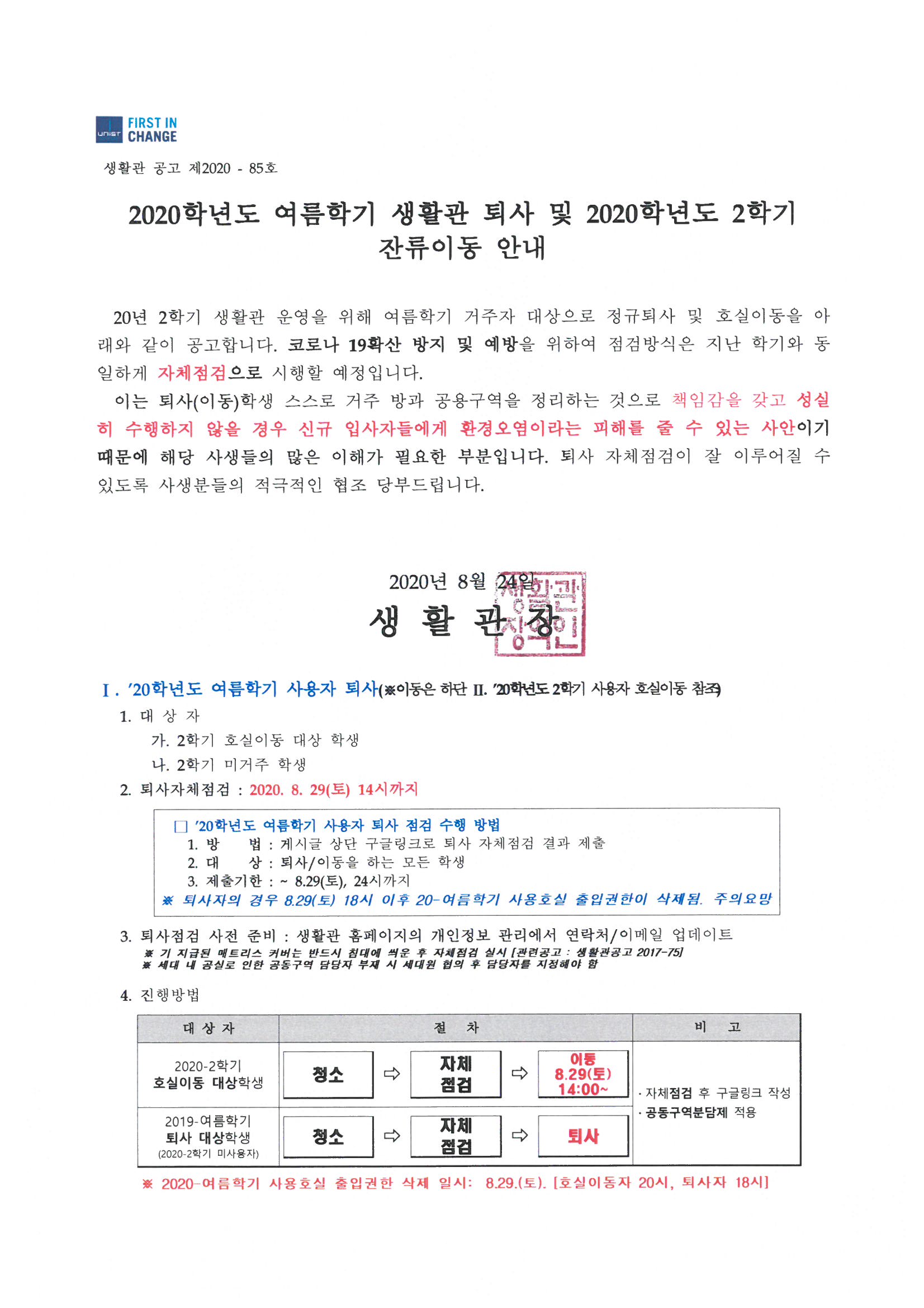 | 399 | (No.2020-85) 2020학년도 여름학기 생활관 퇴사 및 2020학년.. | 2020-08-24 | 4266 |