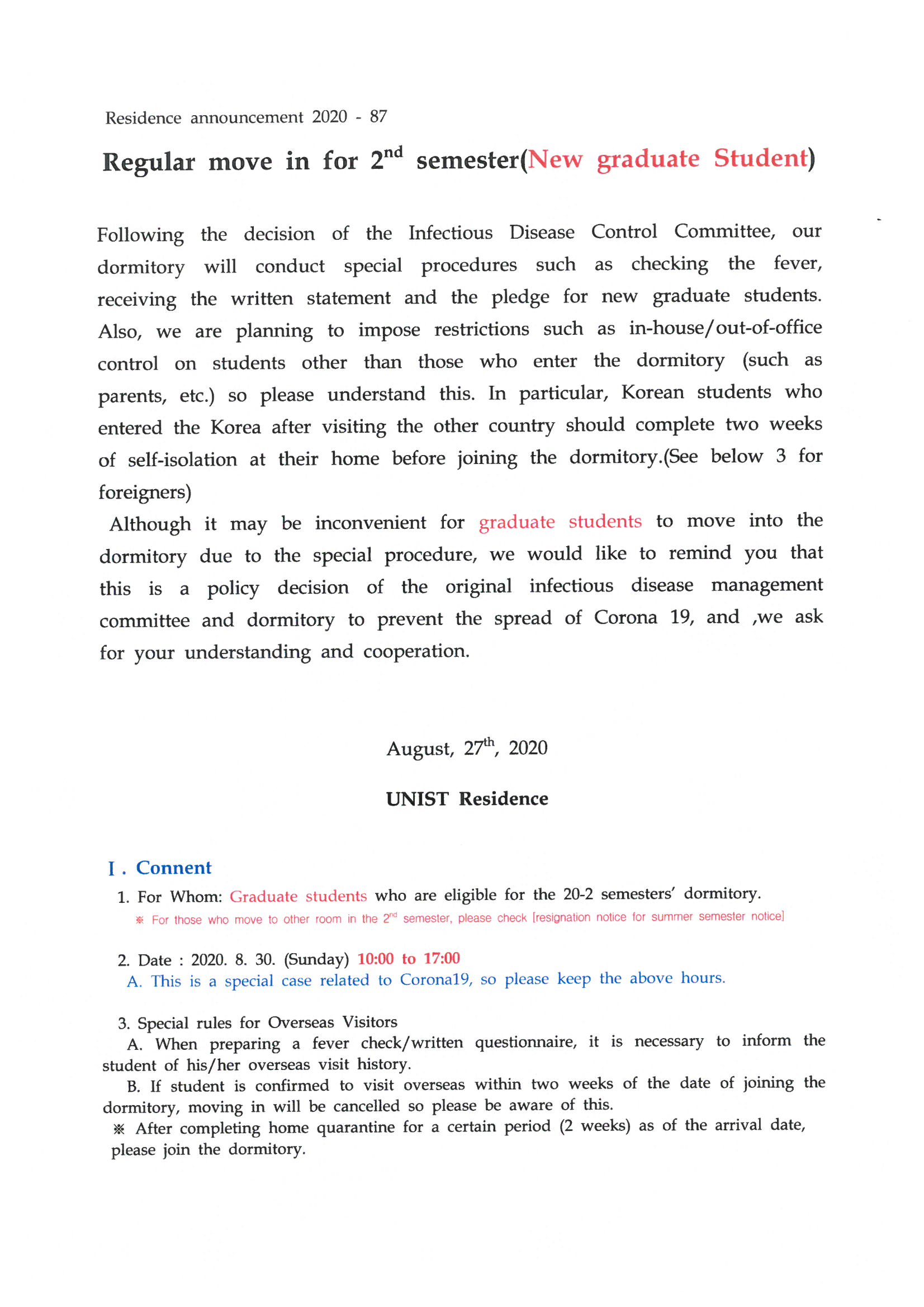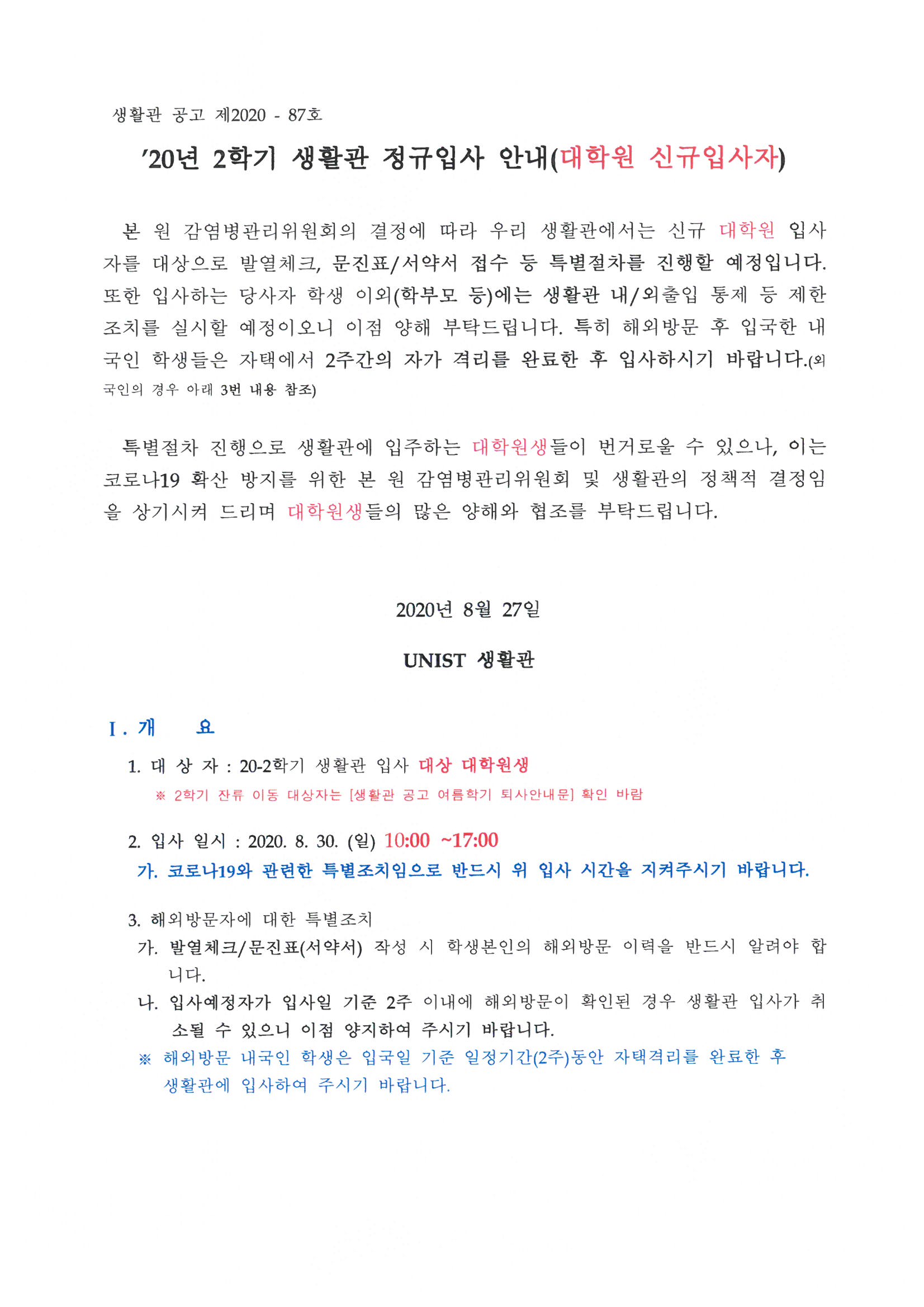 | 401 | (No.2020-87) ’20년 2학기 생활관 정규입사 안내(대학원 신.. | 2020-08-27 | 4098 |