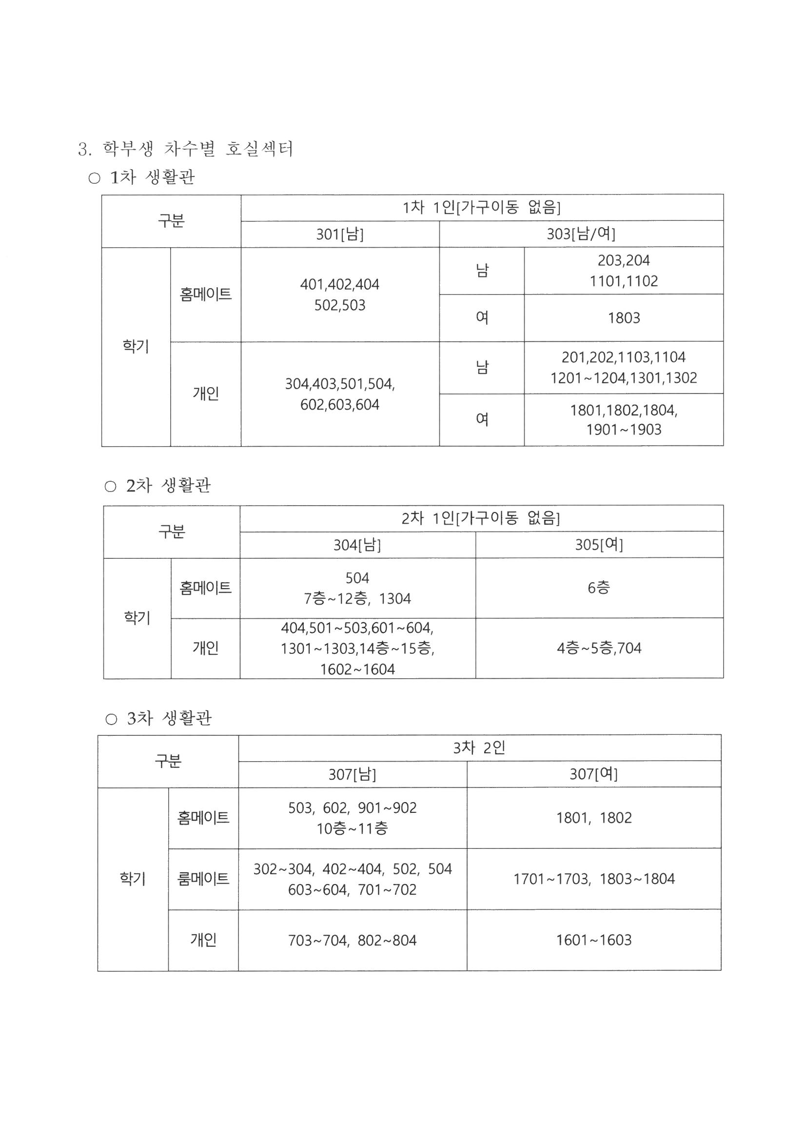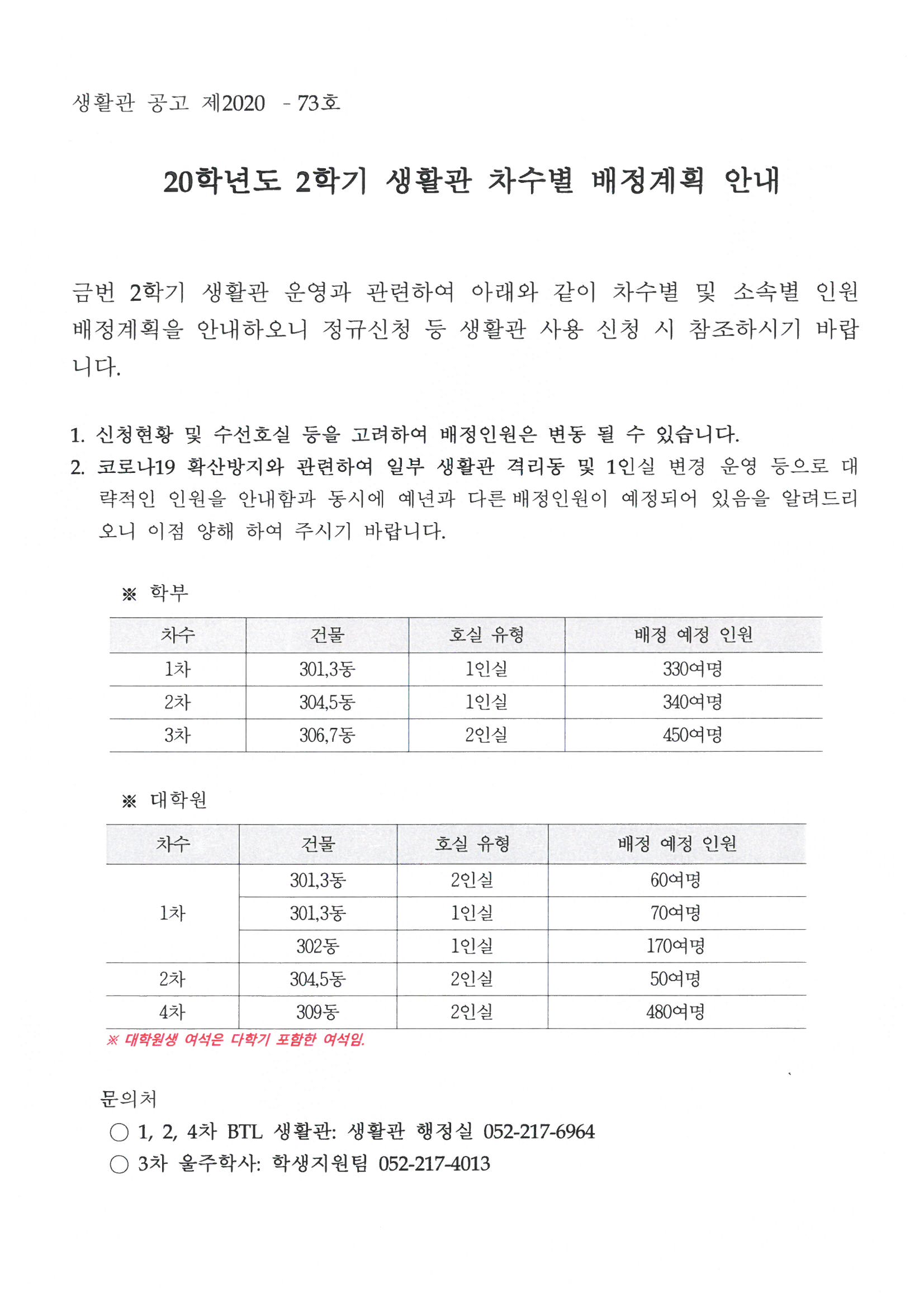 | 382 | (No.2020-73) 20학년도 2학기 생활관 차수별 배정계획 안내 | 2020-07-27 | 3685 |