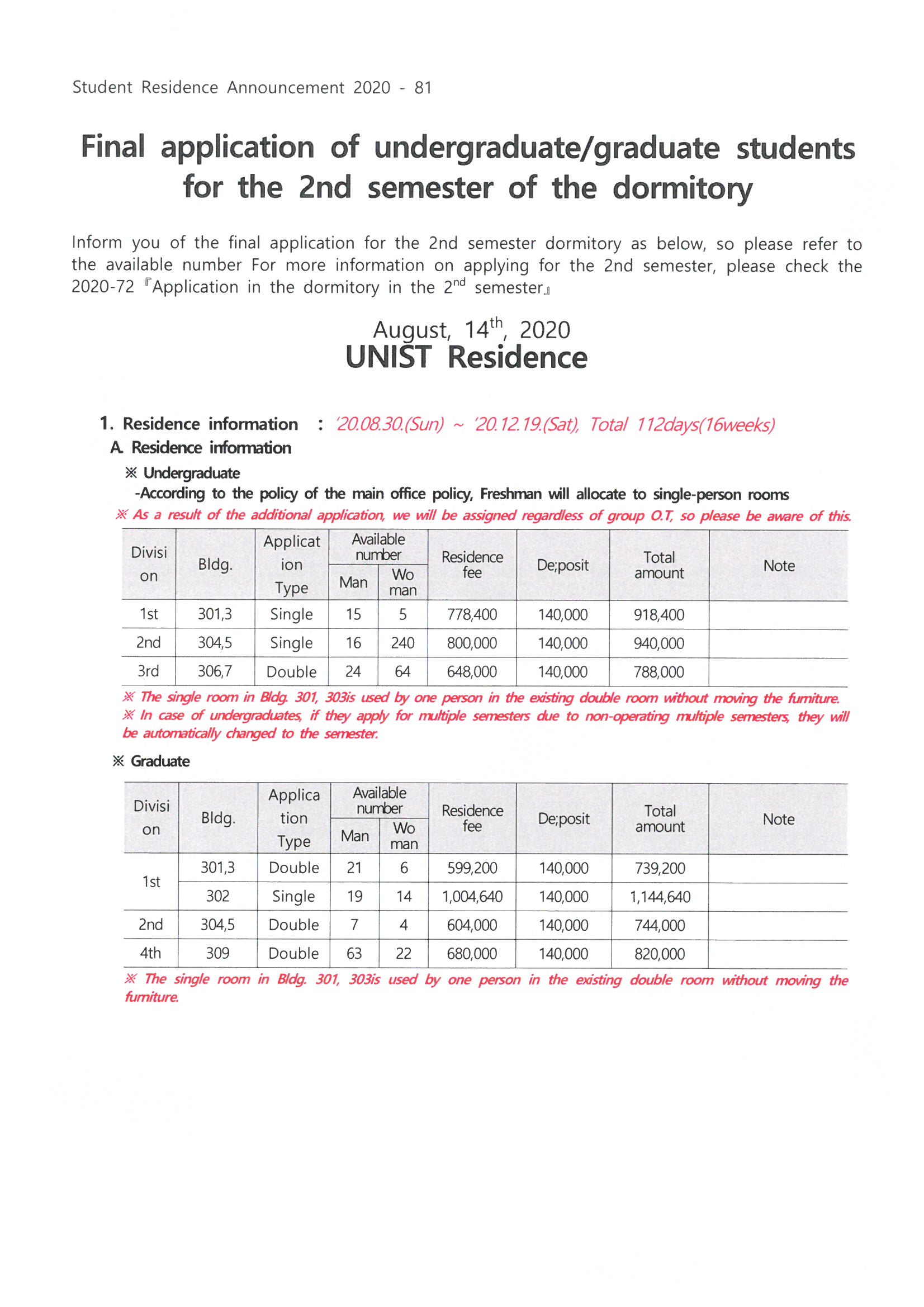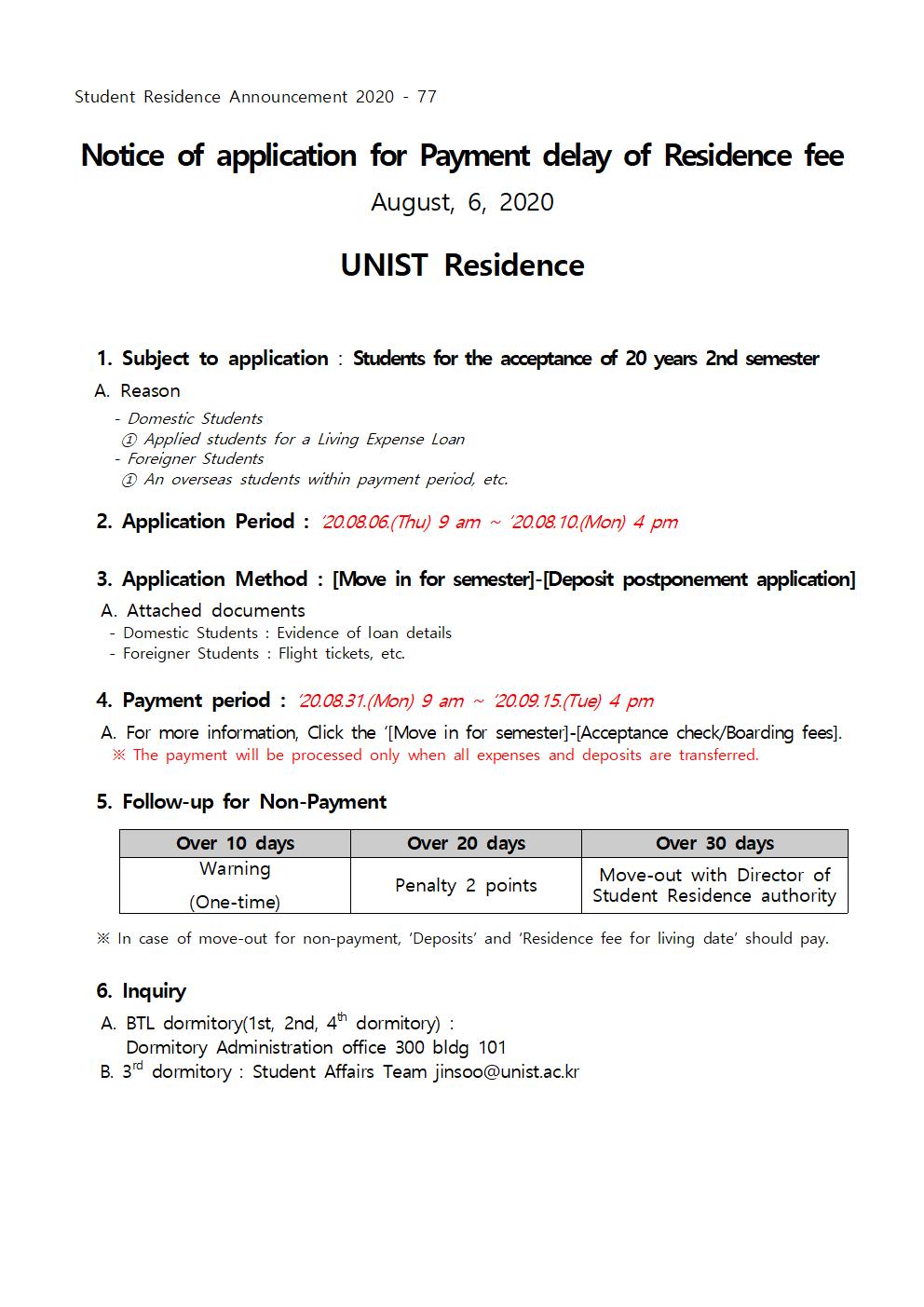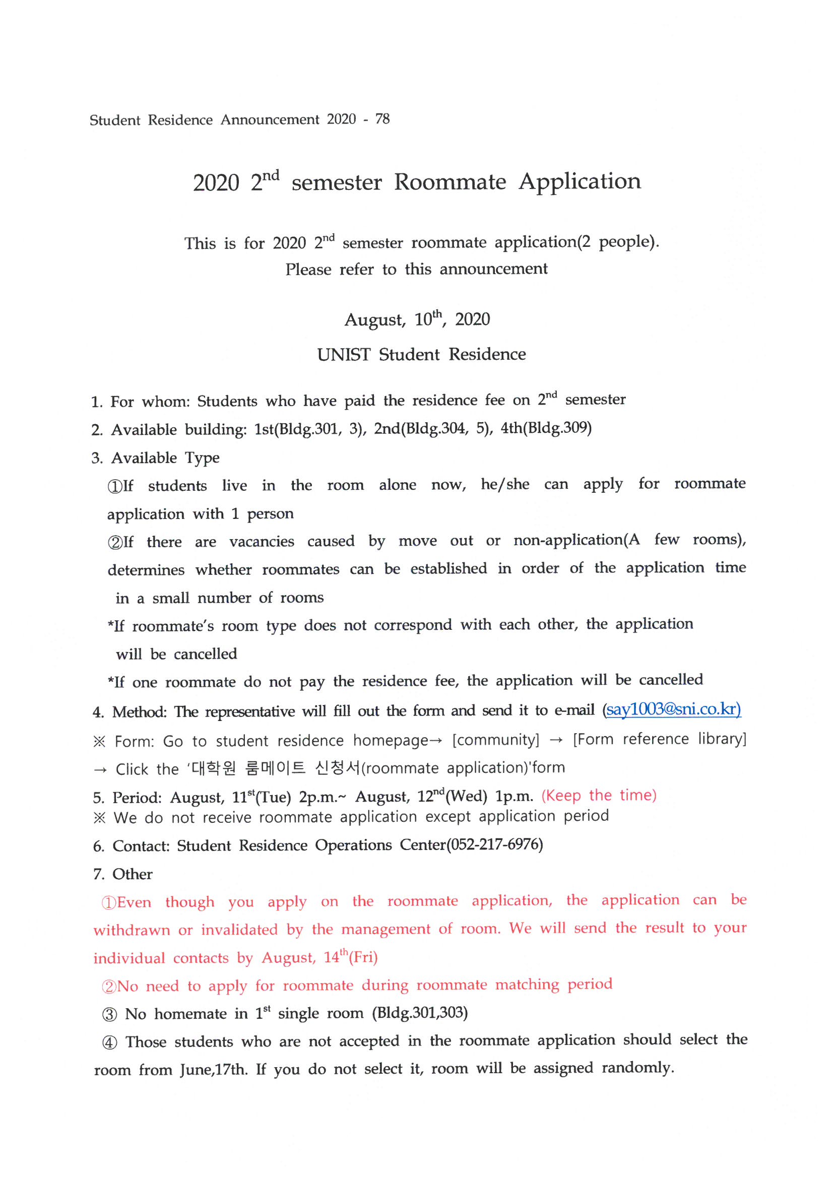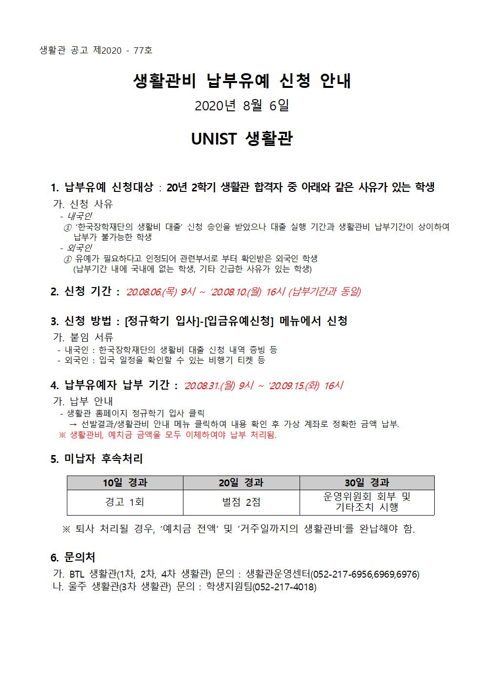 | 387 | (No.2020-77) 생활관비 납부유예 신청 안내(Notice of appli.. | 2020-08-06 | 2430 |