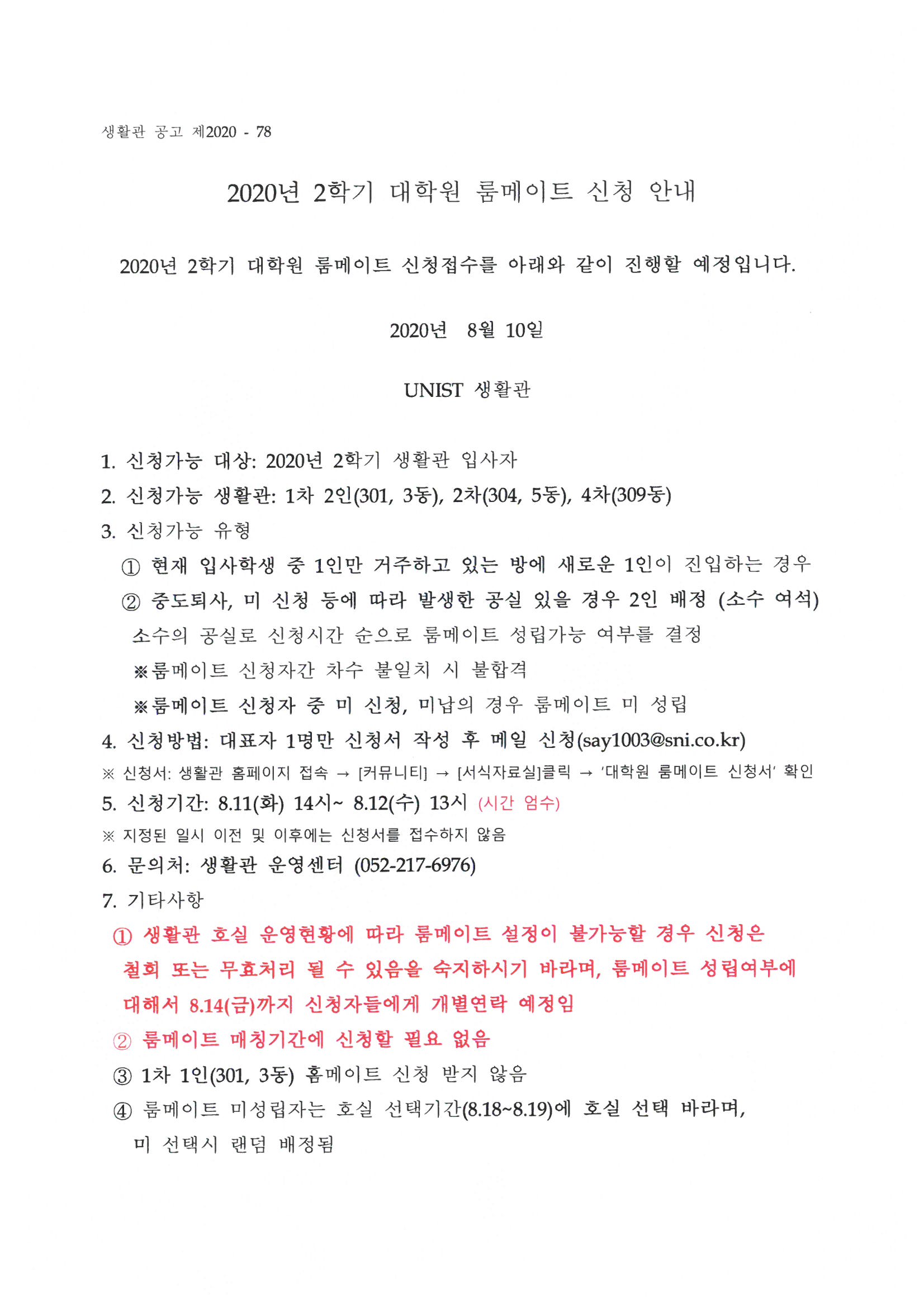 | 388 | (No.2020-78) 2020년 2학기 대학원 룸메이트 신청 안내(2020.. | 2020-08-10 | 1878 |