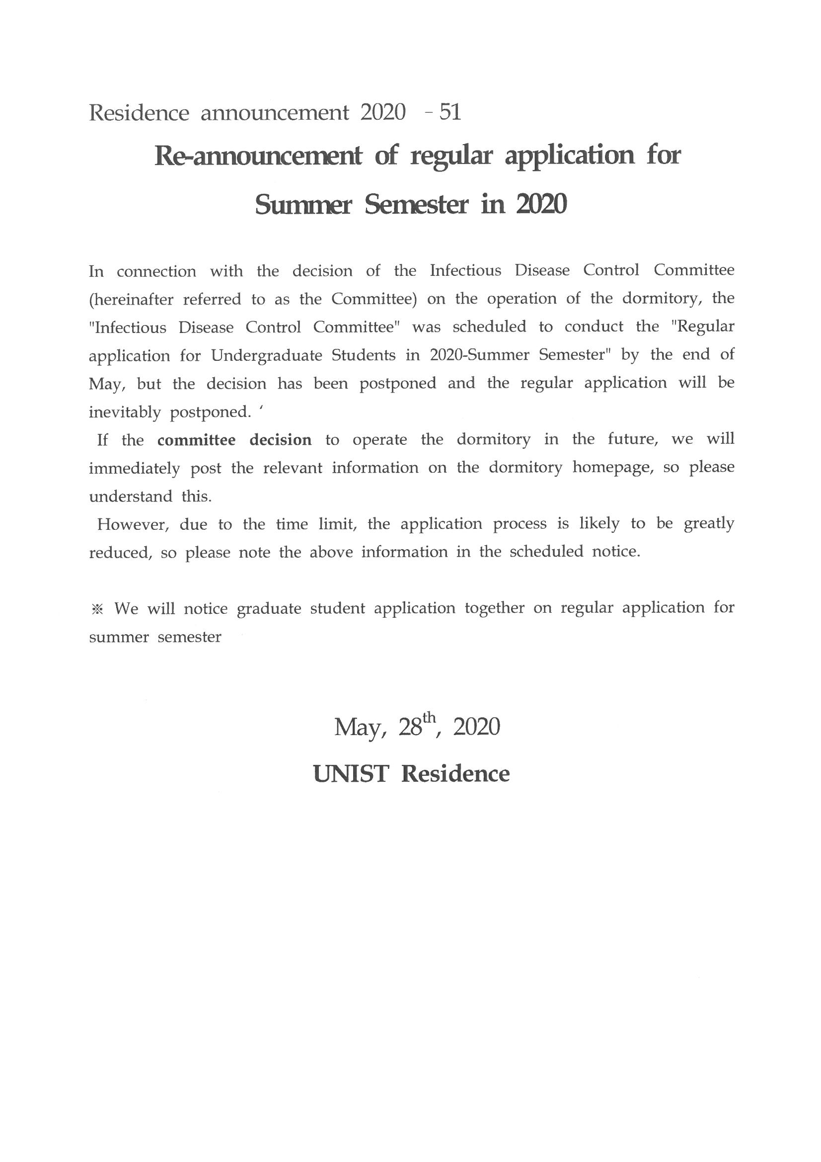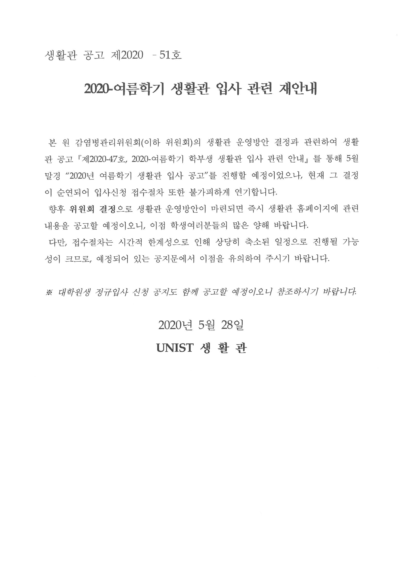 | 352 | (No.2020-51) 2020-여름학기 생활관 입사 관련 재안내(Re-an.. | 2020-05-28 | 2591 |
