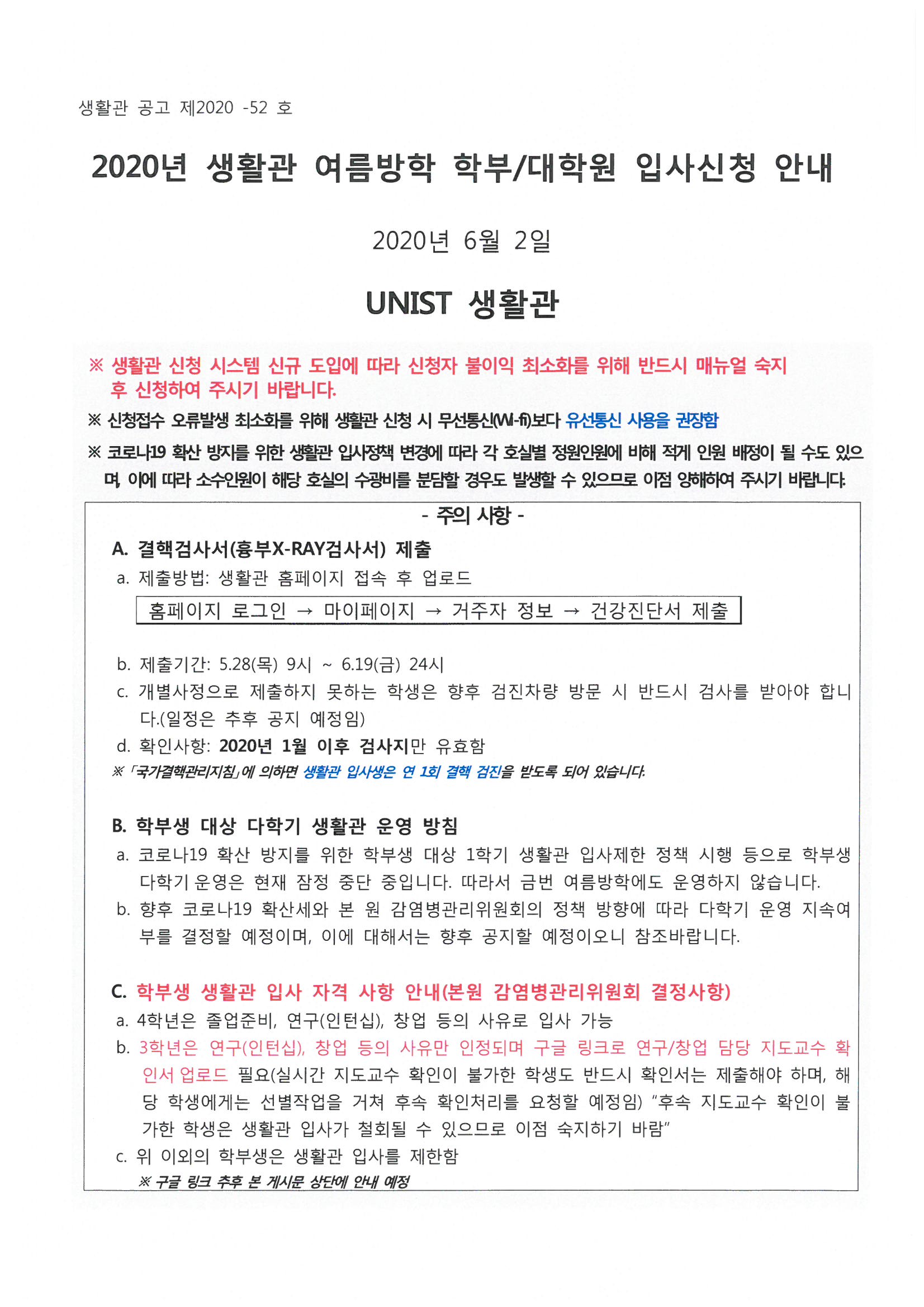 | 354 | (수정) (No.2020-52) 2020년 생활관 여름방학 학부/대학원 .. | 2020-06-02 | 6593 |