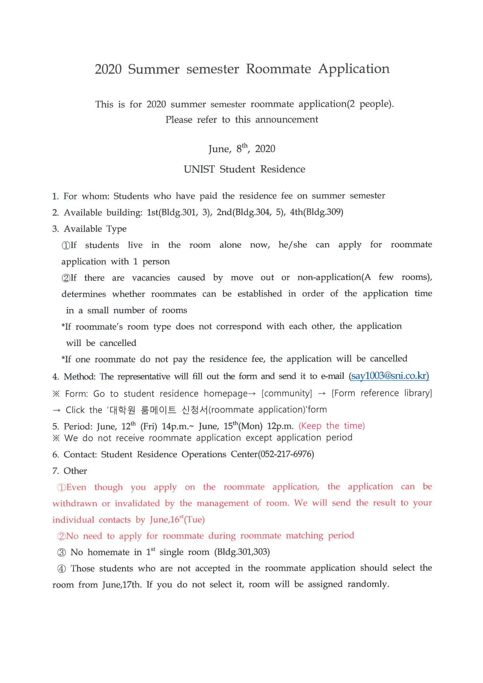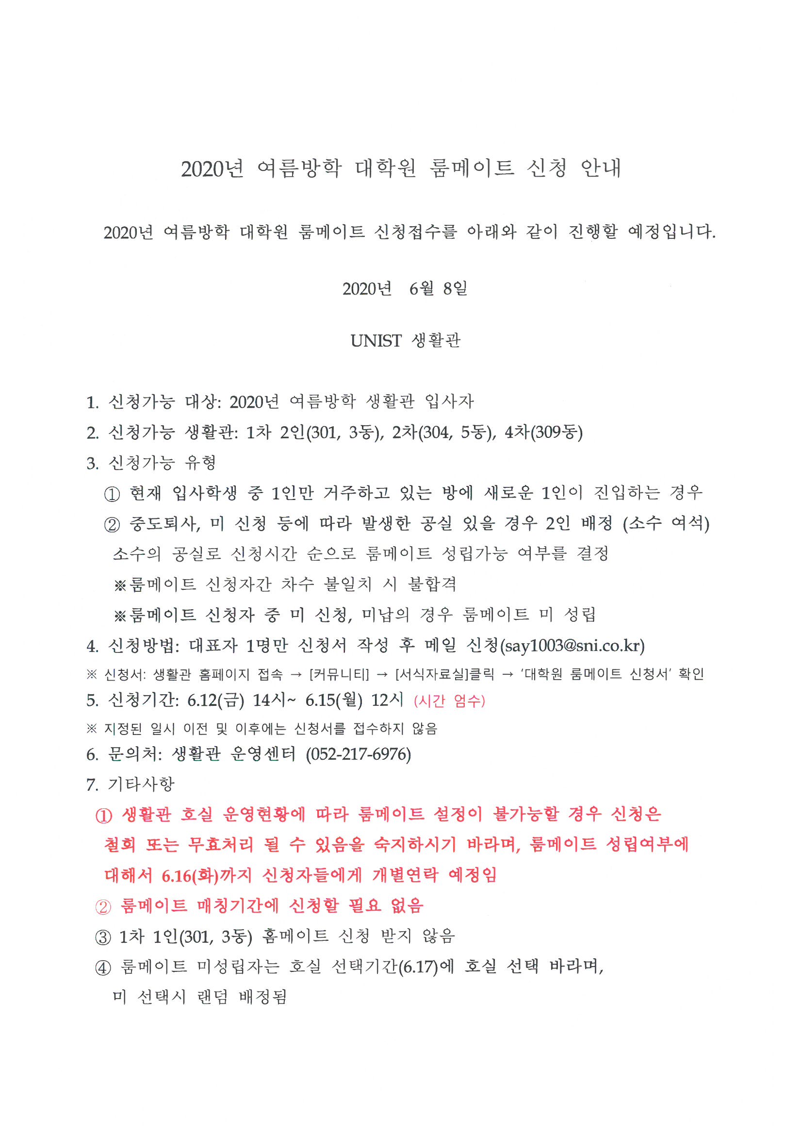 | 358 | 2020년 여름방학 대학원 룸메이트 신청 안내(2020 Summer se.. | 2020-06-08 | 1890 |