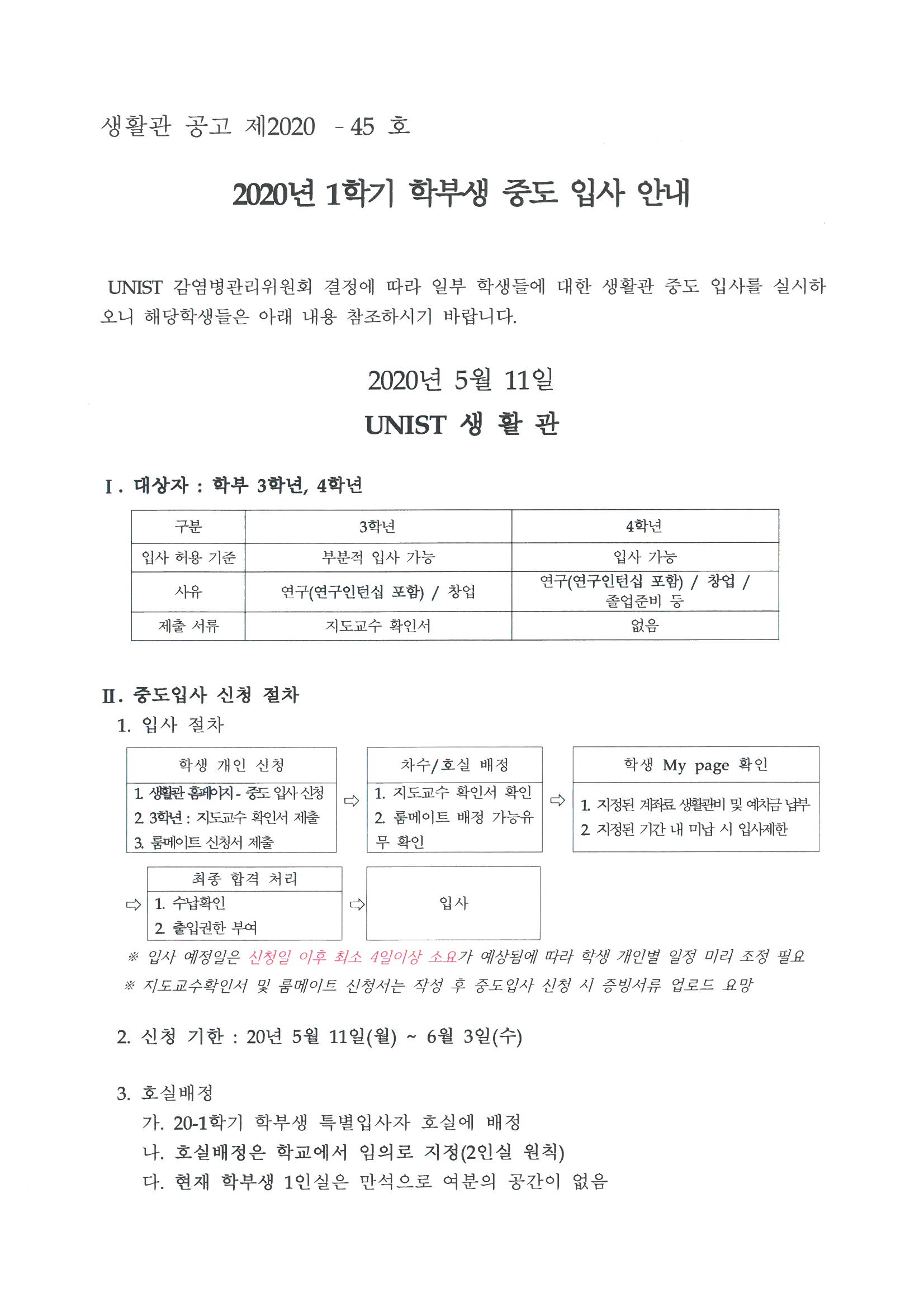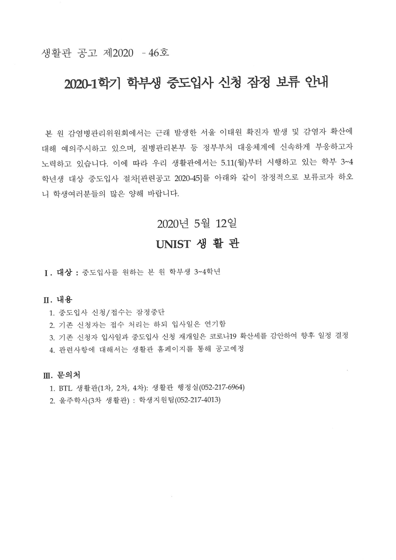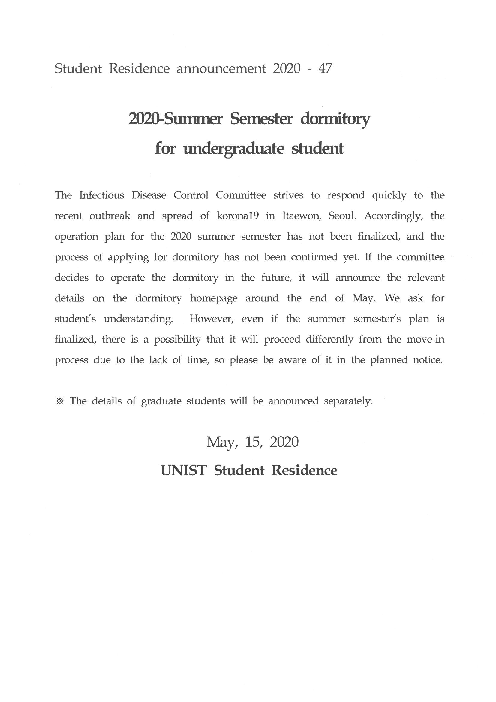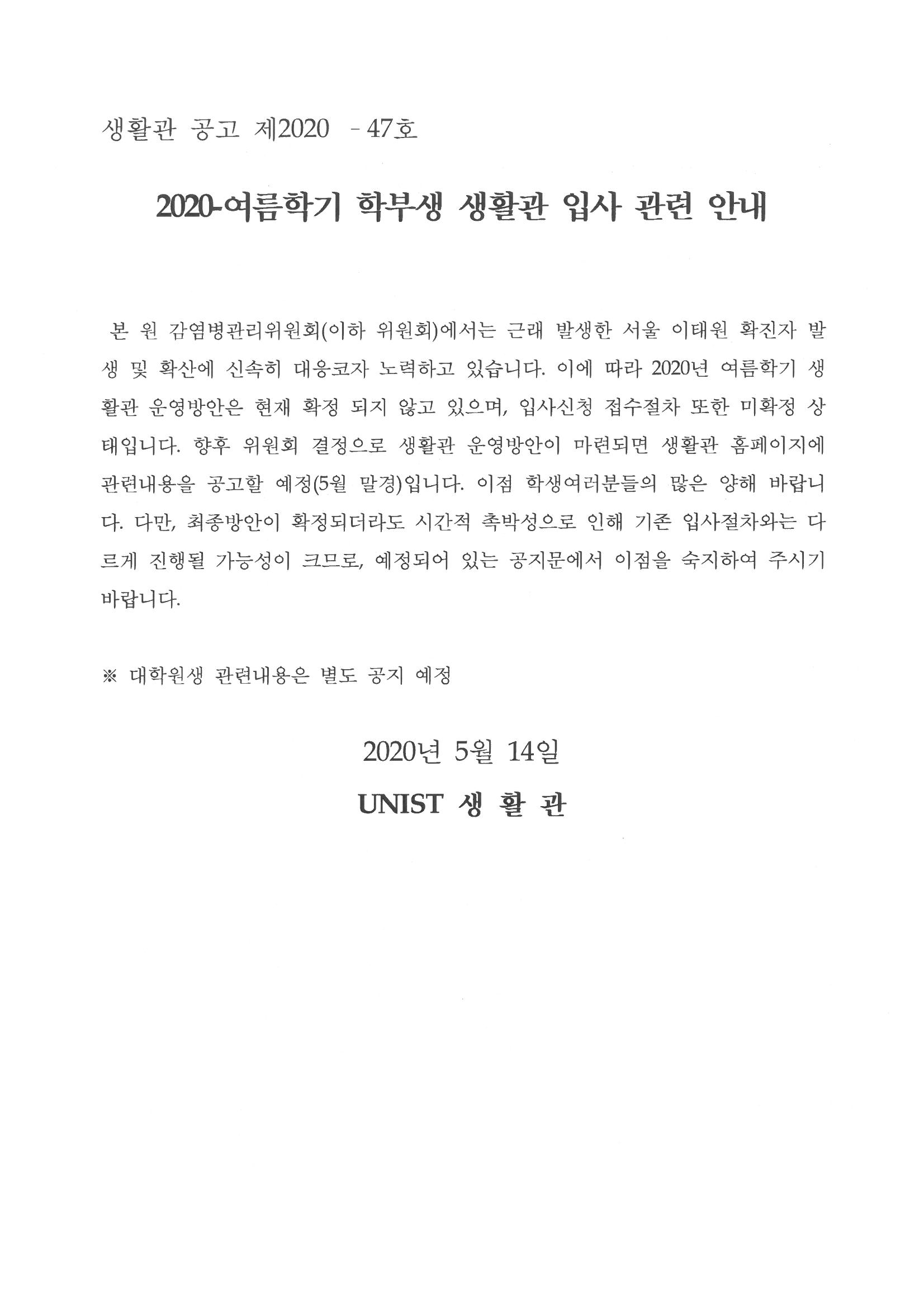 | 347 | (No.2020-47) 2020-여름학기 학부생 생활관 입사 관련 안내(.. | 2020-05-14 | 2998 |