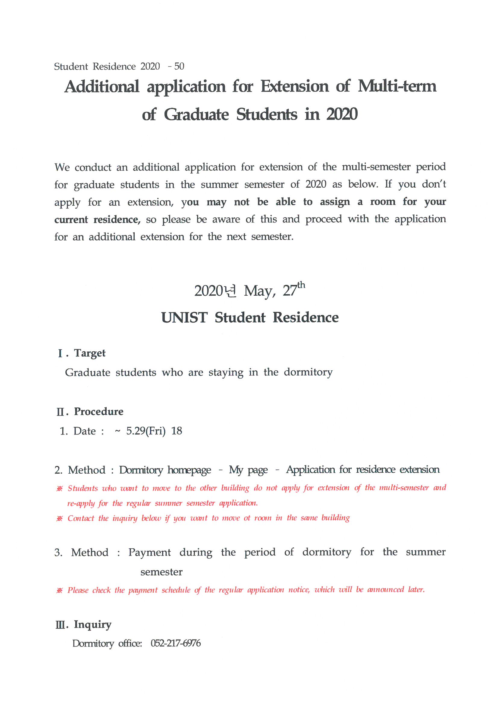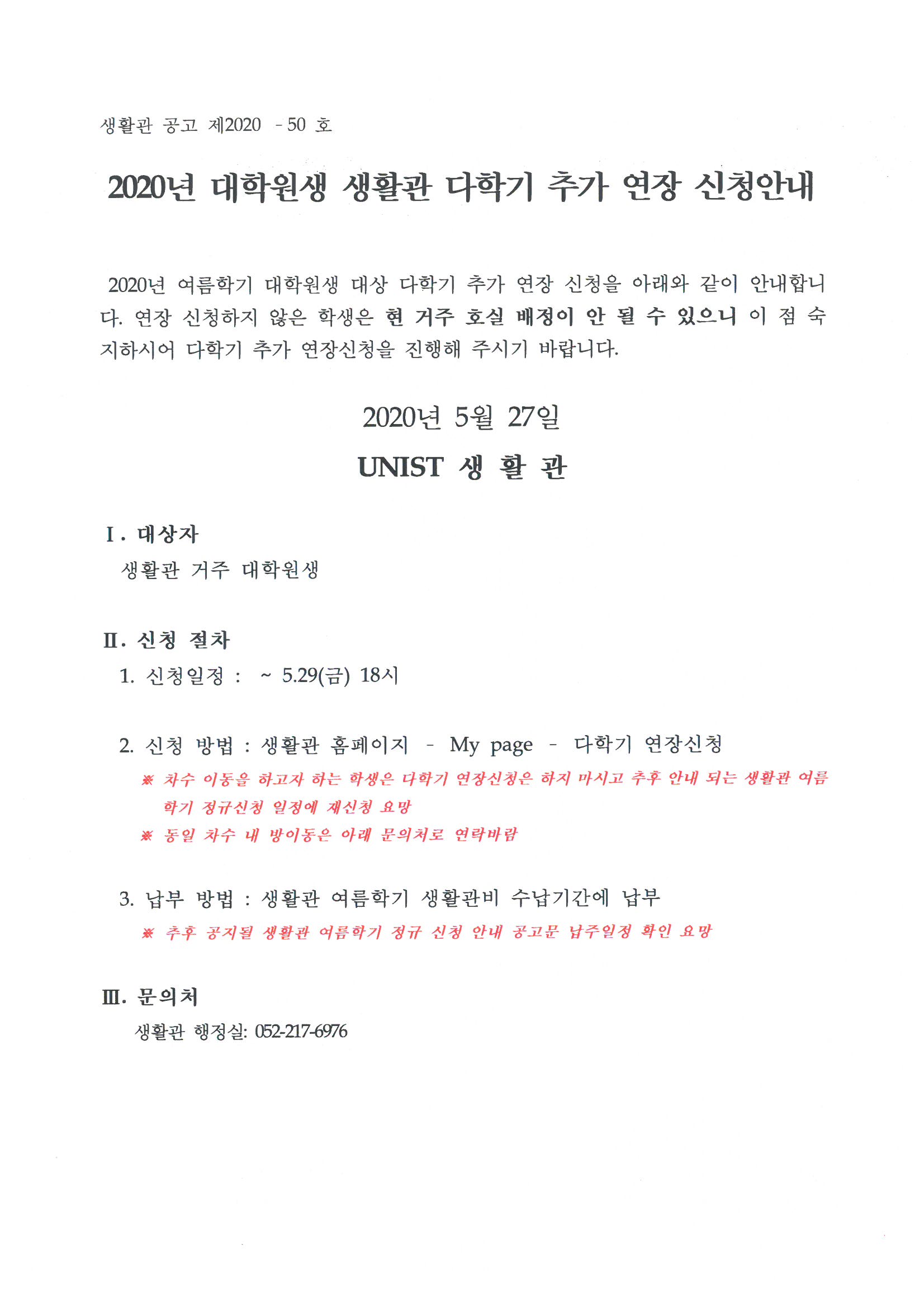 | 351 | (No.2020-50) 2020년 대학원생 생활관 다학기 추가 연장 신.. | 2020-05-27 | 2266 |