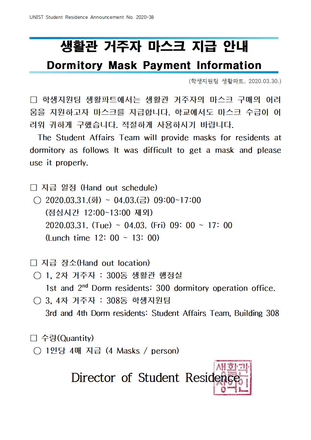 | 326 | (No.2020-38) 생활관 거주자 마스크 지급 안내(Dormitory Ma.. | 2020-03-31 | 1822 |