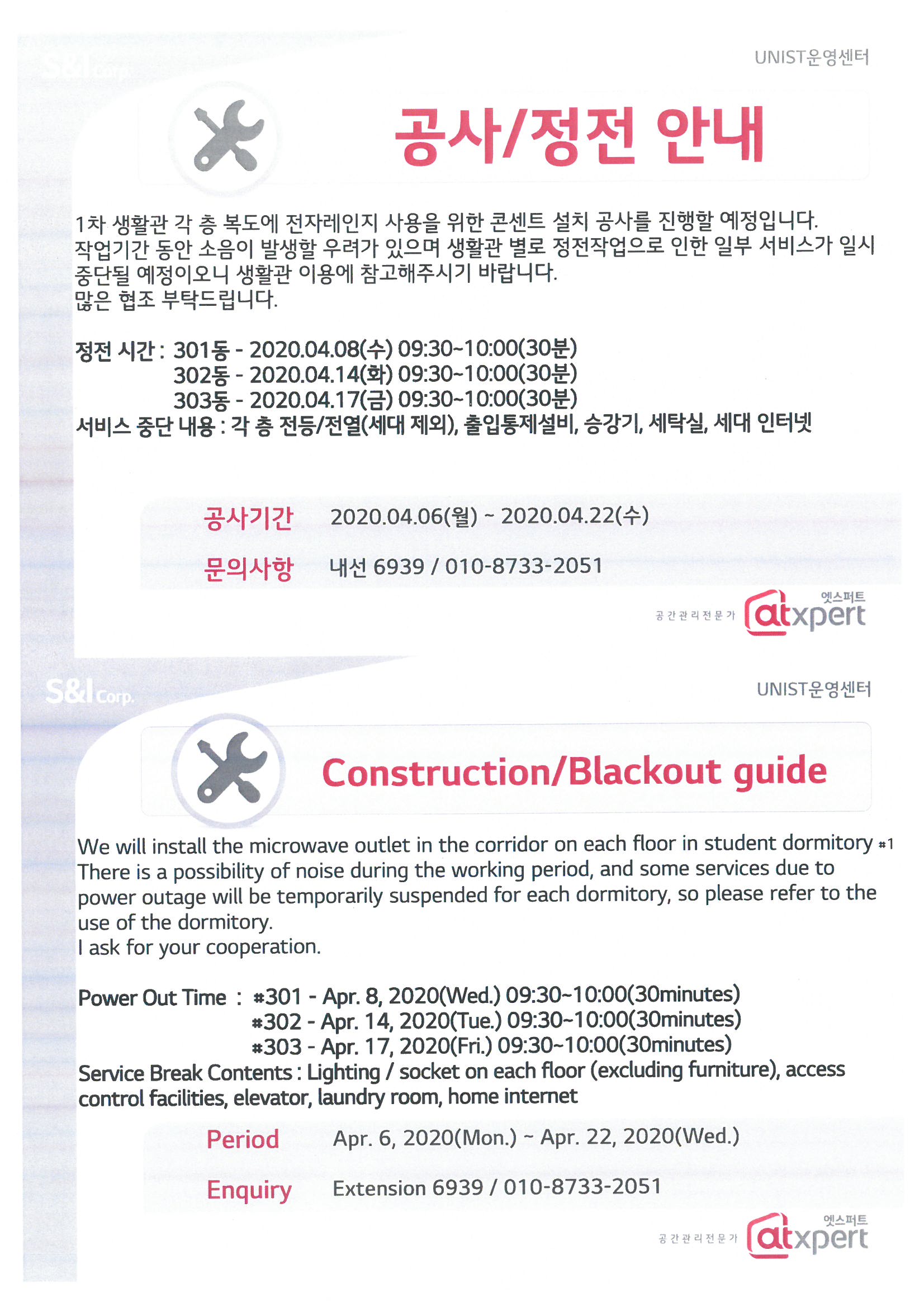 | 327 | 1차 생활관 공사/정전 안내(301~303 Dormitory Construction.. | 2020-04-02 | 1856 |