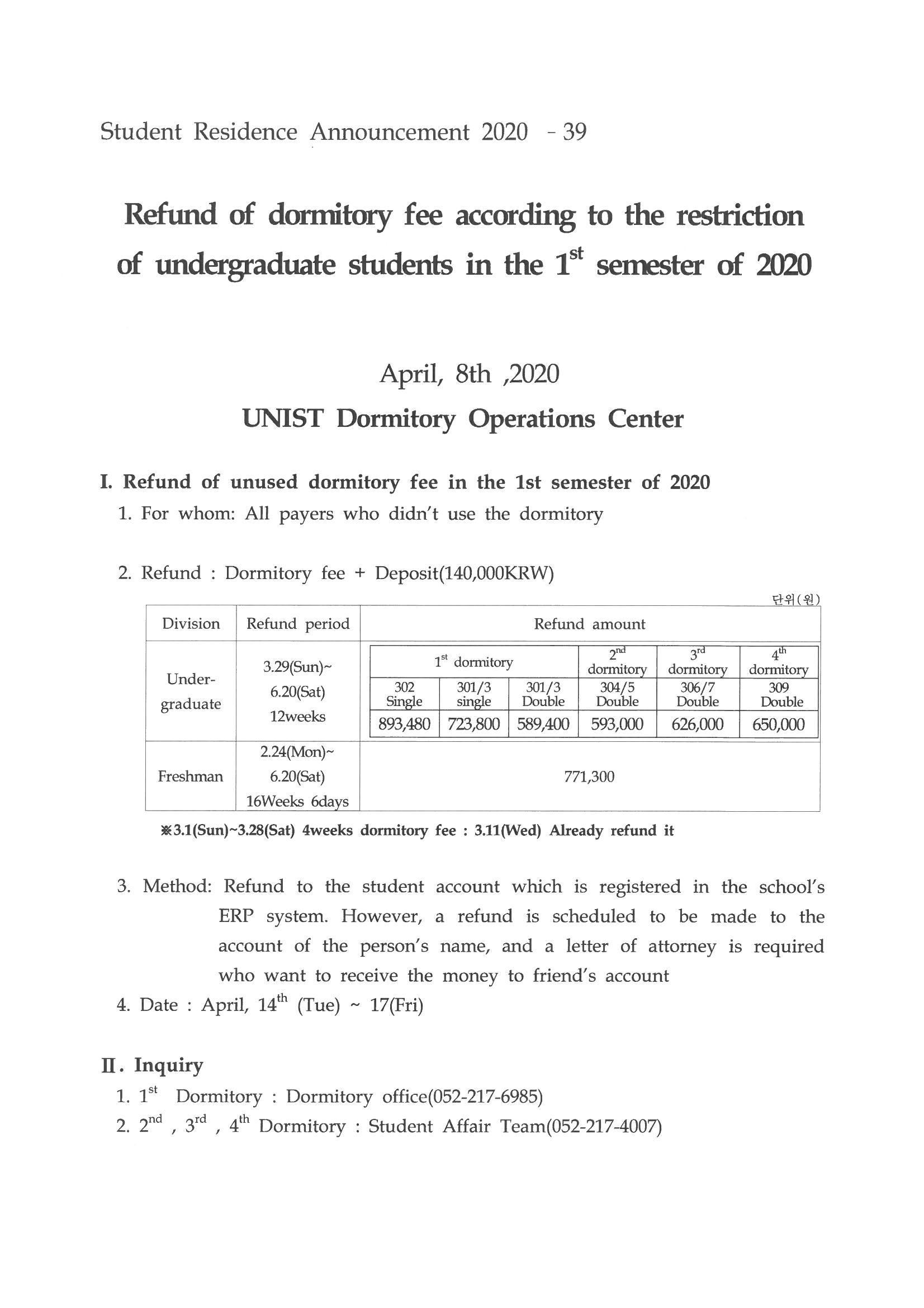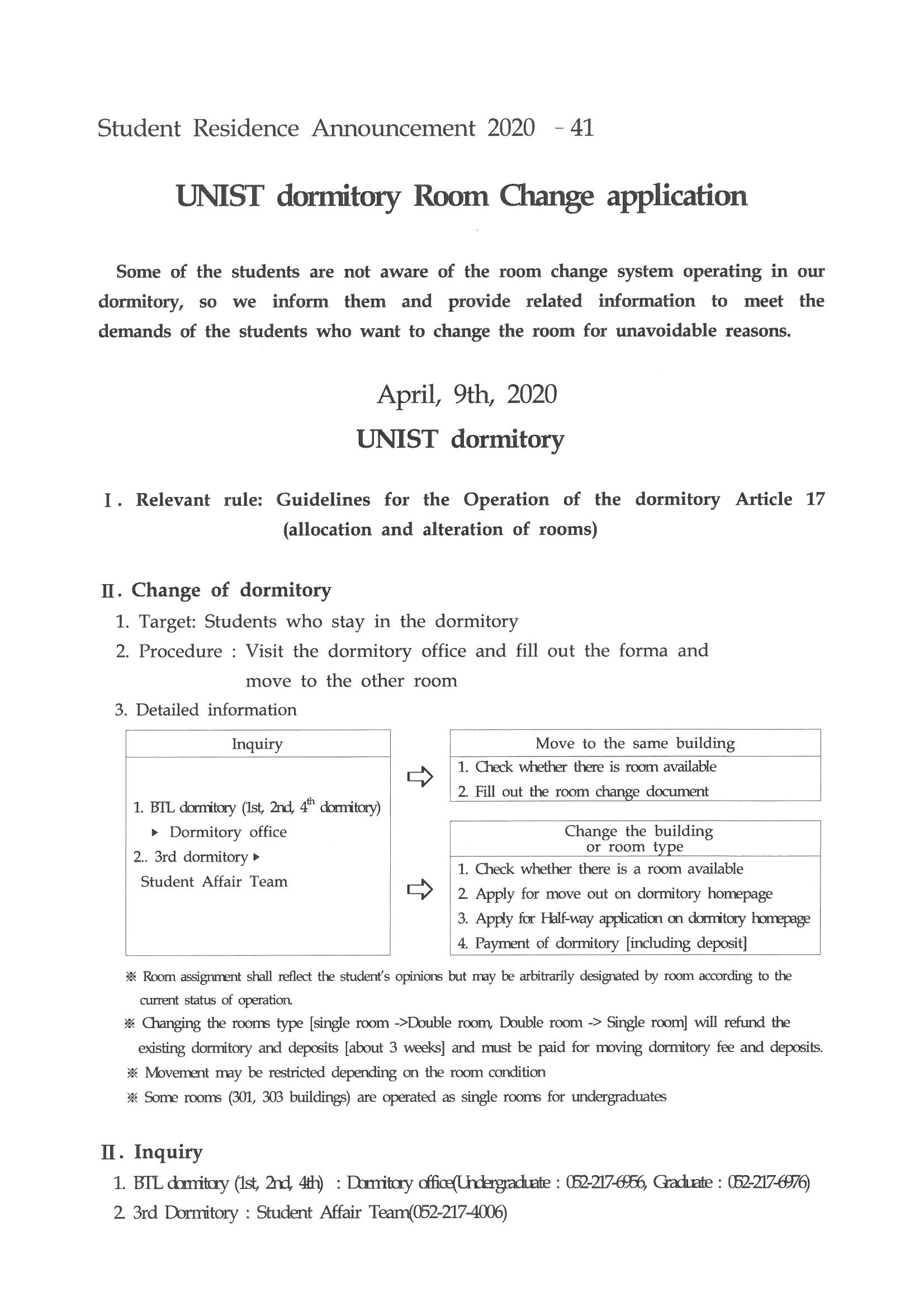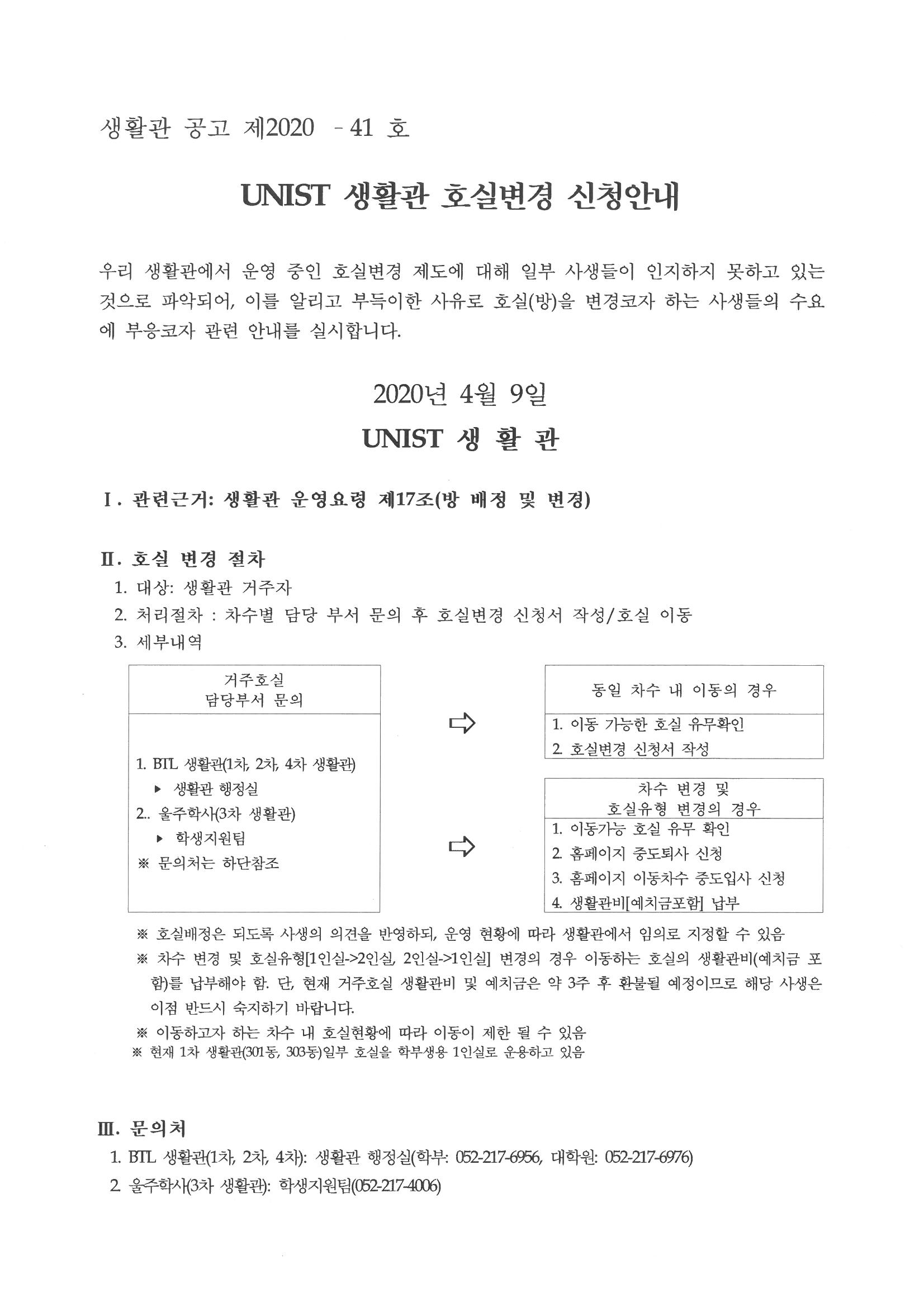 | 330 | (No.2020-41) UNIST 생활관 호실변경 신청안내(UNIST dormit.. | 2020-04-09 | 2169 |