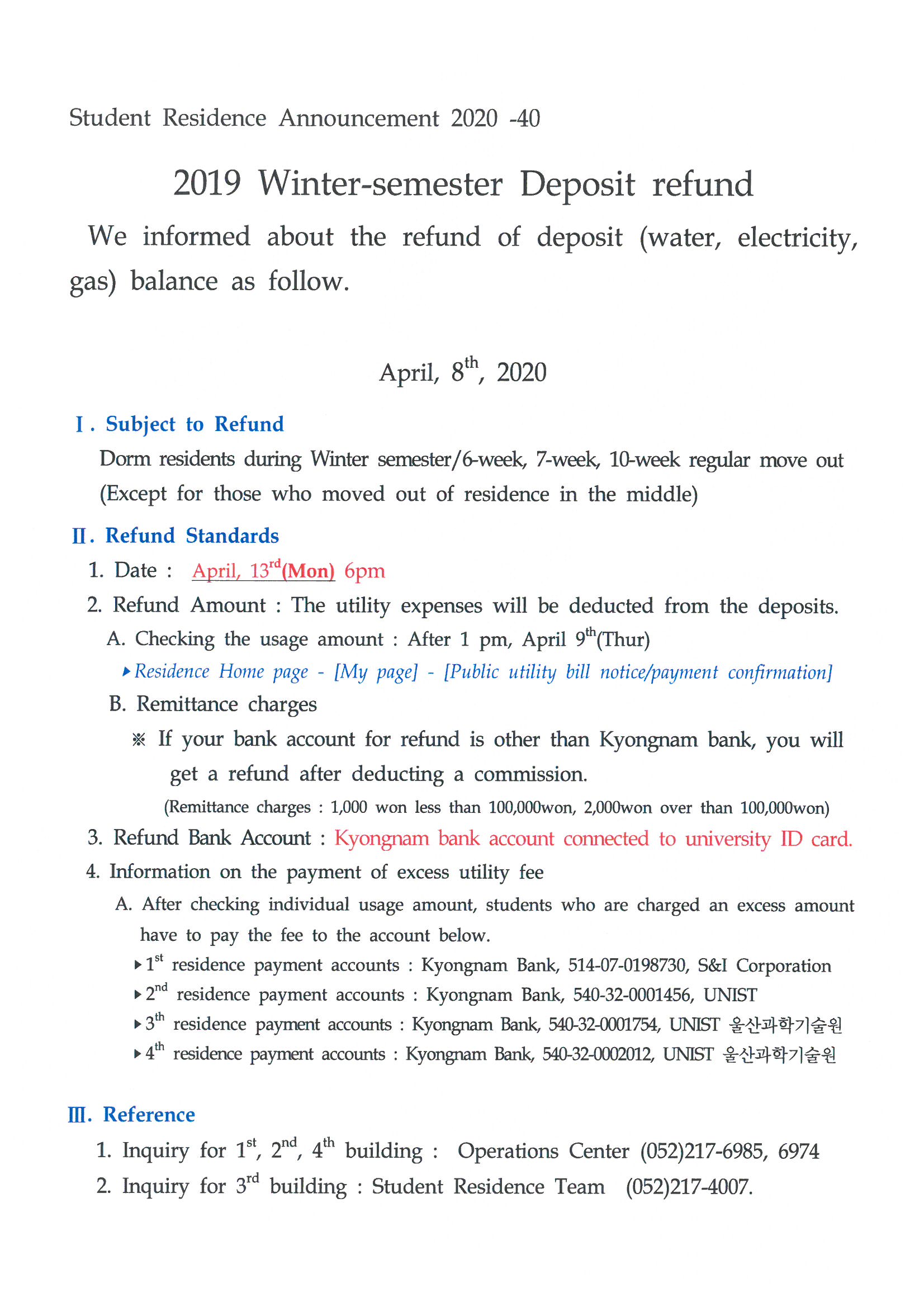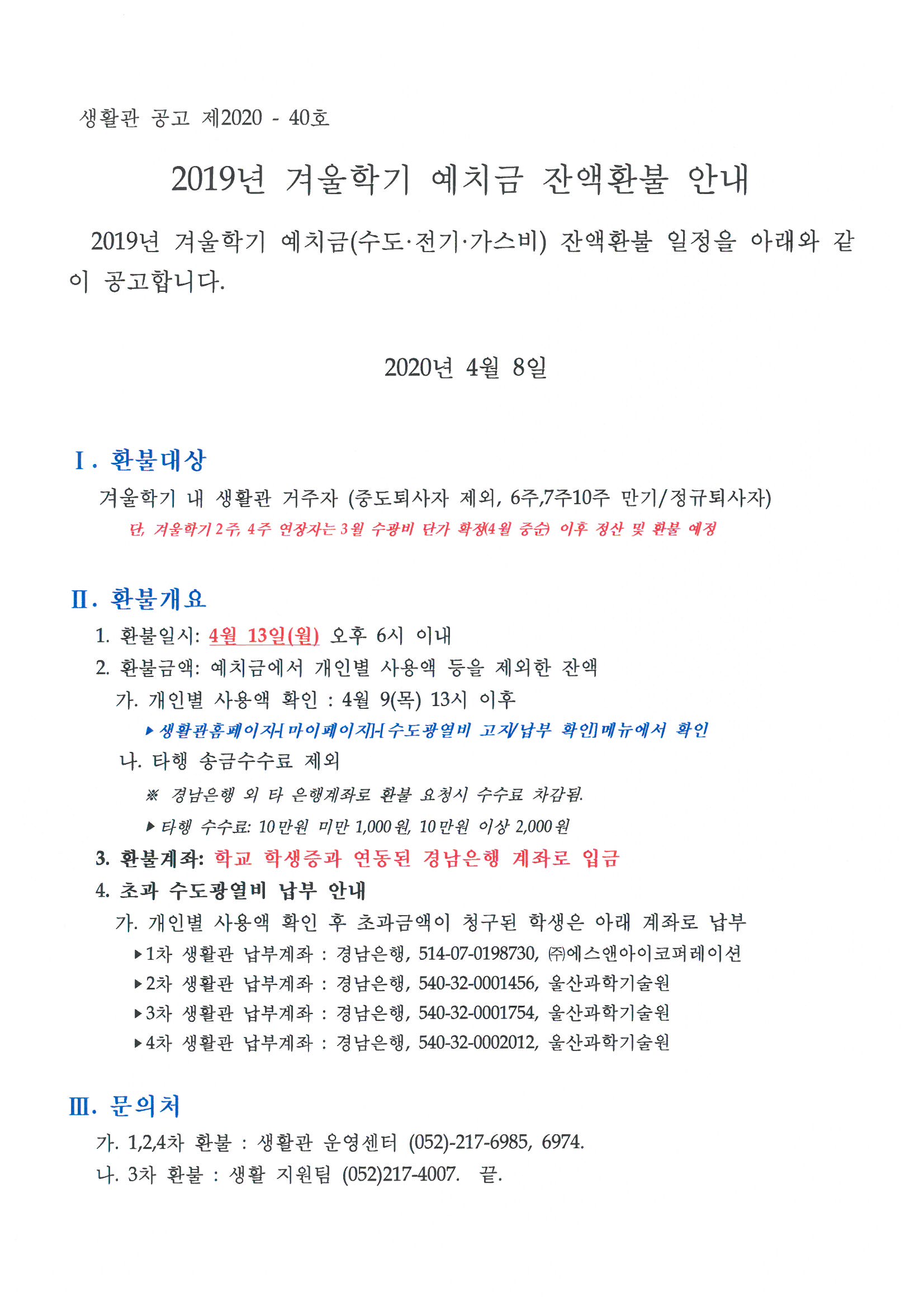 | 329 | (No.2020-40) 2019년 겨울학기 예치금 잔액환불 안내(2019 W.. | 2020-04-08 | 2384 |