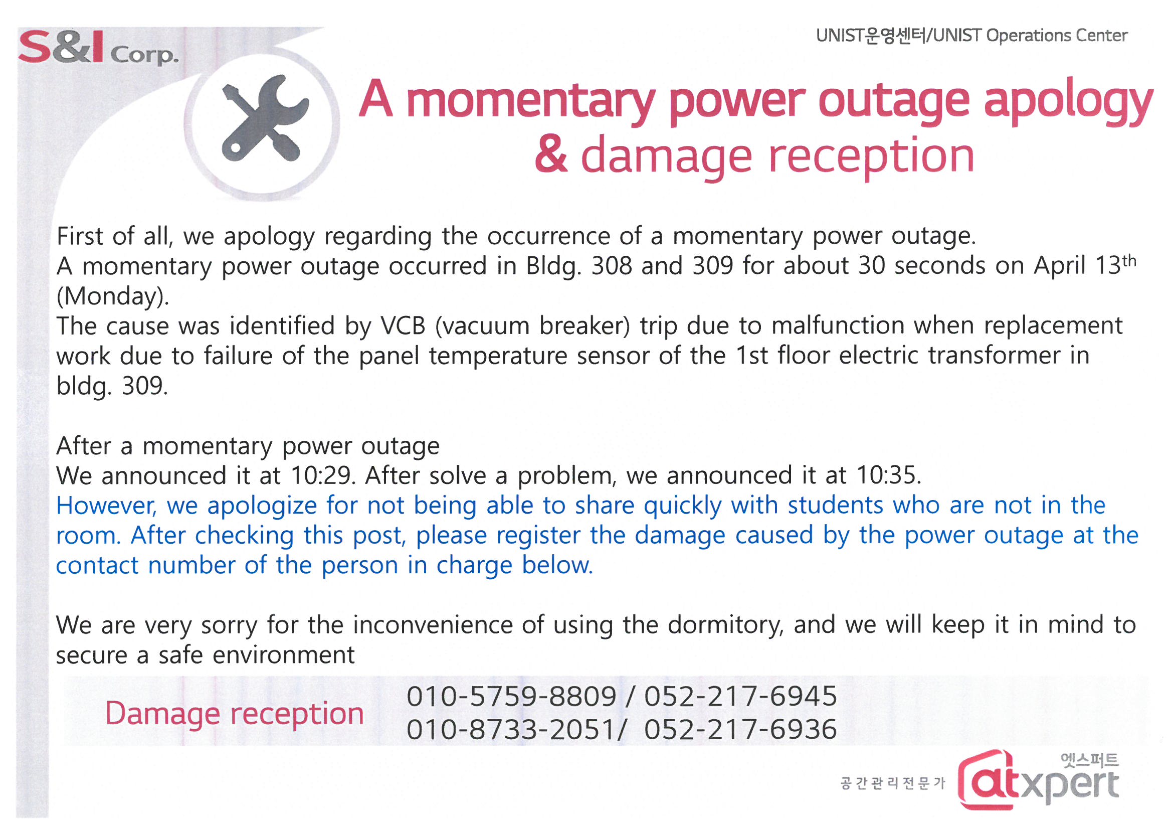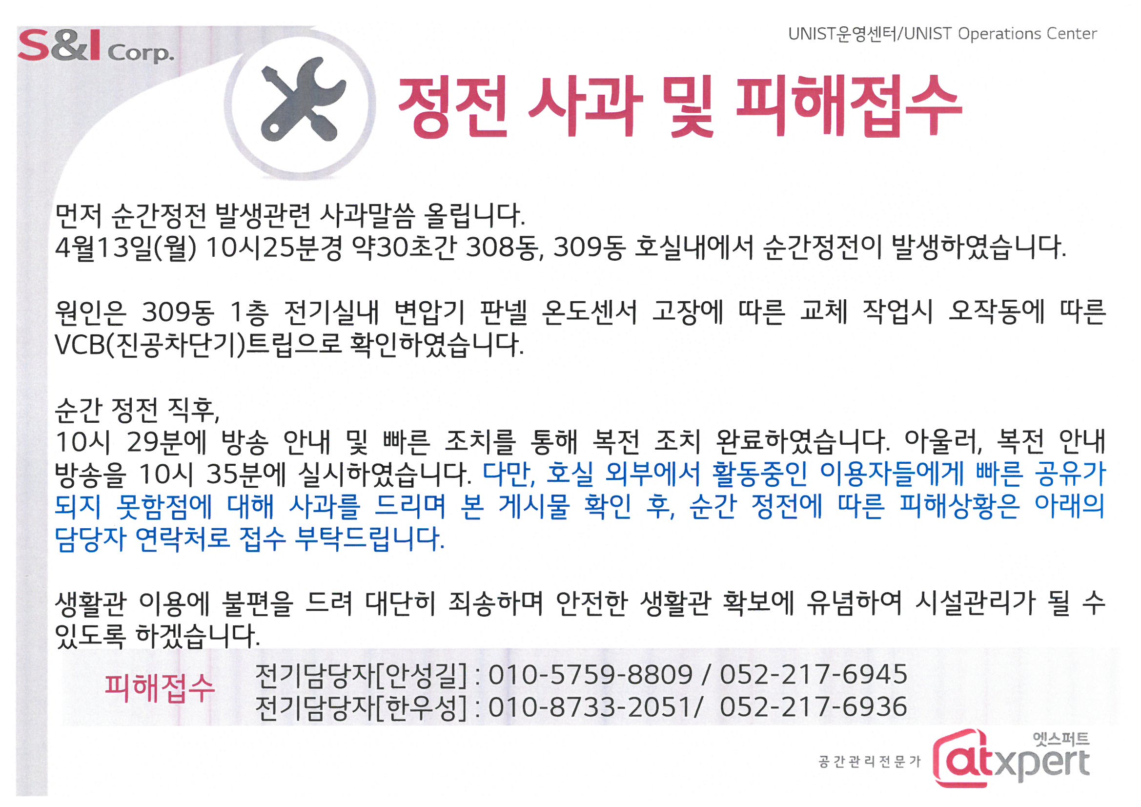 | 331 | 4차생활관 정전 사과 및 피해접수(A momentary power outage.. | 2020-04-14 | 2155 |