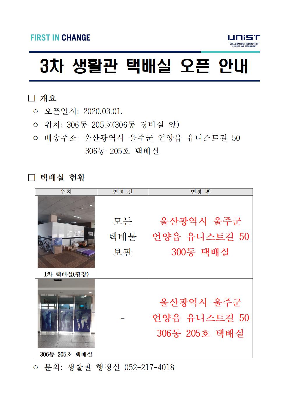 | 302 | 3차 생활관 택배실 오픈 안내(3rd Dormitory parcel storage.. | 2020-02-28 | 2871 |