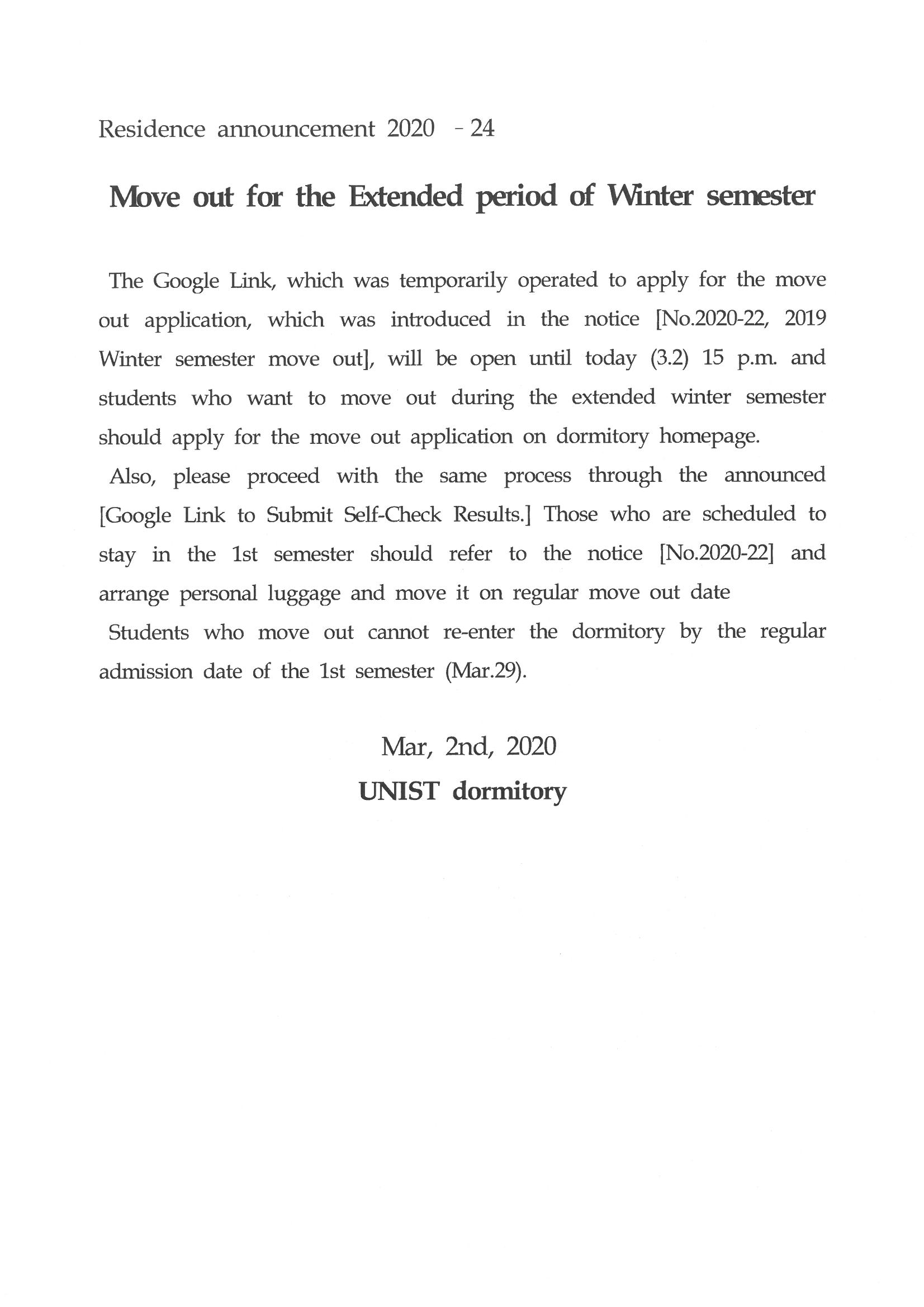 | 305 | (No.2020-24) 생활관 겨울학기 연장기간 중도퇴사 안내 | 2020-03-02 | 2387 |